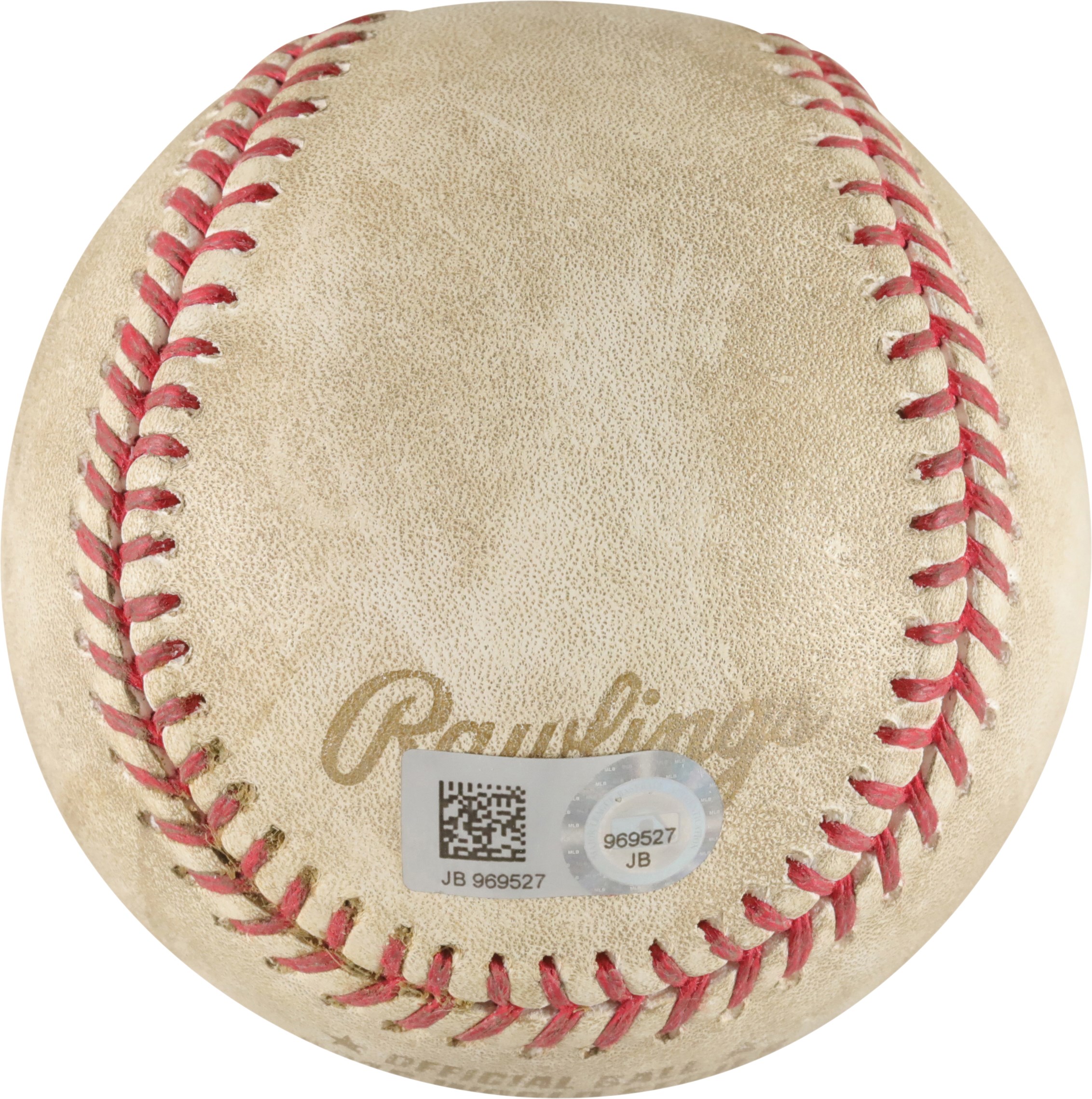 The baseball offered here was a pitch in the dirt, thrown by Kyle Hendricks to Carlos Santana in the 5th inning of Game 3 of the 2016 World Series. The game took place on October 28, 2016 at Wrigley Field in Chicago. The Cleveland Indians shut out the home team Cubs 1-0 in a classic pitching duel. The Cubs would fight back and win the Series in 7 games, capturing their first World Series title since 1908. A MLB hologram sticker (JB969527) is attached to the ball.