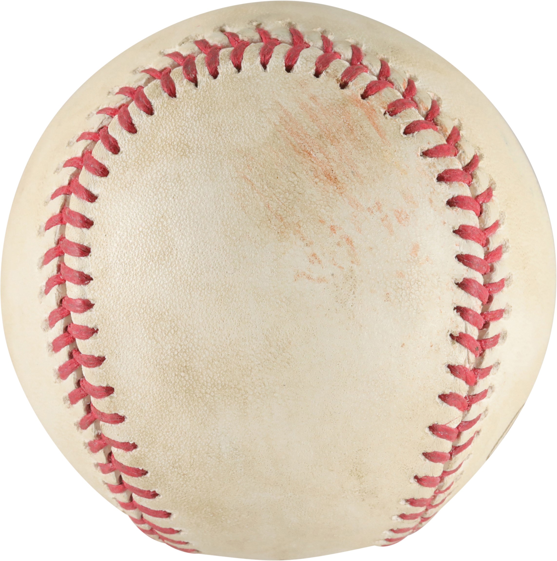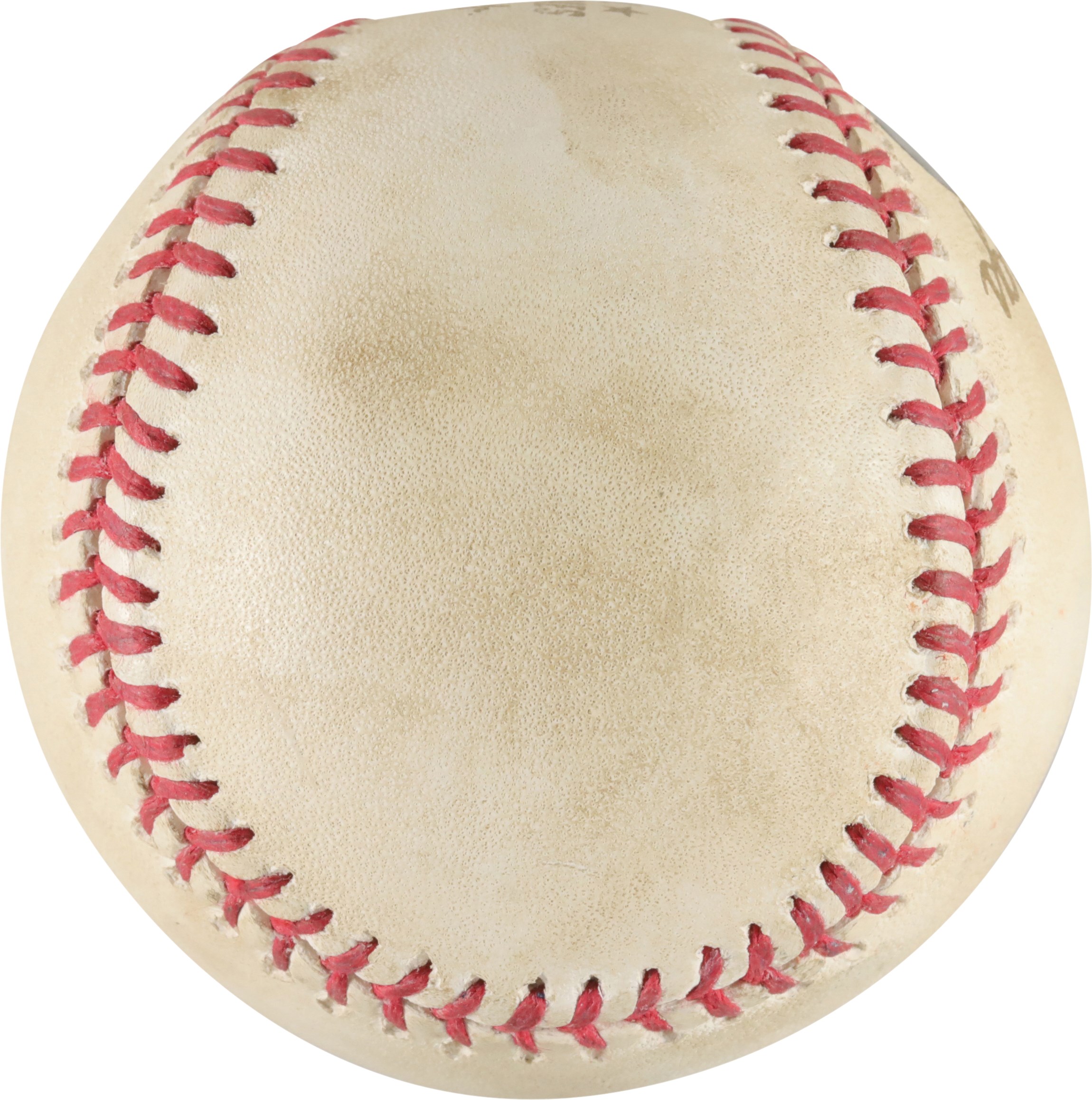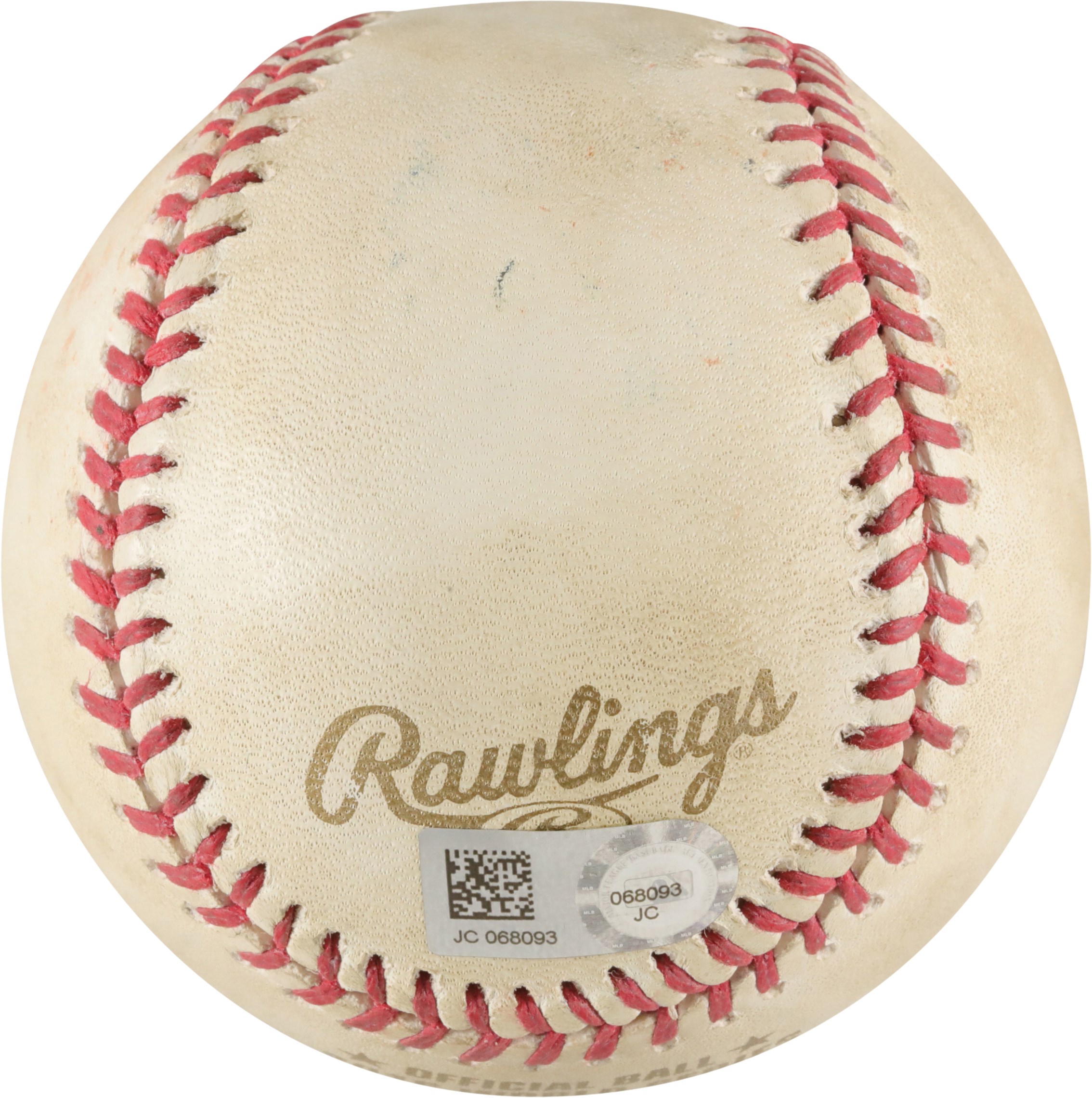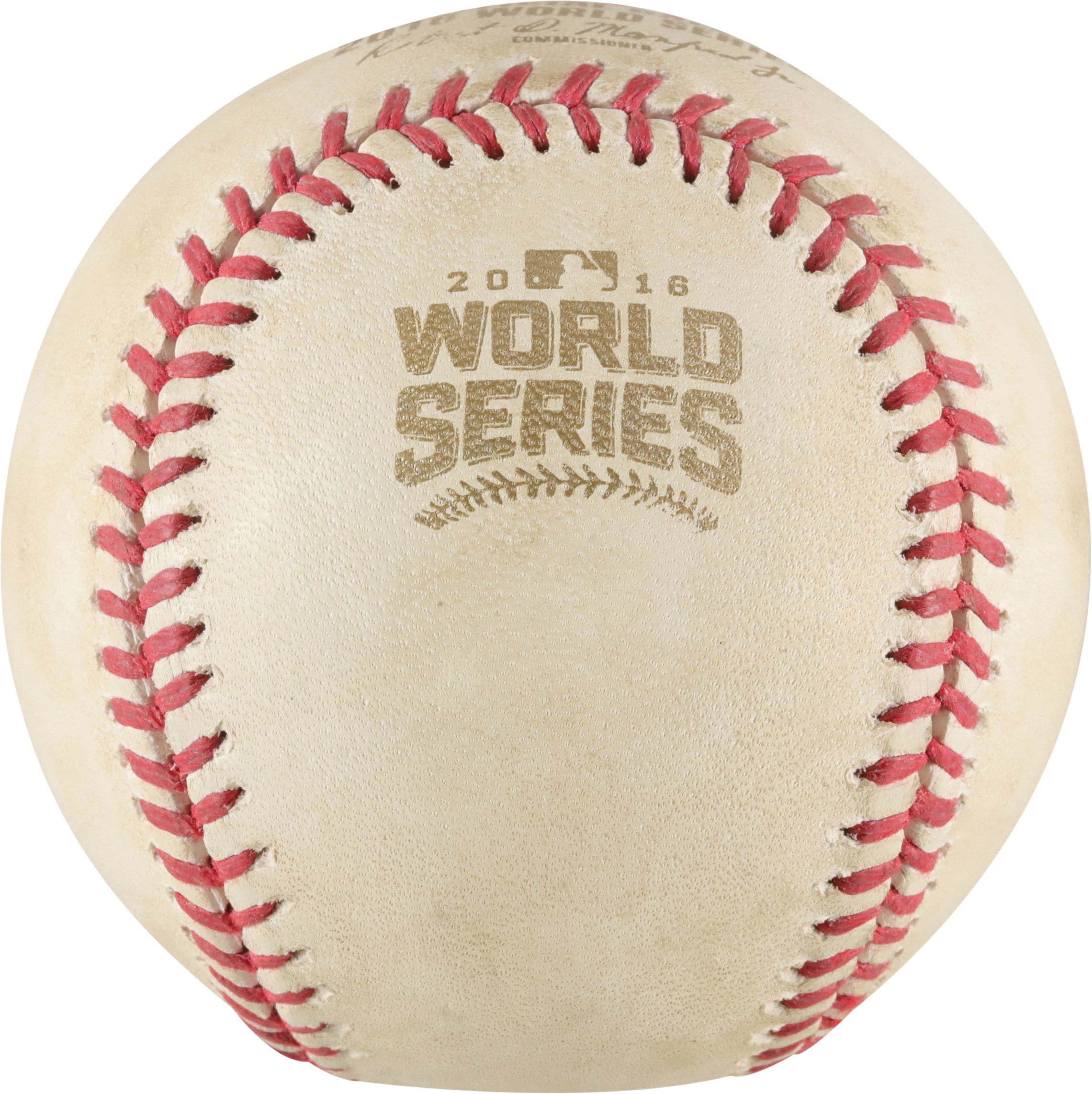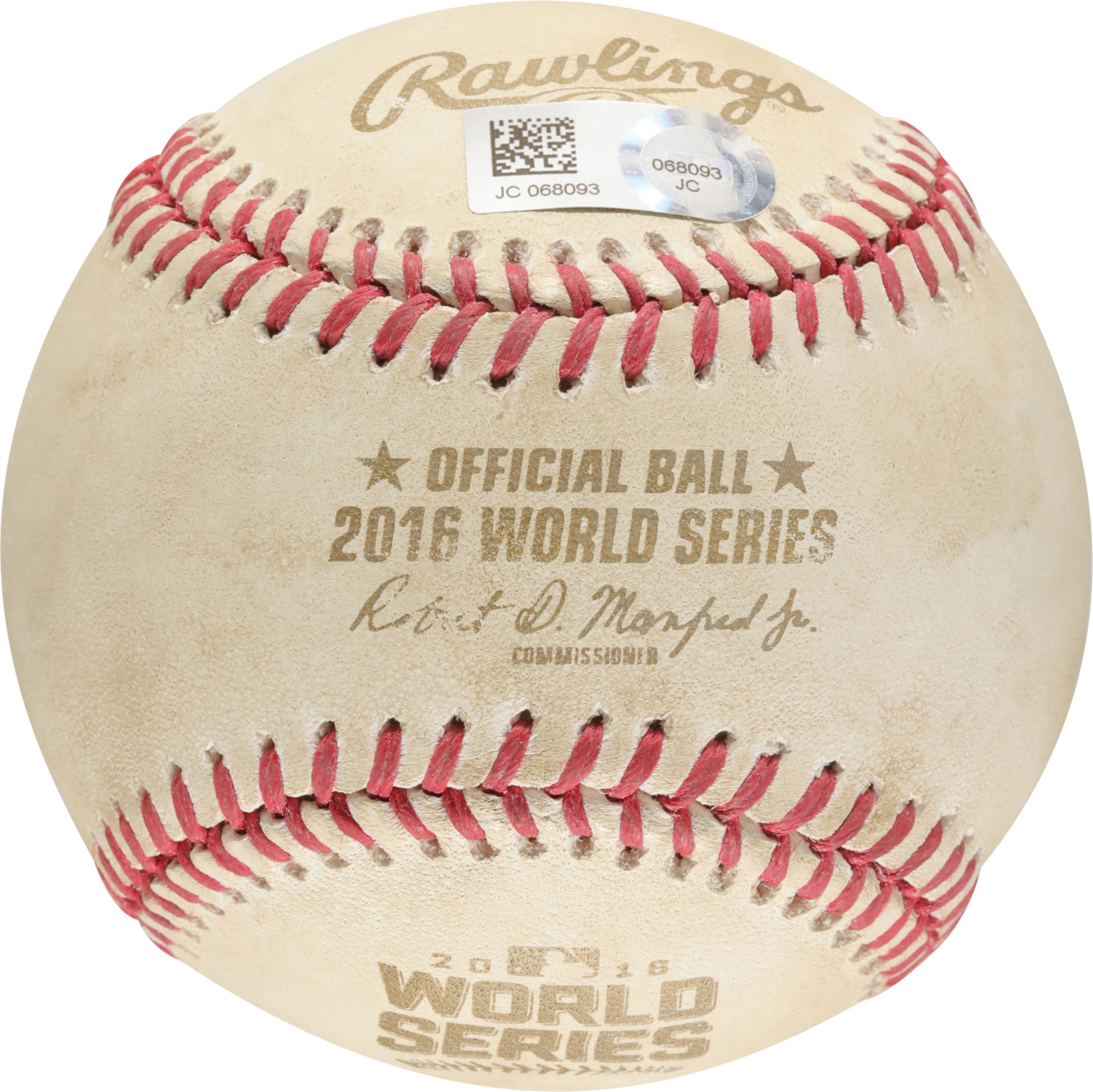 2016 World Series Game 6 game used baseball. This ball was pitched by Danny Salazar to Anthony Rizzo in the 5th inning of Game 6 of the 2016 World Series. Rizzo fouled off the pitch. The Chicago Cubs defeated the Cleveland Indians 9-3 in Game 6. A MLB hologram sticker (JC 068093) is attached to the ball.