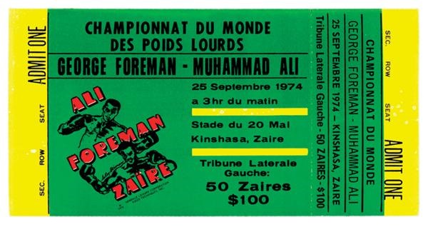 Proof of the most talked about heavyweight championship bout in the history of boxing, Muhammad Ali vs. George Foreman, the infamous Rumble in the Jungle. Taking place in Kinsasha, Zaire on September 25, 1974, the green and yellow ticket with French text features artwork by LeRoy Nieman. On the verso is a photo of President Mobuto Sese Seko of Zaire. Measures 3x6”, EX-MT.