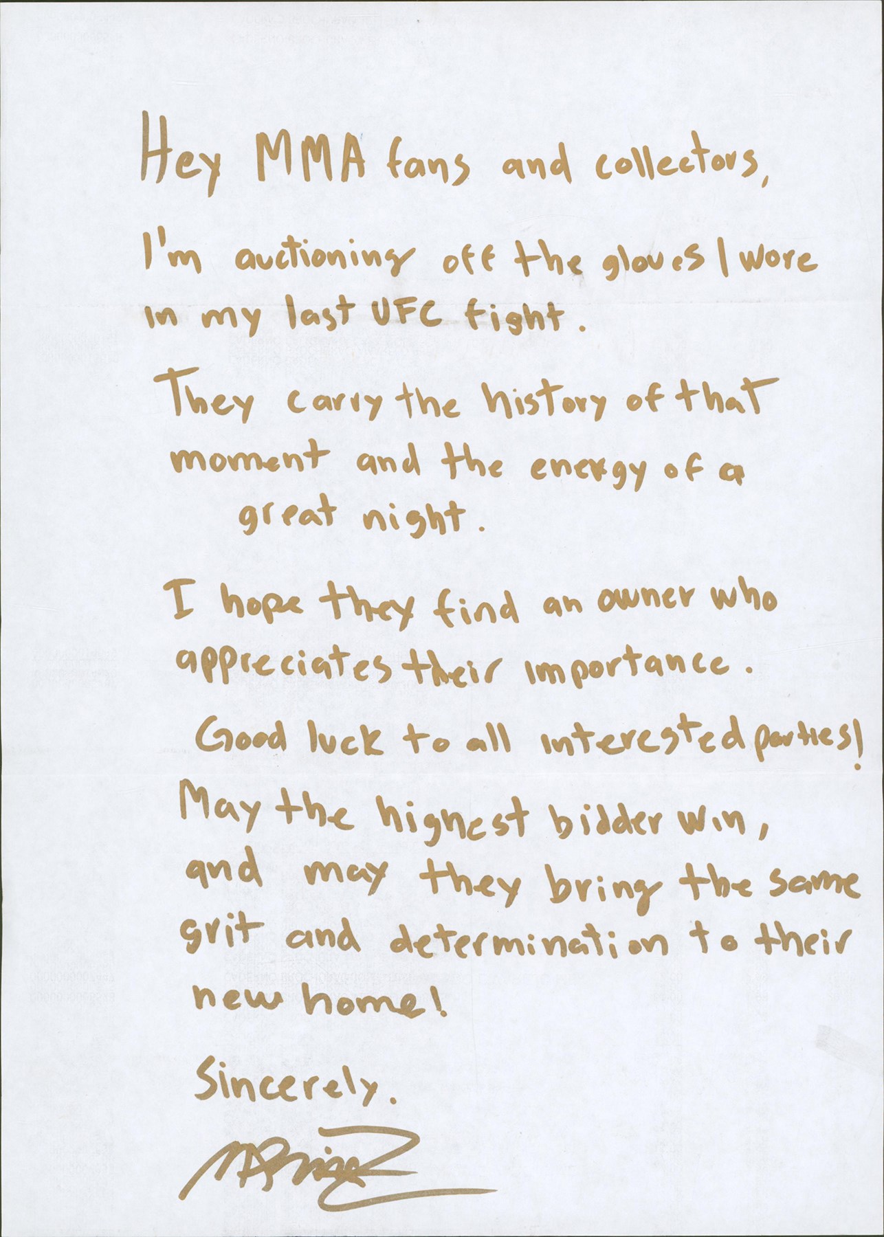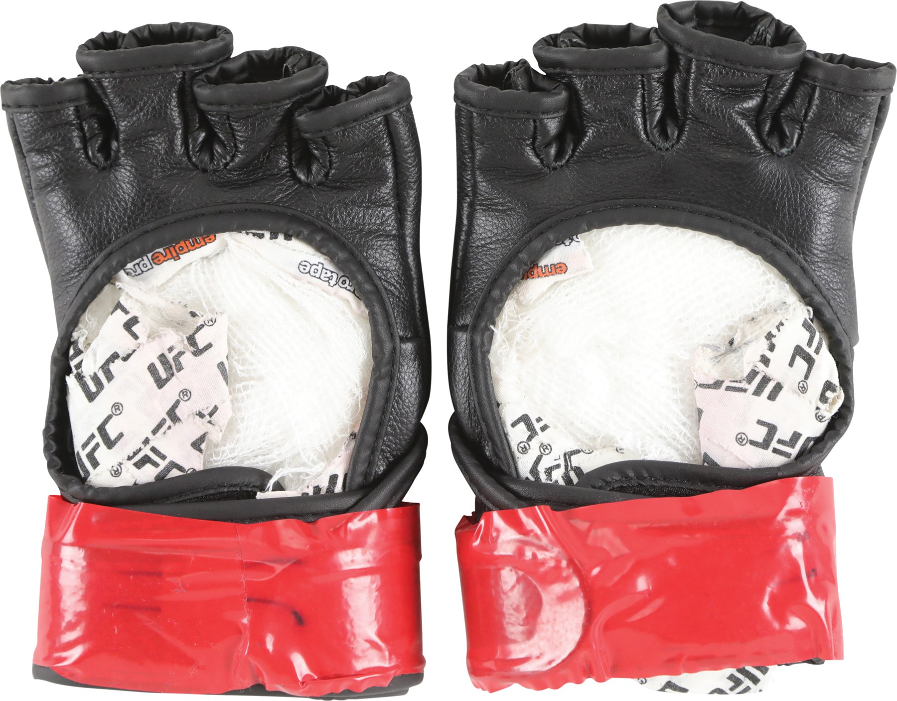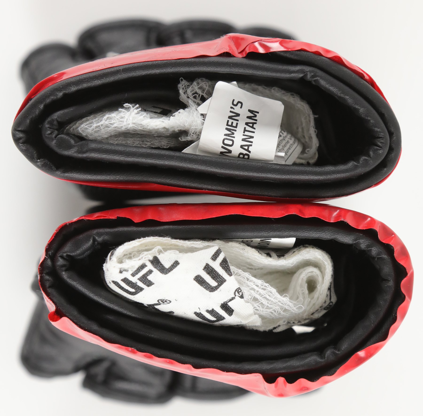 Marina Alcade Rodriguez wore these gloves during the final UFC fight of her career on May 3, 2025. Rodriguez fought Gillian Robertson in her final fight. She lost the fight via a technical knockout in the second round, and after the fight, she announced her retirement from mixed martial arts competition. These gloves are photo-matched to Getty Images image number 2213264942. "UFC" is printed on the outside of the black leather gloves, and the wrists are taped with red tape. Original white gauze is present inside of the gloves as well as white tape that includes the UFC logo in black. These one-of-a-kind gloves come directly from Rodriguez, and are accompanied by a handwritten letter. In the letter, Rodriguez wrote, "I'm auctioning off the gloves I wore in my last UFC fight. They carry the history of that moment and the energy of a great night." Rodriguez finished her stellar career with a 17-6-2 record. Proceeds of these gloves will be used for funding up-and-coming fighters at Rodriguez's gym in Brazil.