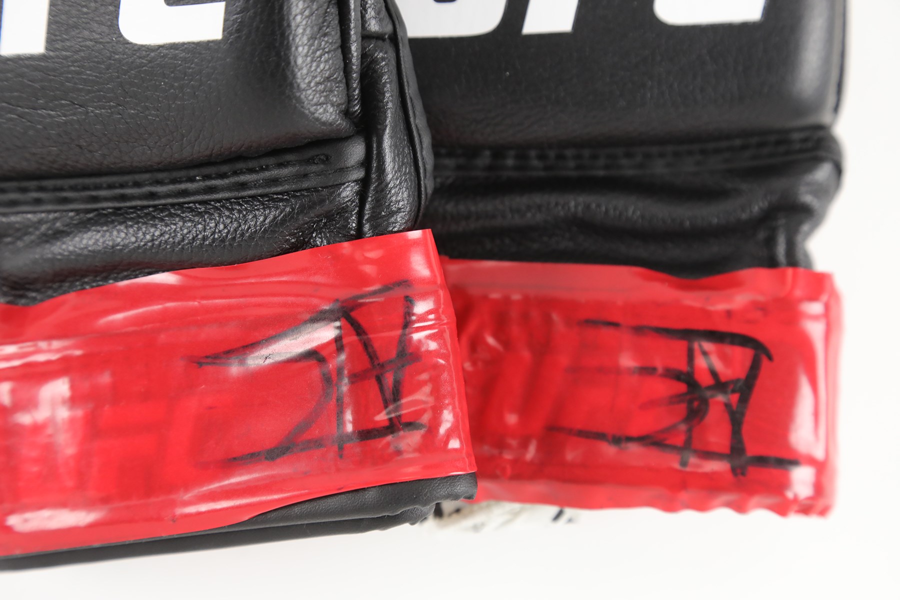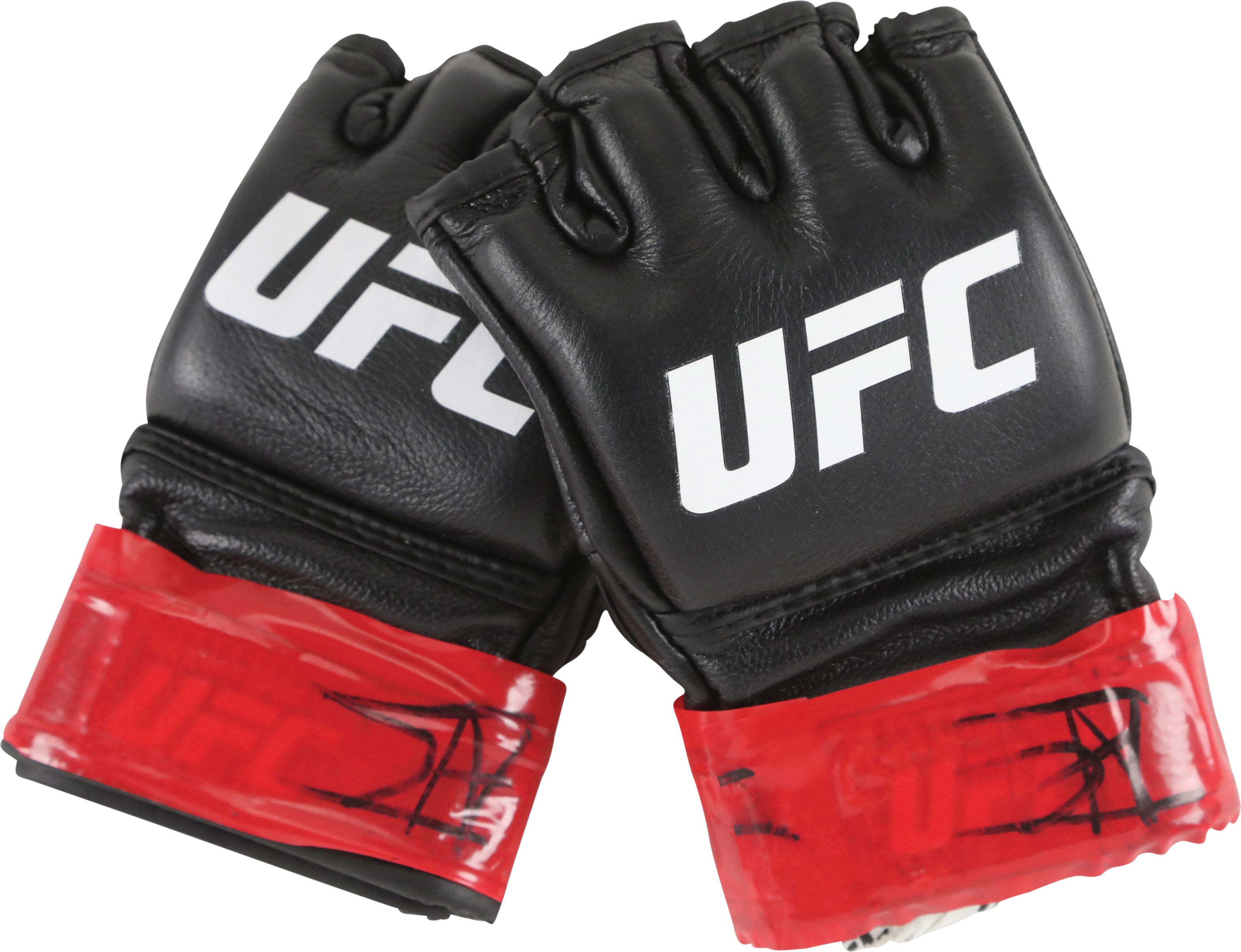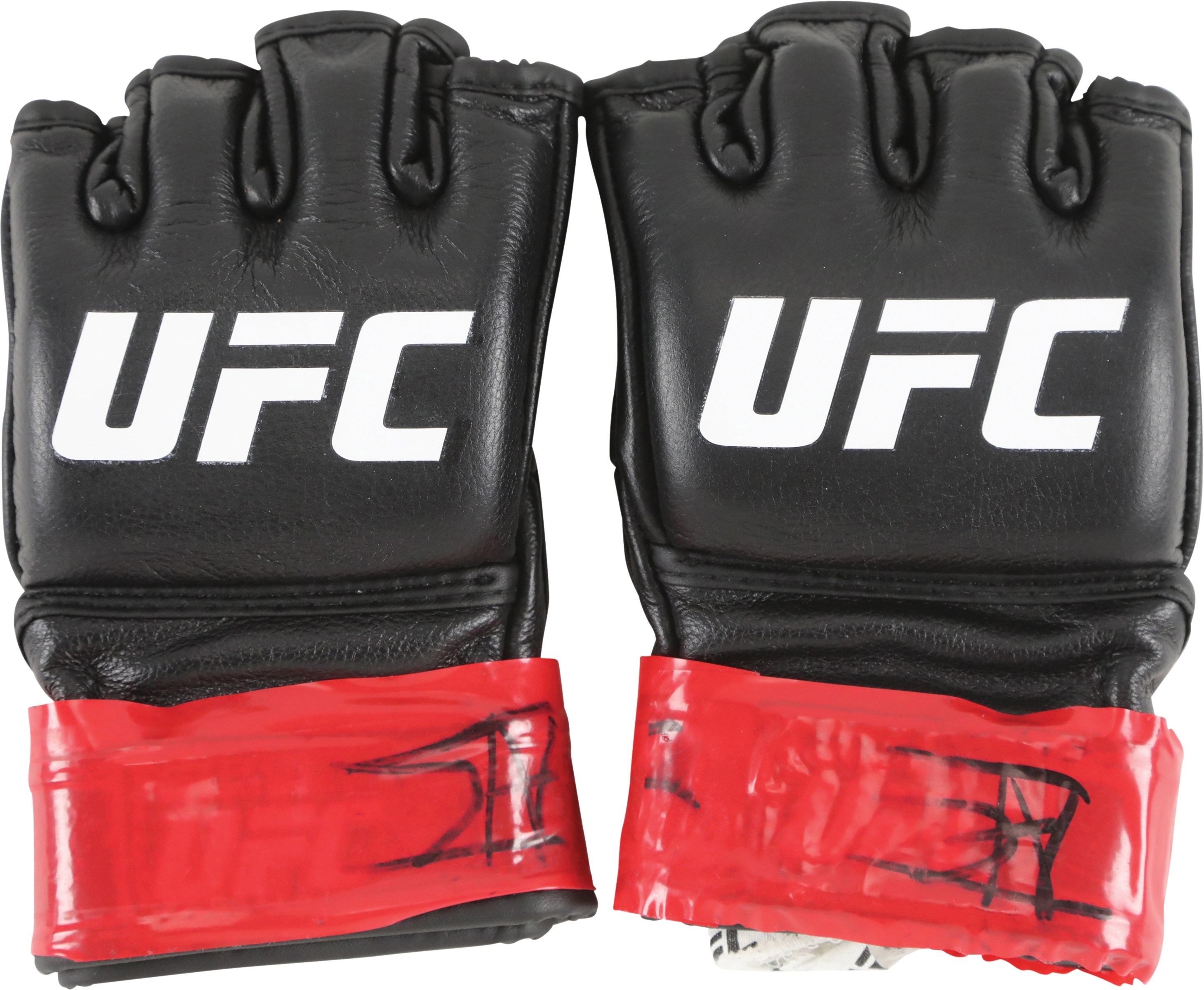 Marina Alcade Rodriguez wore these gloves during the final UFC fight of her career on May 3, 2025. Rodriguez fought Gillian Robertson in her final fight. She lost the fight via a technical knockout in the second round, and after the fight, she announced her retirement from mixed martial arts competition. These gloves are photo-matched to Getty Images image number 2213264942. "UFC" is printed on the outside of the black leather gloves, and the wrists are taped with red tape. Original white gauze is present inside of the gloves as well as white tape that includes the UFC logo in black. These one-of-a-kind gloves come directly from Rodriguez, and are accompanied by a handwritten letter. In the letter, Rodriguez wrote, "I'm auctioning off the gloves I wore in my last UFC fight. They carry the history of that moment and the energy of a great night." Rodriguez finished her stellar career with a 17-6-2 record. Proceeds of these gloves will be used for funding up-and-coming fighters at Rodriguez's gym in Brazil.