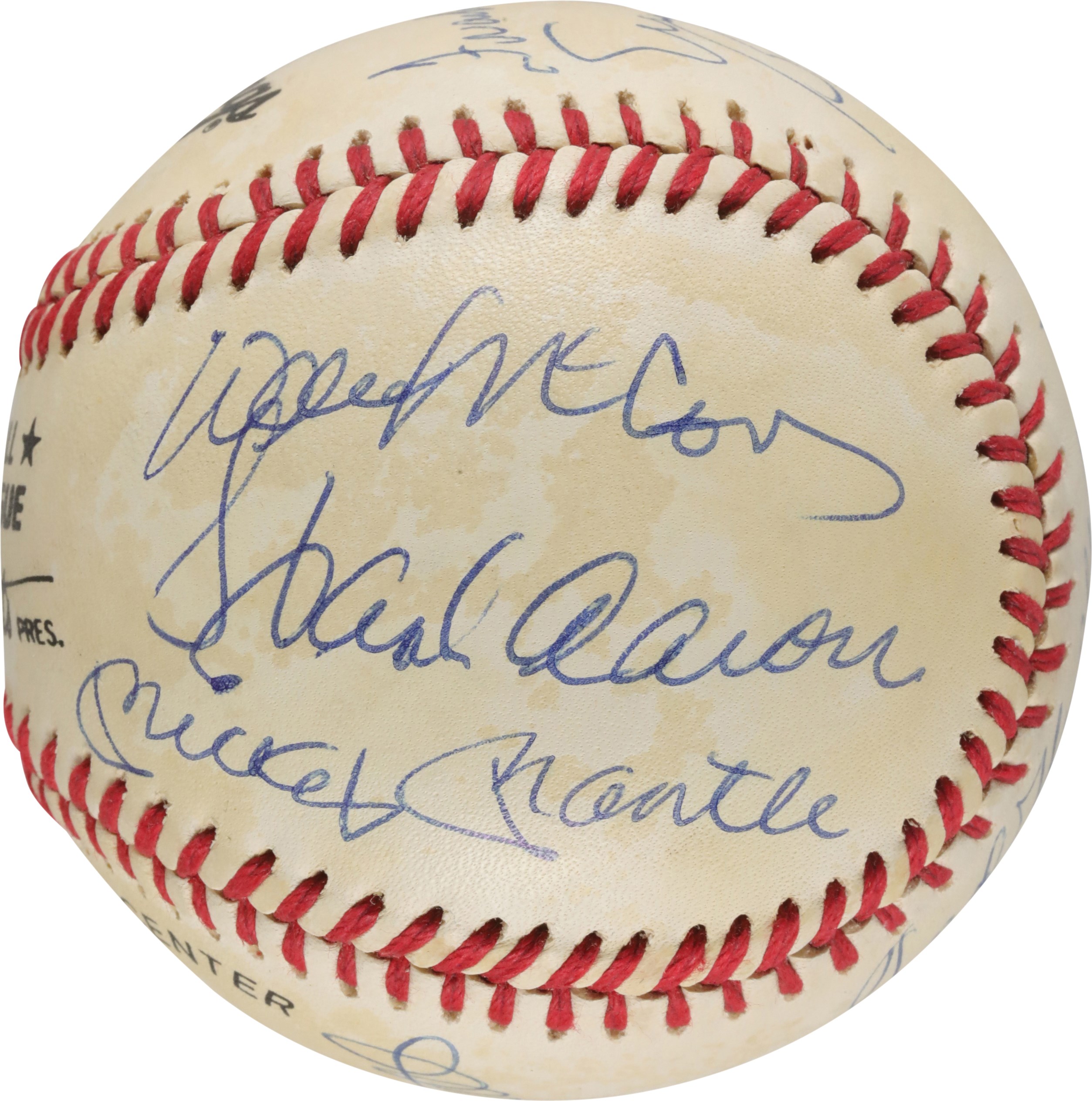 Official National League (Giamatti) baseball signed by the following eleven members of baseball's elite 500 Home Run Club: Ted Williams (sweet spot), Willie Mays (sweet spot), Mickey Mantle, Hank Aaron, Willie McCovey, Reggie Jackson, Harmon Killebrew, Eddie Mathews, Mike Schmidt, Frank Robinson, and Ernie Banks. All the signatures have been scripted in blue ink, except for Mays (black ink), and average 9/10 in grade. The ball displays light, scattered age toning and is otherwise in Near Mint condition. Full LOA from PSA.