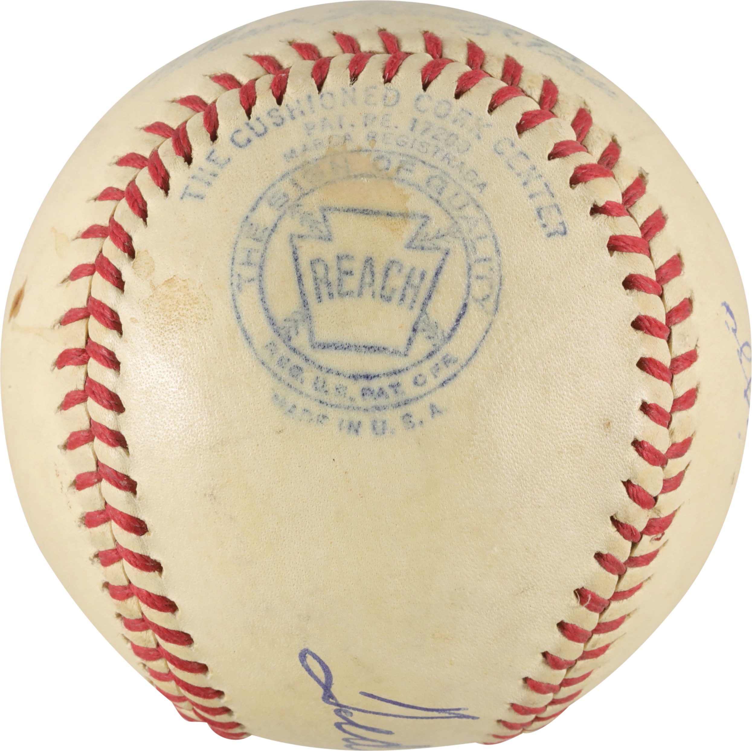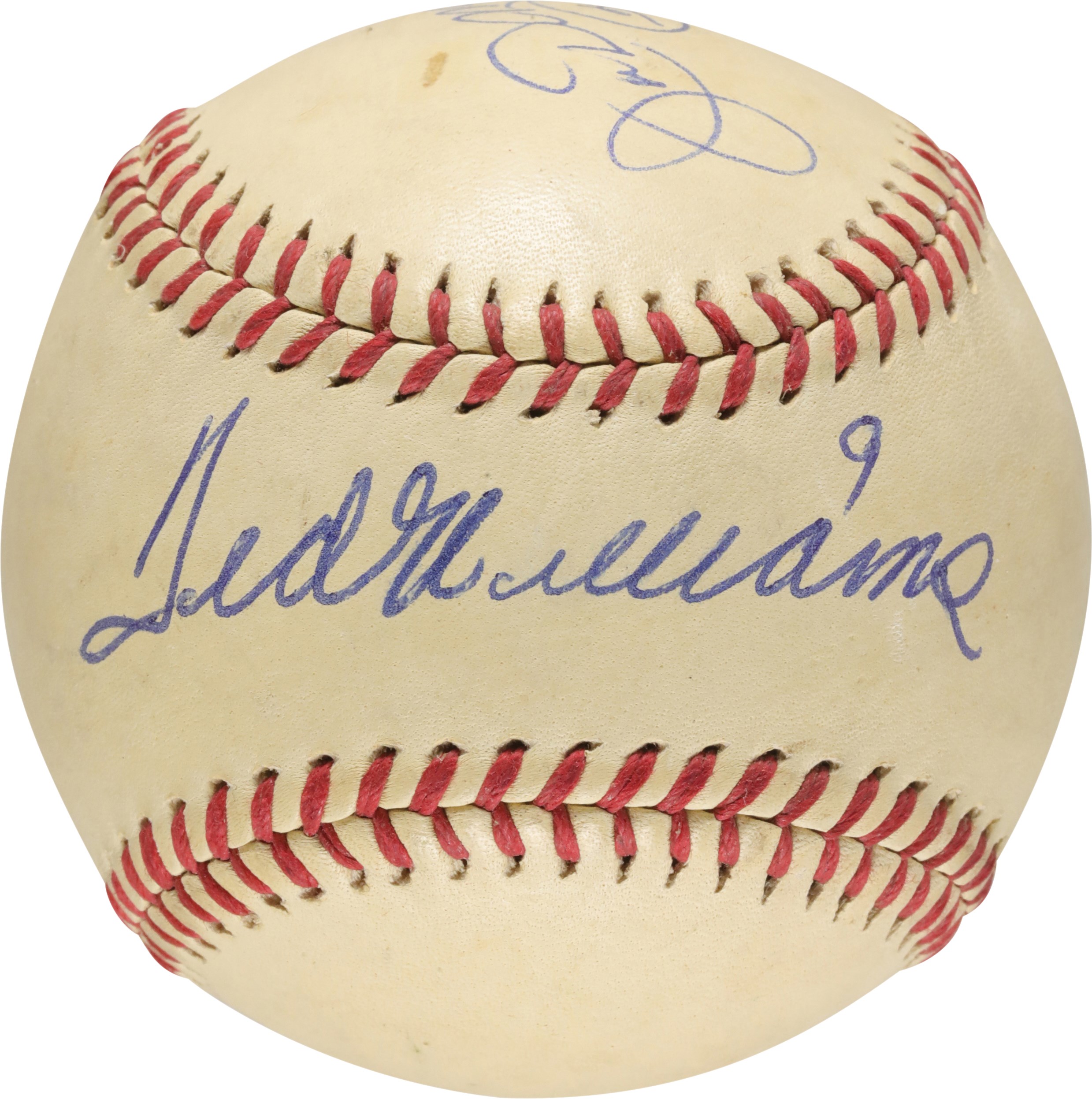 Official American League (Harridge) baseball signed in blue ink by Hall of Fame outfielders Ted Williams and Joe DiMaggio. In addition to the scarce pairing of signatures on a baseball, each player has also added his uniform number either above or below his signature. Williams' signature (9/10) occupies the sweet spot, while DiMaggio's signature (8/10) appears on the panel directly above. The ball displays light soiling, as well as a few small blemishes. Very Good to Excellent condition overall. This ball dates to the 1943-1947 manufacturing period; however, it appears to have been signed by both players at a later date. Full LOA from PSA.