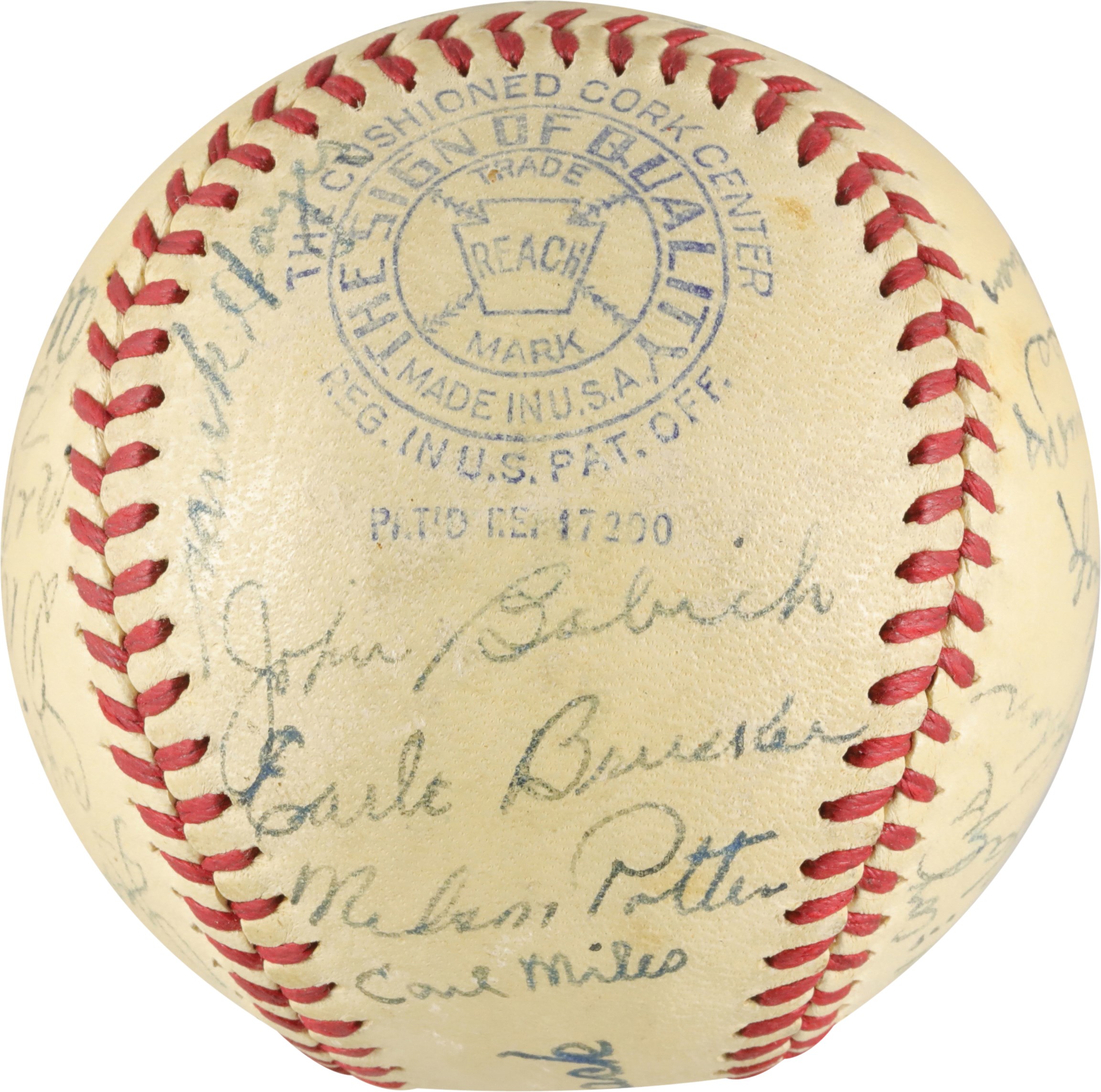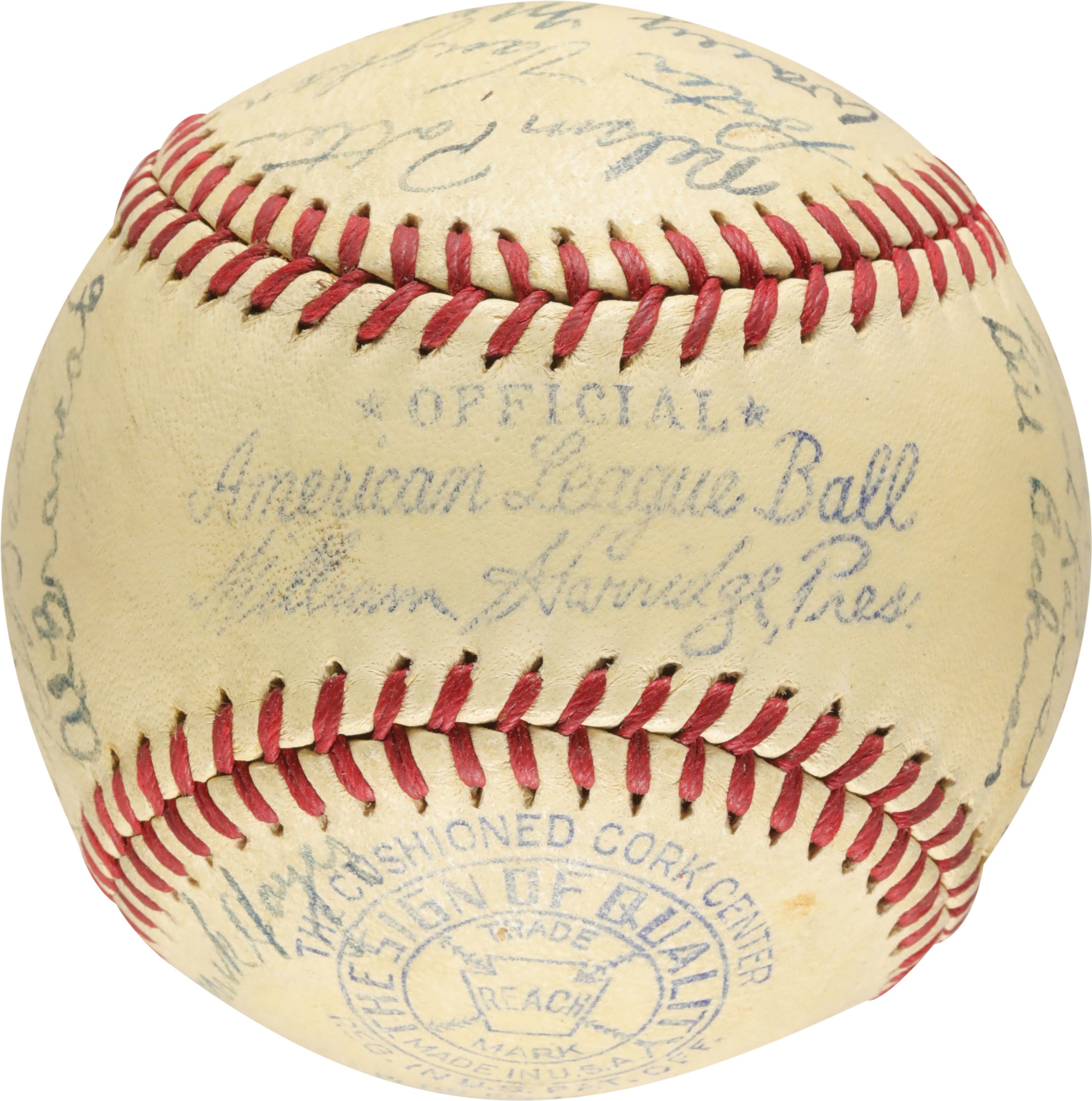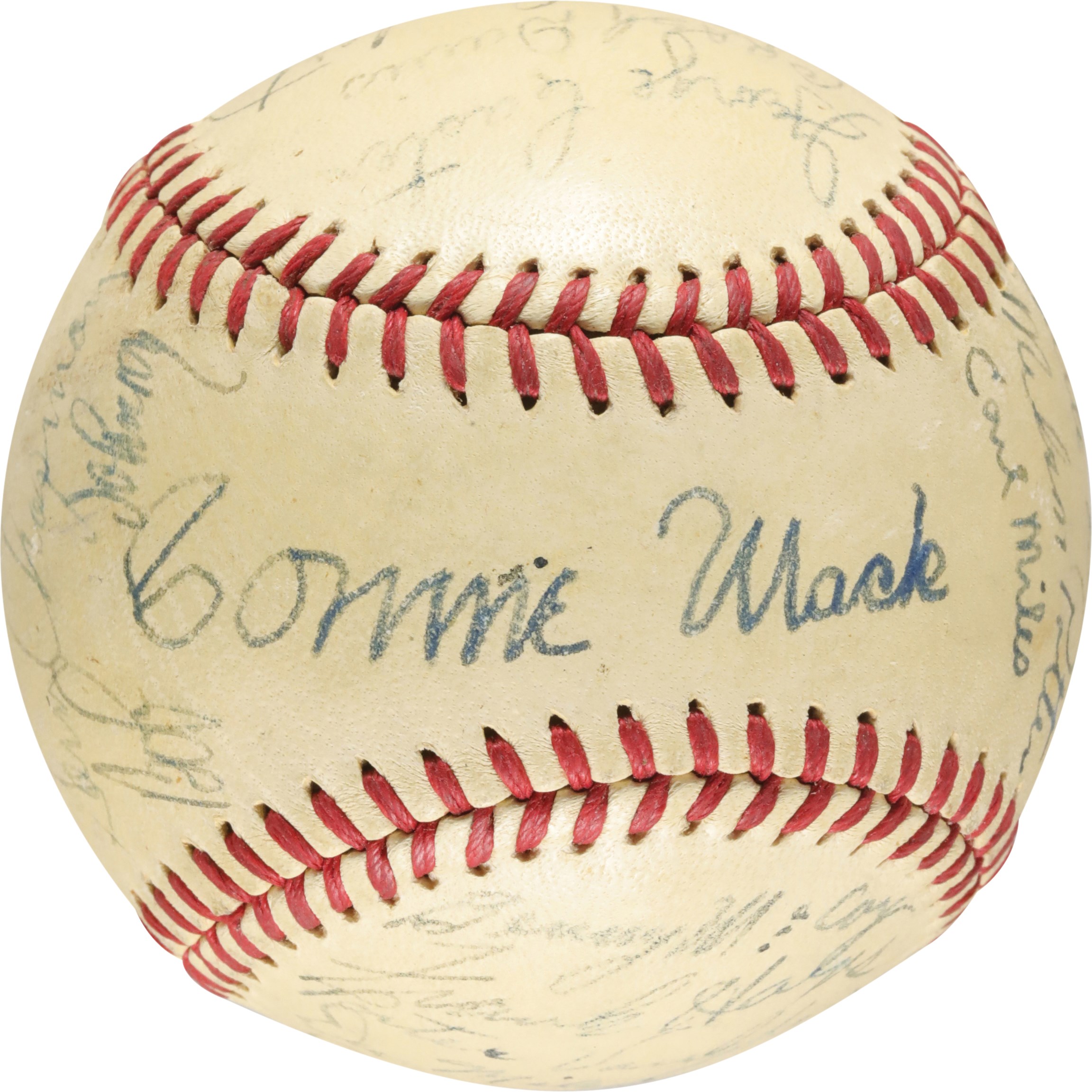 1940 Philadelphia Athletic team signed baseball. Connie Mack signed the sweet spot of this Official American League (Harridge) baseball. There are 25 other signatures on the ball, including, Carl Miles, Wally Moses, Al Simmons, Crash Davis, Dick Siebert, Nels Potter, John Babich, Al Brancato, and others. The baseball is in very good condition.