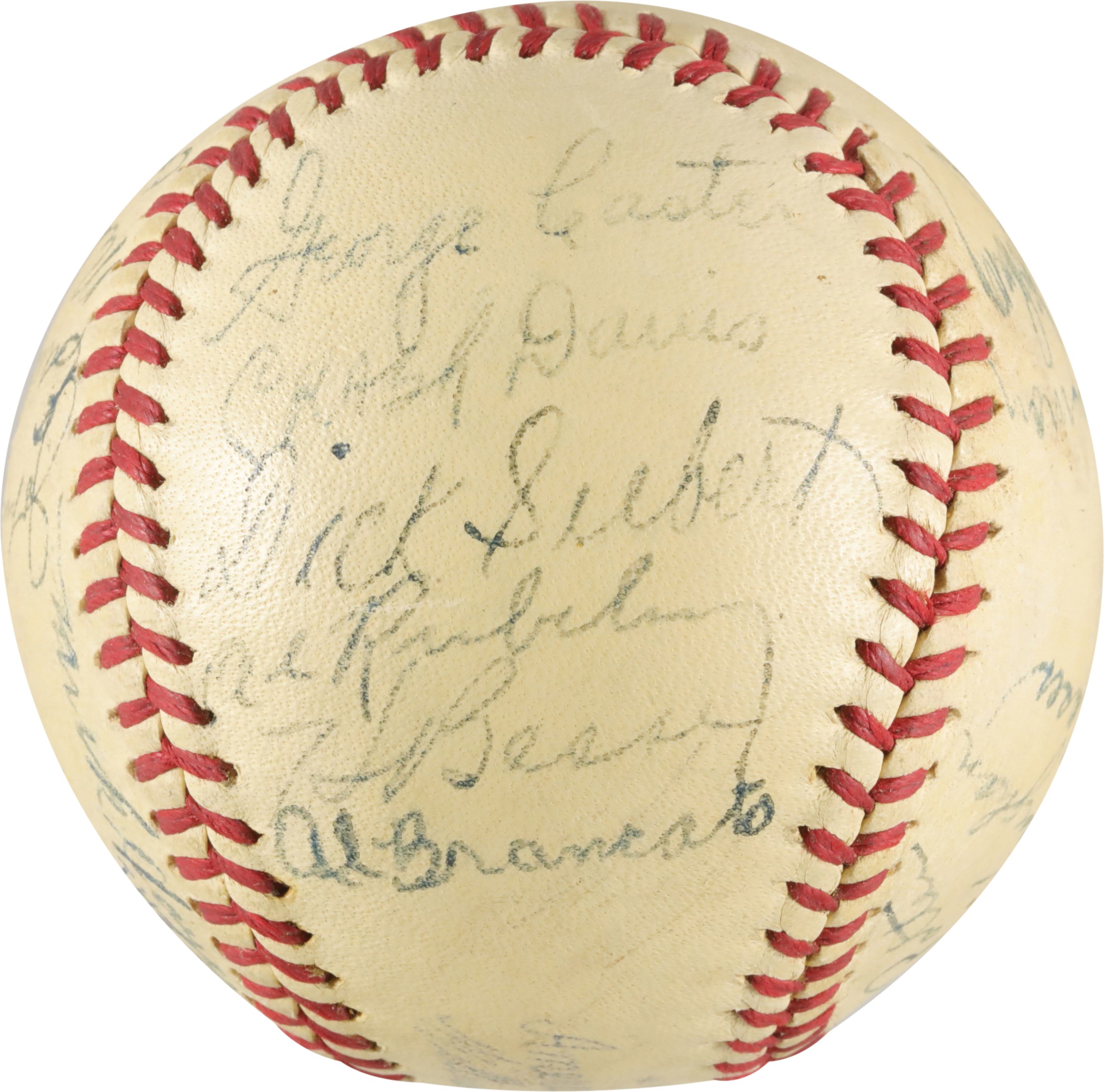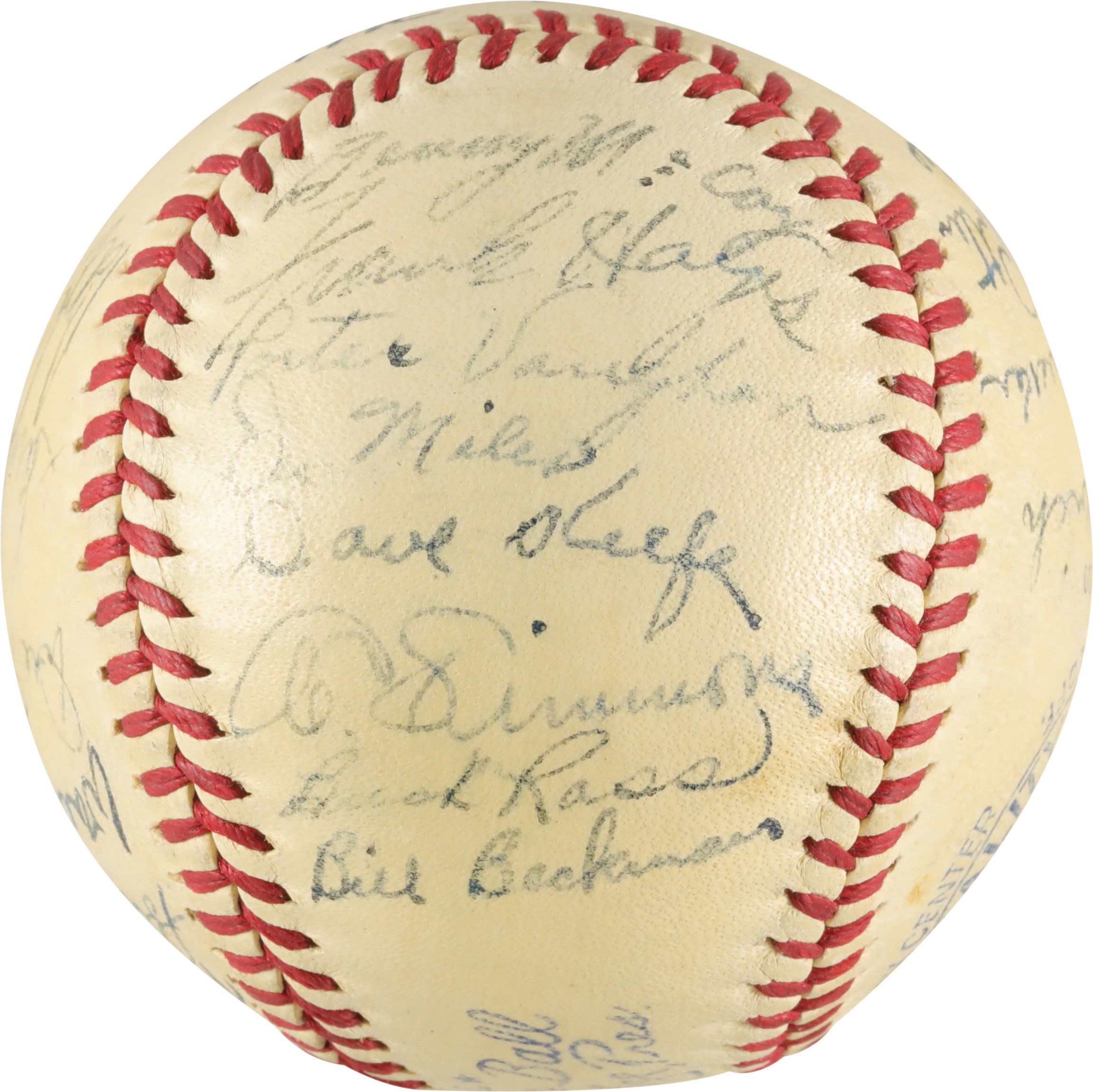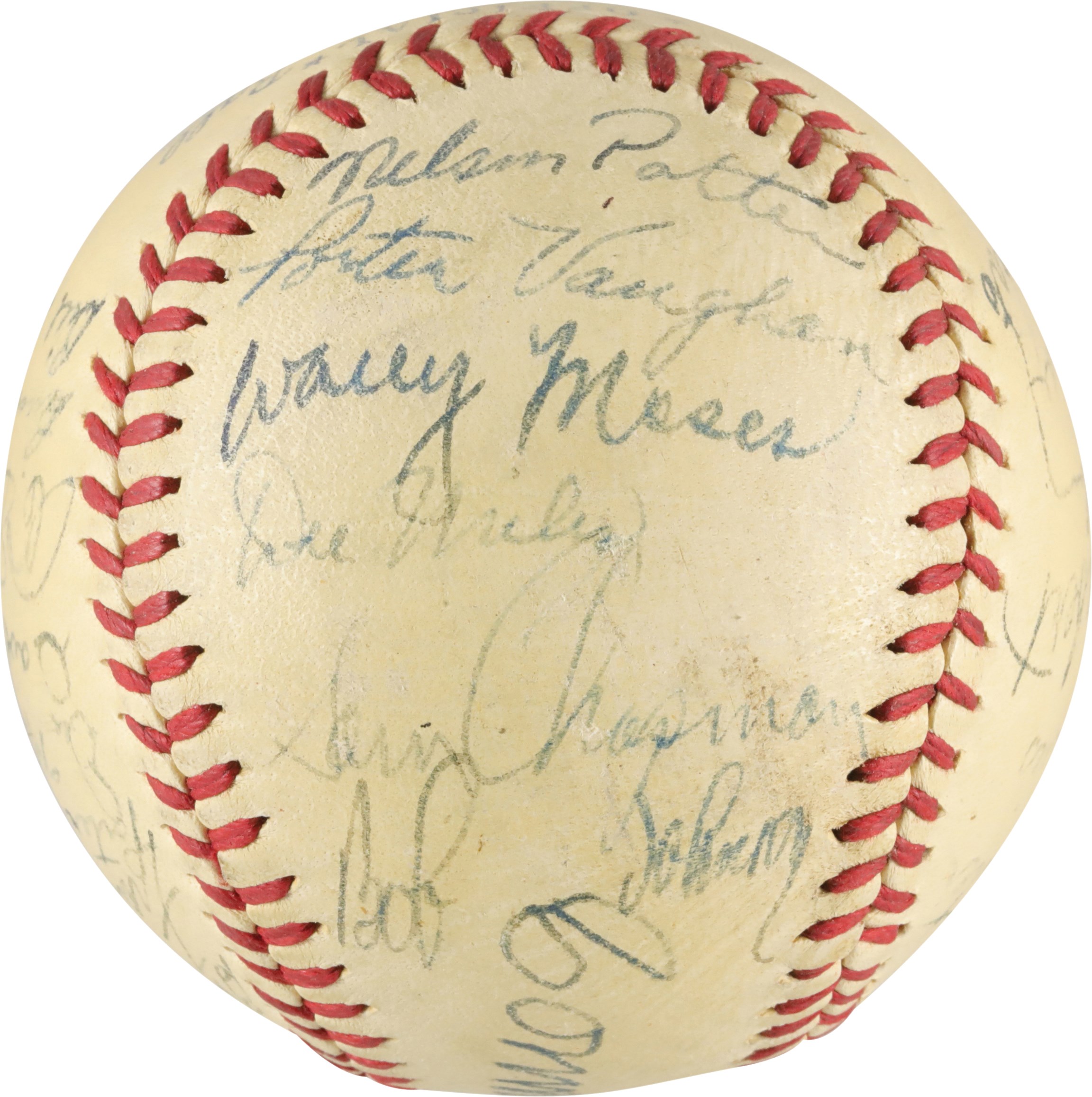 1940 Philadelphia Athletic team signed baseball. Connie Mack signed the sweet spot of this Official American League (Harridge) baseball. There are 25 other signatures on the ball, including, Carl Miles, Wally Moses, Al Simmons, Crash Davis, Dick Siebert, Nels Potter, John Babich, Al Brancato, and others. The baseball is in very good condition.