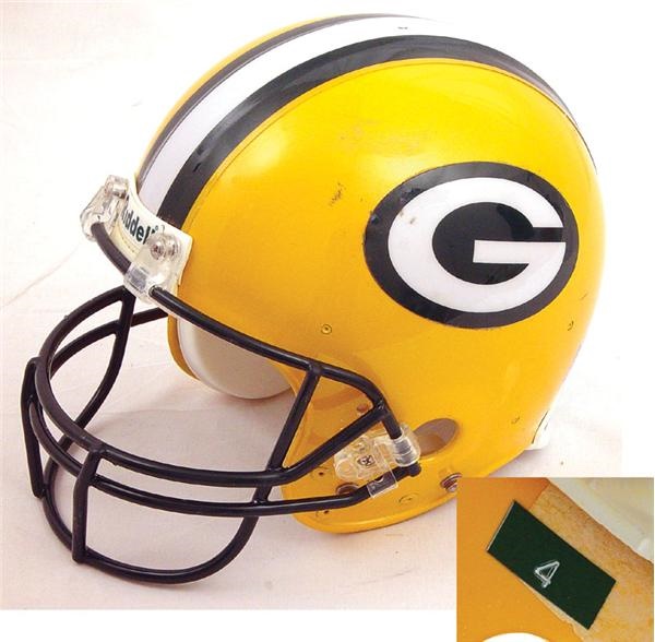 Continues to prove that he is the most accurate and consistent QB in the NFL. This yellow & green helmet is a fabulous helmet, not only because it belonged to a top-echelon quarterback who led Green Bay back to greatness and 2 straight Super Bowl appearances; a record 3-time consecutive MVP award winner who surpassed Dan Marino in recording six 30-TD seasons. But because this is the storied and historically important Green Bay Packers, who won the first two Super Bowls under Vince Lombardi, for whom the SB trophy is named, and whose origins date back to the late 19th century. Riddell helmet equipped with all the Green Bay furnishings: “G” decal on either side, “Packers” decaled onto the back plastic guard, and an American flag decal along with the official NFL decal. The leader of the pack’s #4 on dyno tape on the inside, by right ear hole. Nice use in the form of scrapes and turf stains. Obtained from an NFL equipment manager.