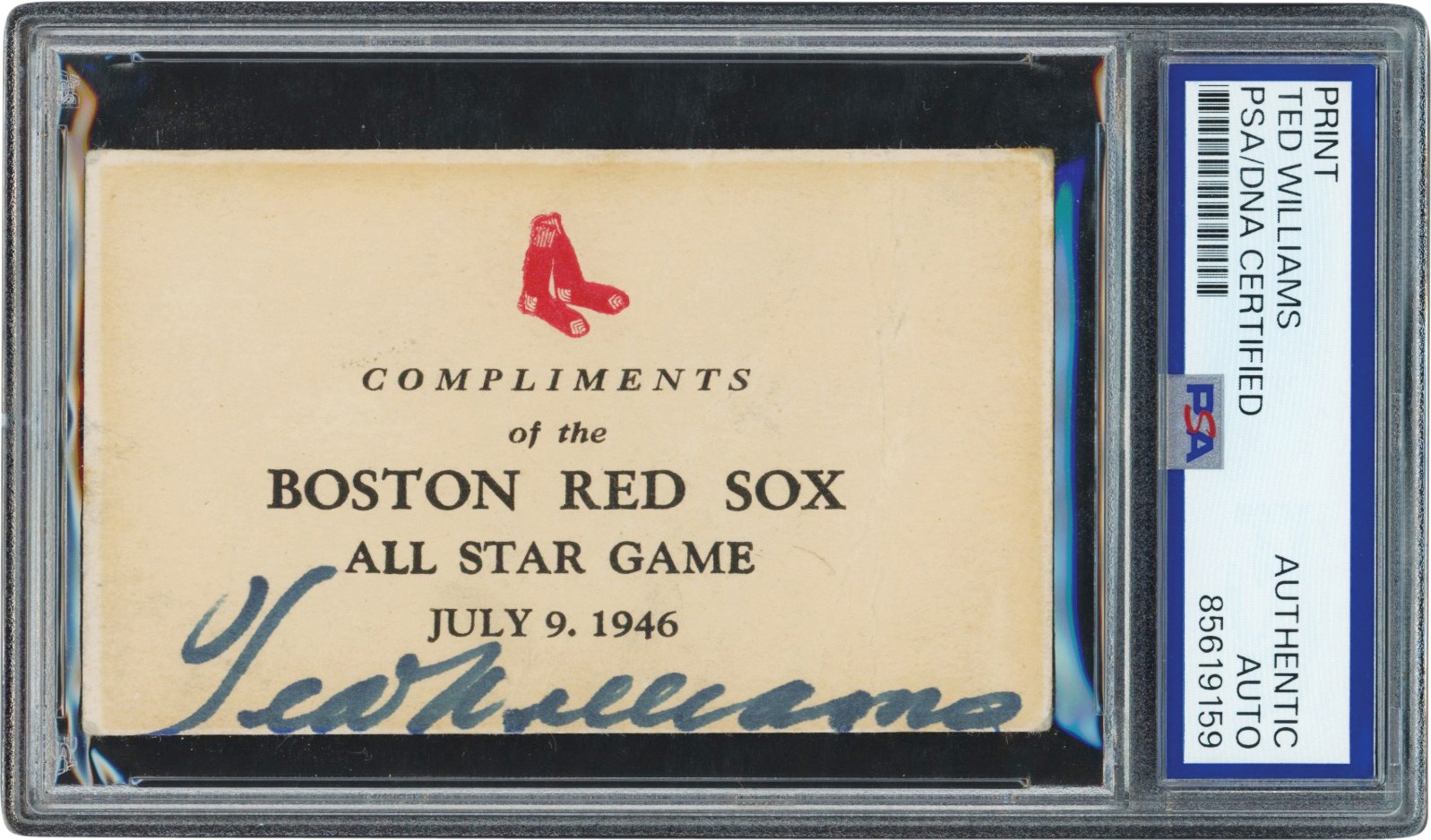 The complimentary pass has the Red Sox logo, and it reads, "COMPLIMENTS of the BOSTON RED SOX/ALL_STAR GAME/JULY 9, 1946". The pass measures approx. 2.25x3.5". Originally, the pass was white cardstock or paper, but it has now darkened through the passage of years. Williams, using blue, ballpoint ink, signed in yet, yet bold, flowing script at the bottom of the card. The back is blank and shows some creasing and tape residue. The signed card has been encapsulated and PSA/DNA CERTIFIED "AUTHENTIC AUTO" (85619159). The card has some light corner wear, and a vertical fold on the right side. The offering makes a great remembrance for Williams great 1946 All-Star Game performance in his AL MVP season.
