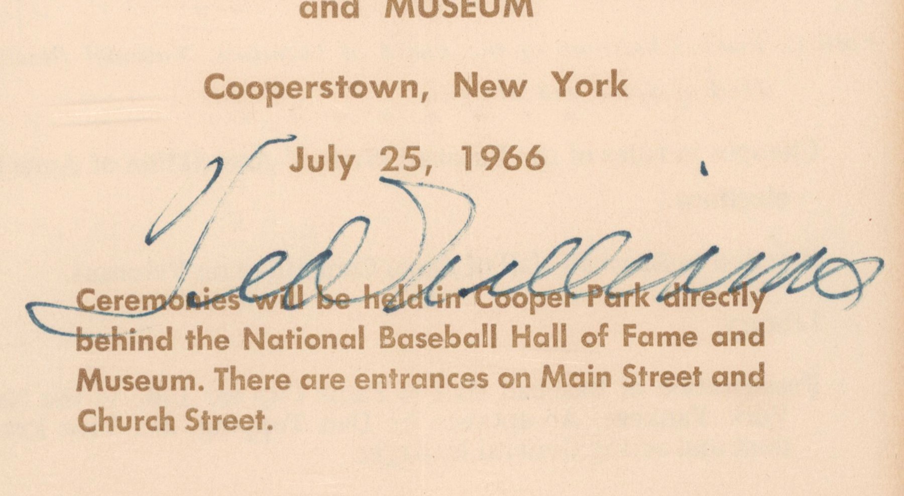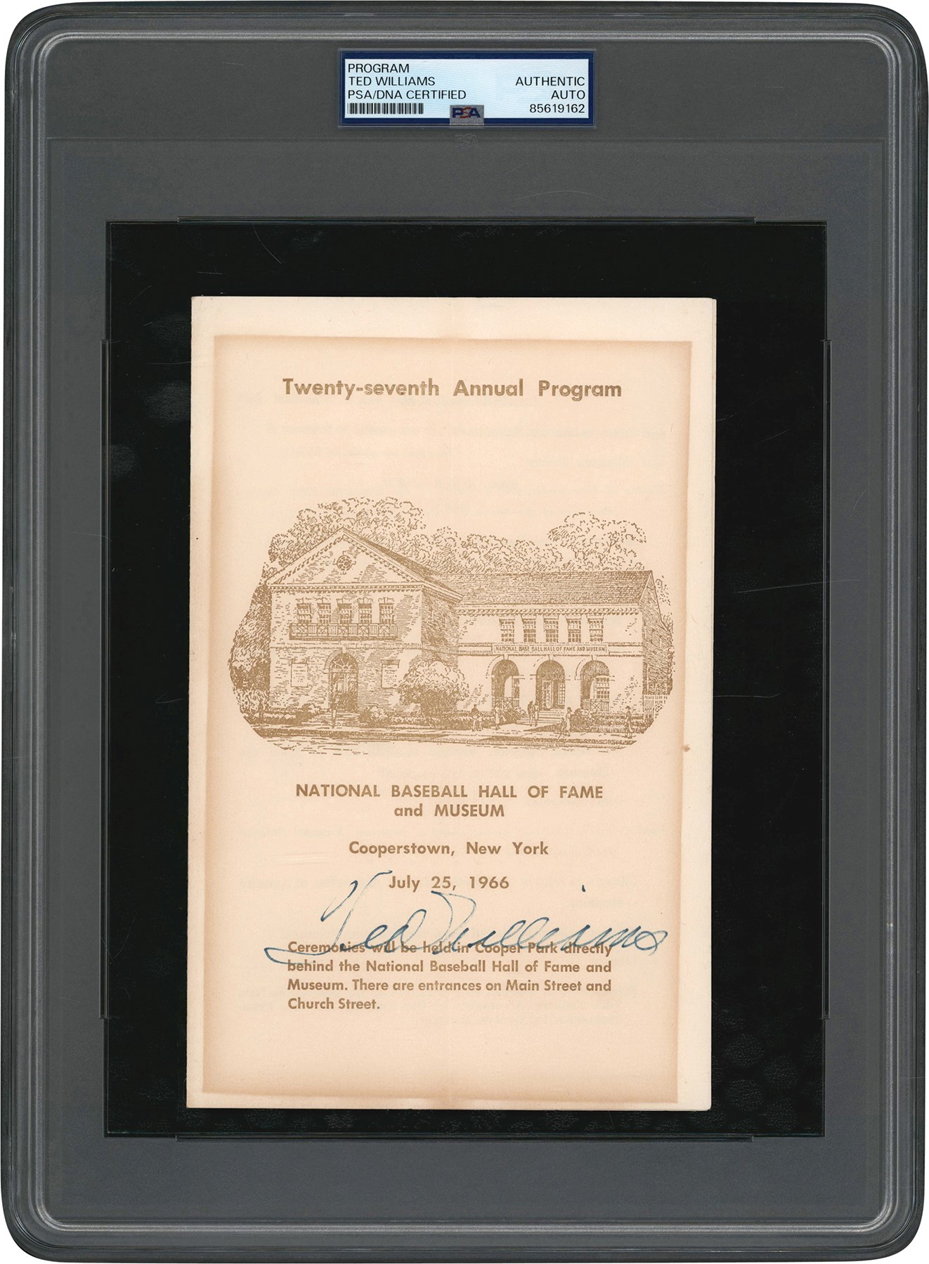 Presented is a Ted Williams signed July 25, 1966, Hall of Fame Induction program, the year the Splendid Splinter was inducted. Williams received 93.4 percent of the vote in 1966, and he was the only player inducted in '66, entering the Hall of Fame with Casey Stengel, inducted as a manager. Williams played 21 seasons, his entire career, as a left fielder for the Red Sox. He missed almost the equivalent of five seasons for service as a Marine Corps pilot in World War II and the Korean Conflict. He still managed 521 home runs and a lifetime .344 batting average, with six AL batting crowns. His .406 batting average in '41 remains the last time a Major League hit .400 or better. In Williams' HOF induction speech, he urged voters to include Negro League players Satchel Paige and Josh Gibson, who were not in the HOF, said Williams, "only because they weren't given the chance. Insubsequent years, Paige, Gibson, and 33 other African American players from Negro League and pre-Negro Leagues play were admitted to the Hall of Fame.