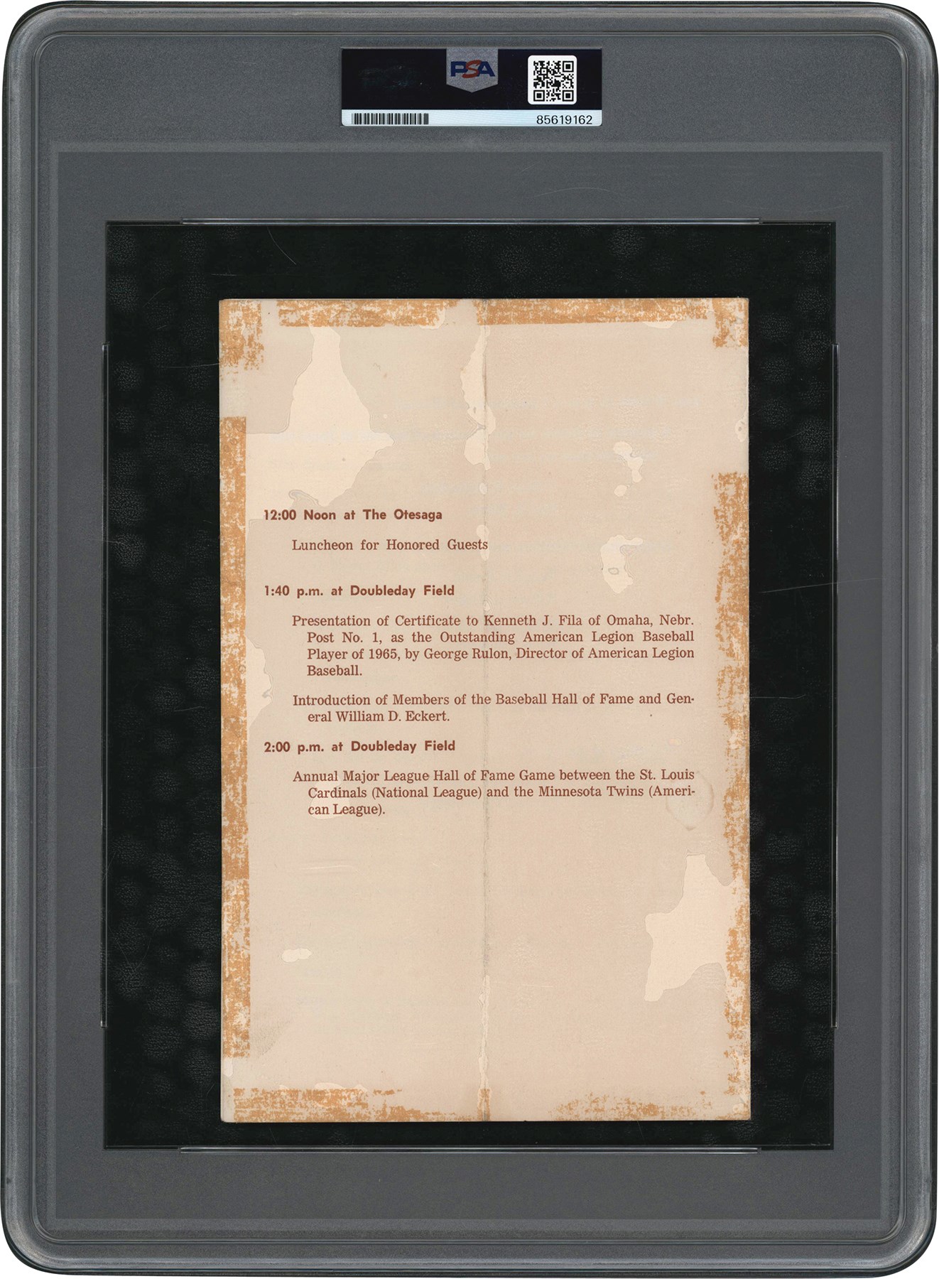 The signed 1966 HOF Induction program measures 5.5x8.5". It seems to have four pages, but it has been encapsulated and only the first and fourth pages are visible, folded and encapsulated. In part, the first page of the program reads, "Twenty-seventh Annual Program/National Baseball Hall of Fame and Museum/Cooperstown, New York/July 25, 1966". Williams signed, in blue ink, on the cover. The signature is big and bold, but slightly faint on the first letter of his first and last names. The back page of the program gives the schedule for the events that day. The program has a vertical fold down the middle. This back page has tape remnants along the top, bottom, and edges. Overall, the program is in very good condition. The encapsulated offering is PSA/DNA CERTIFIED "AUTHENTIC AUTO".