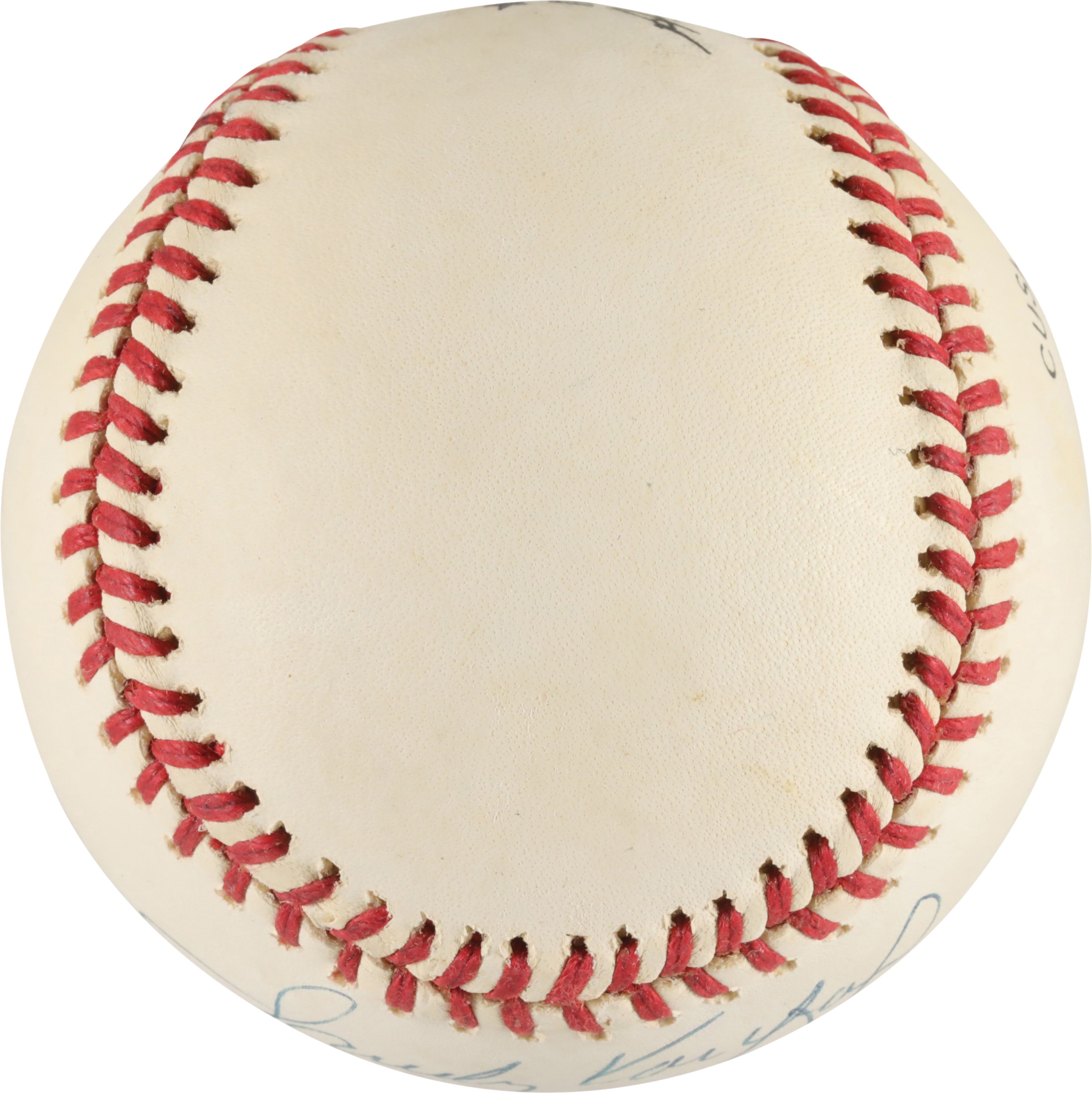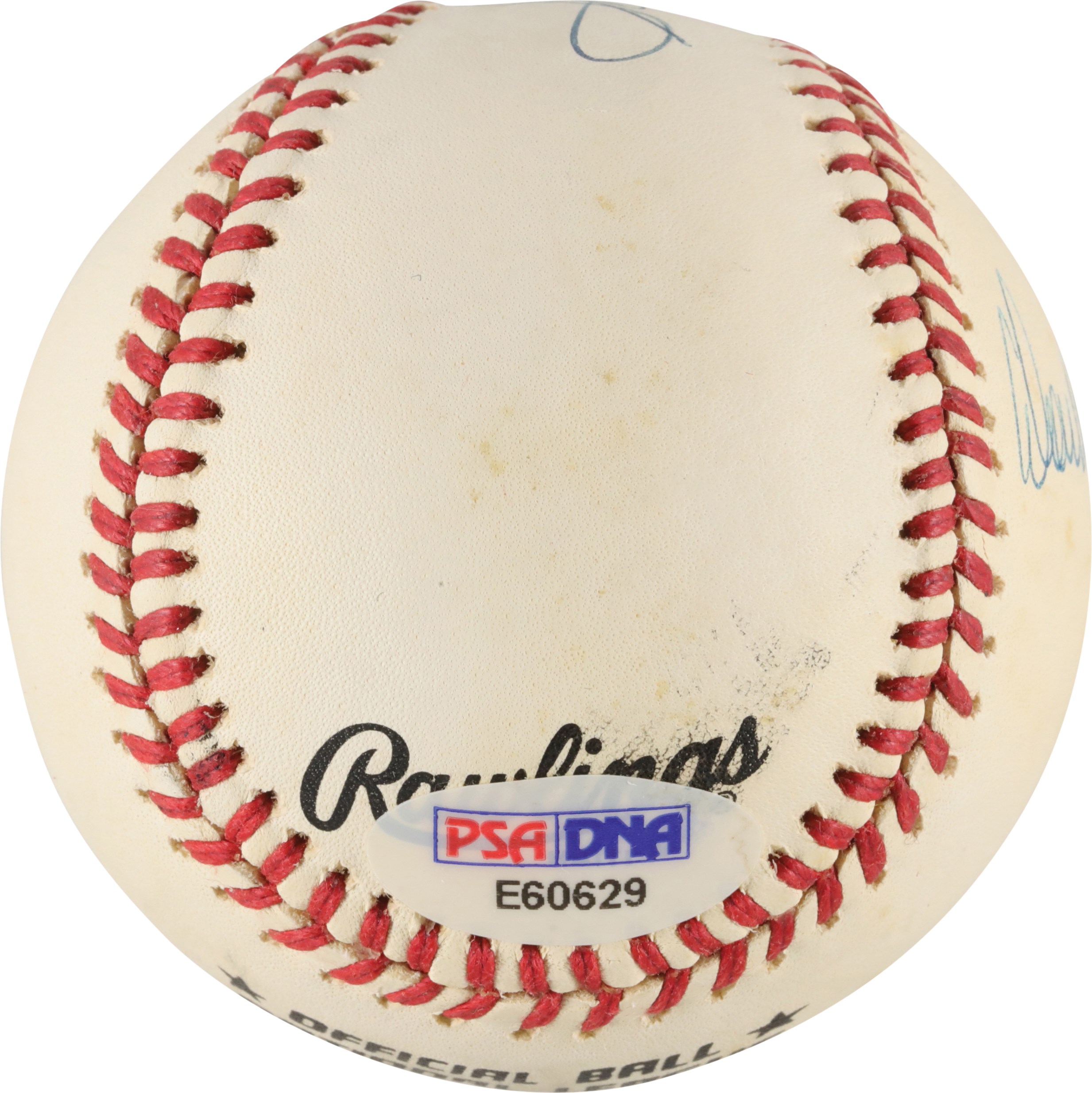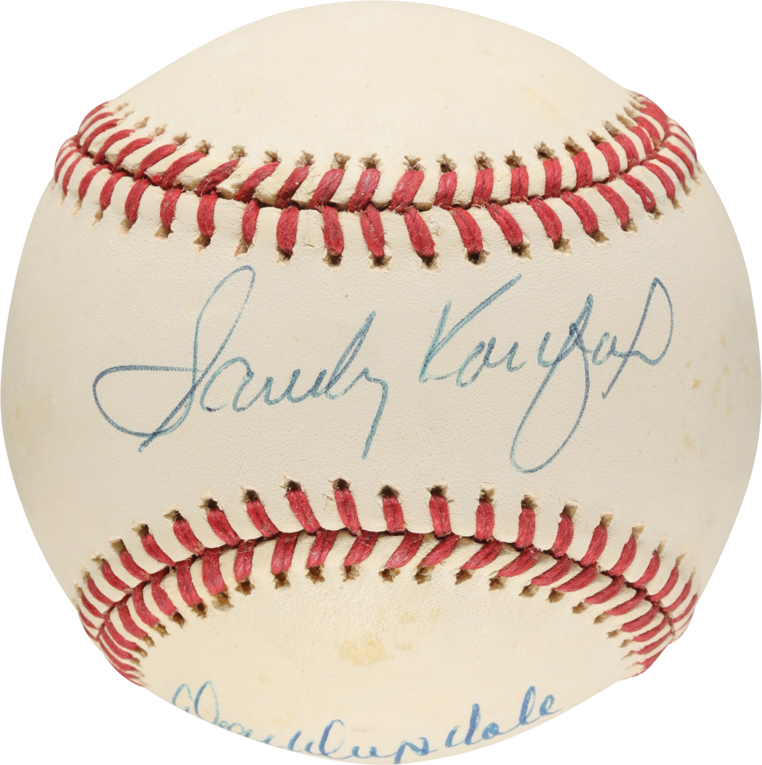 Official National League (Giamatti) baseball signed by Dodgers Hall of Fame pitchers Sandy Koufax and Don Drysdale. Both players have signed the ball in blue ink (grading 7/10), with Koufax's signature appearing on the sweet spot and Drysdale's on the side panel directly below. The ball displays light, scattered age toning and is otherwise in Excellent to Mint condition. A PSA hologram label (E60629) is affixed to a side panel, but no corresponding COA accompanies the ball (the ball is listed in PSA's database as "Authentic").