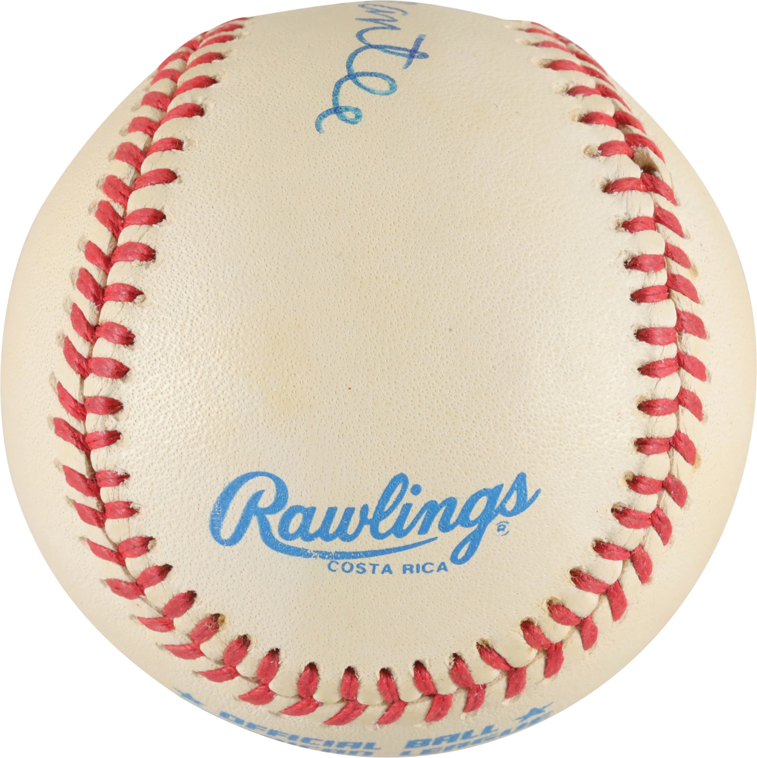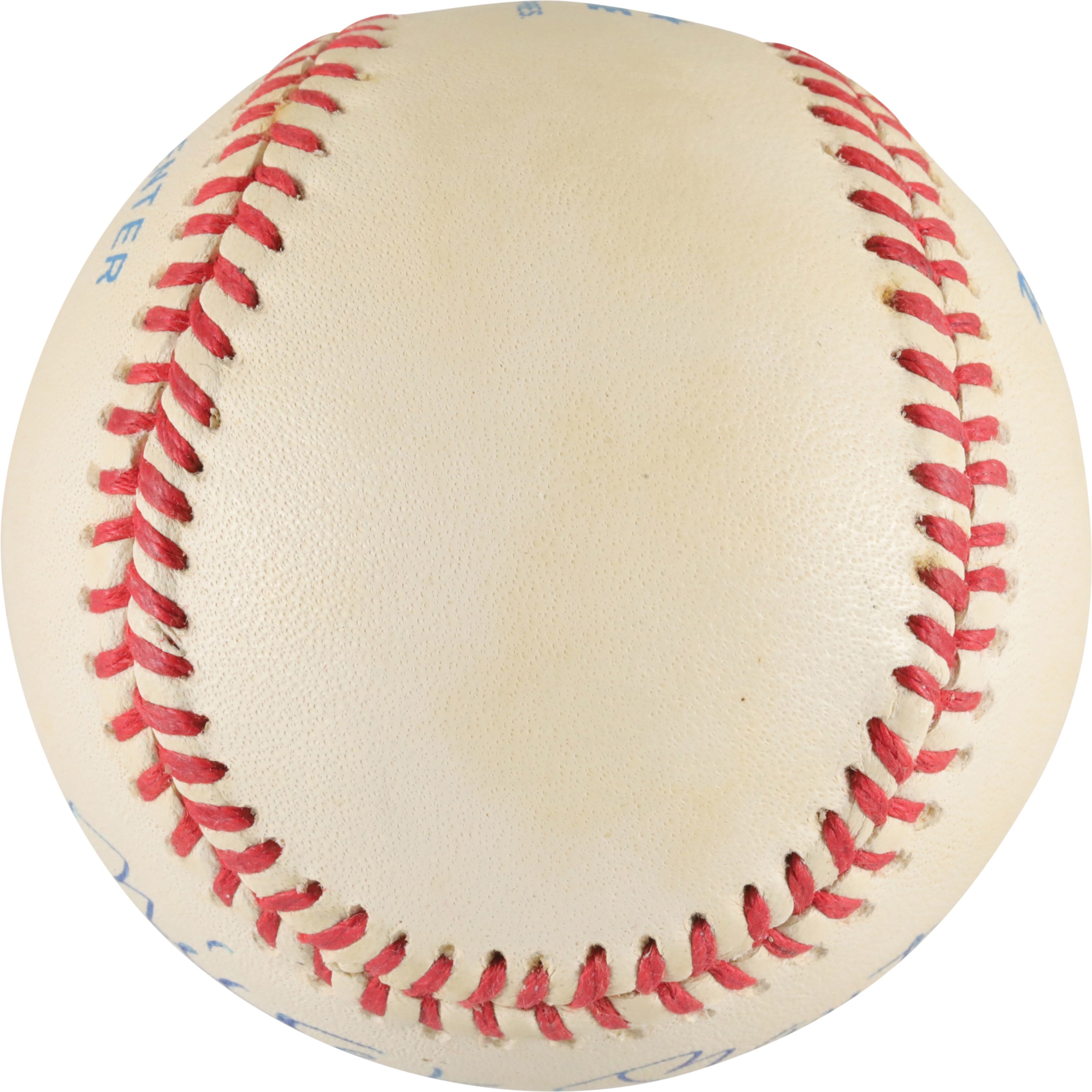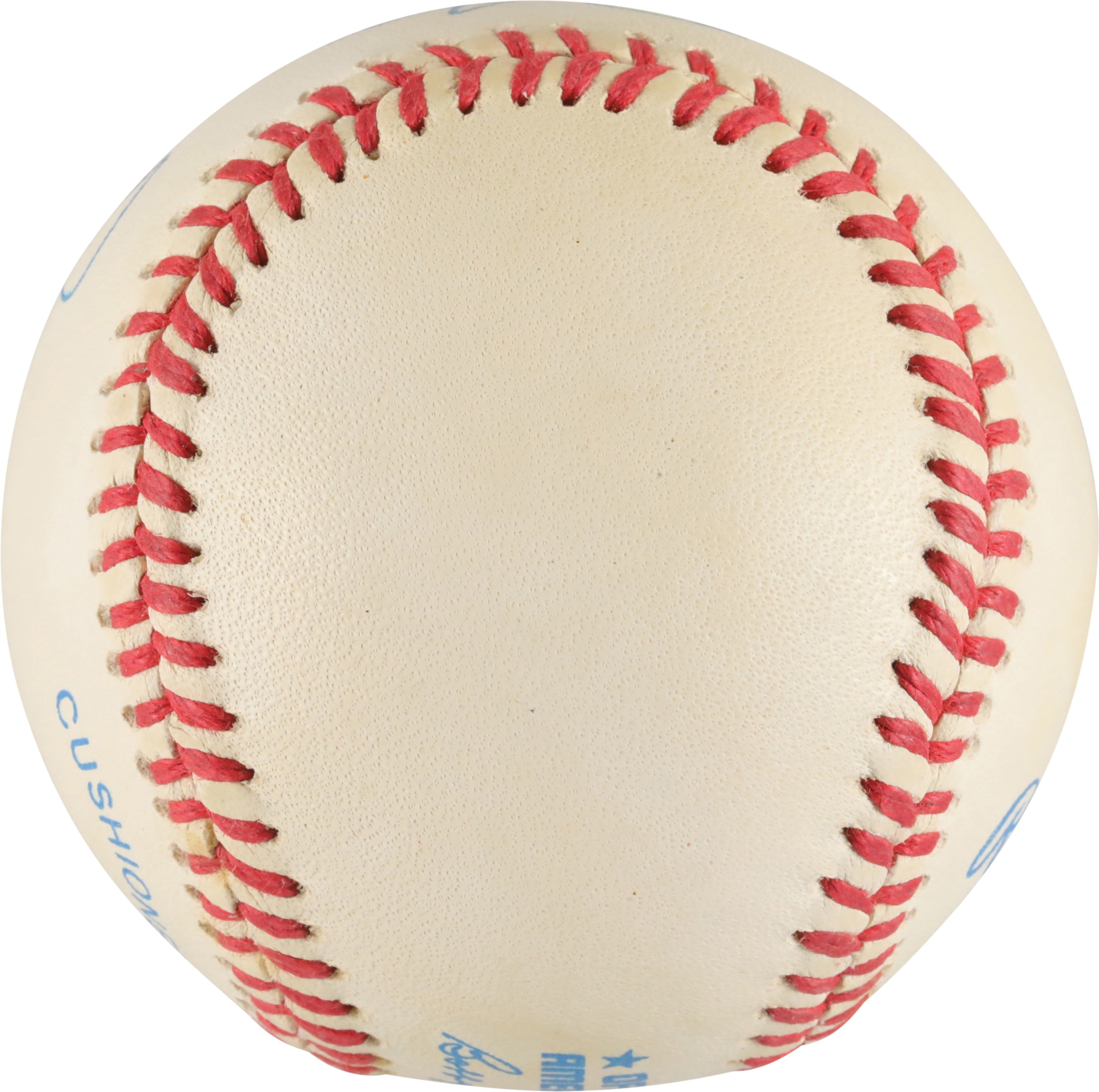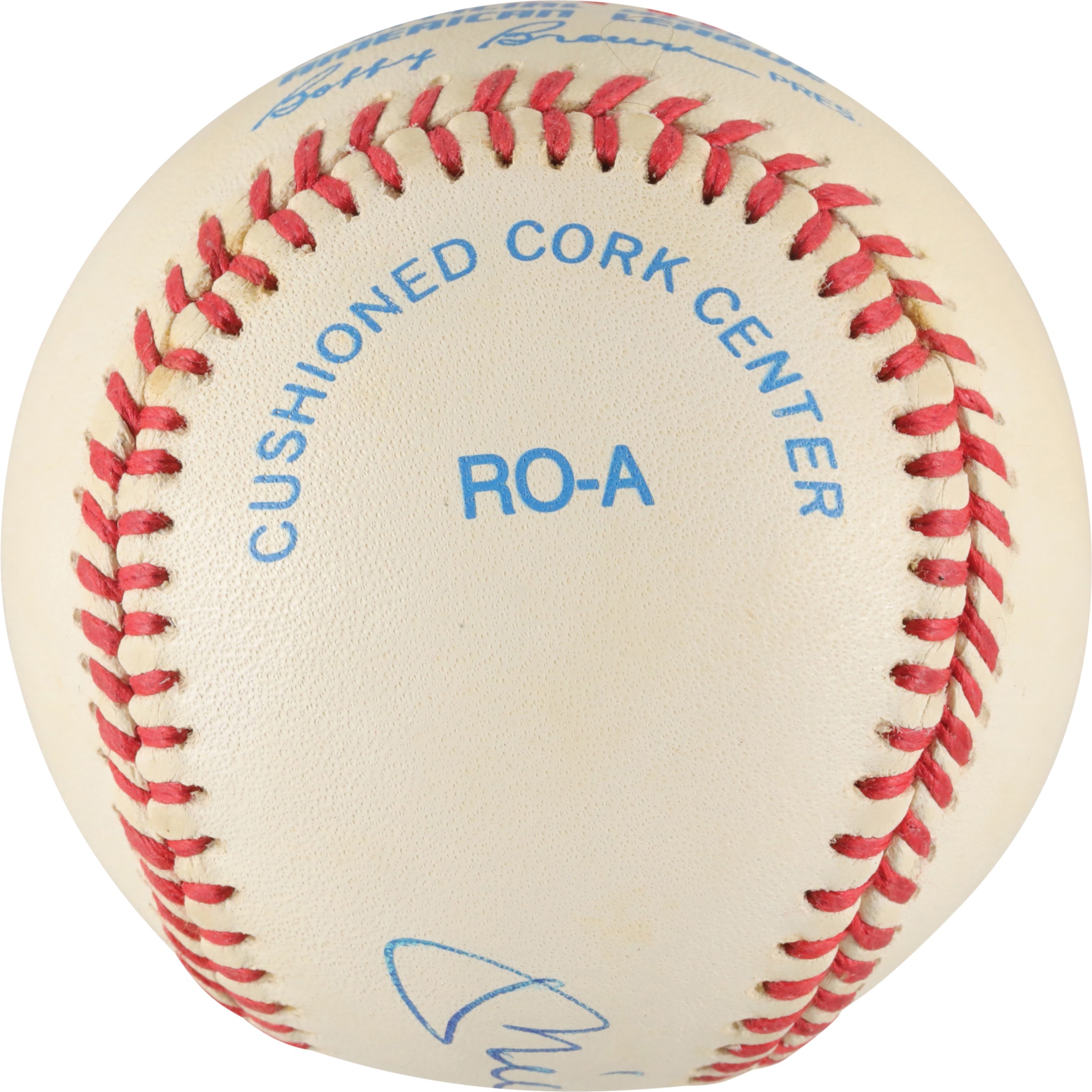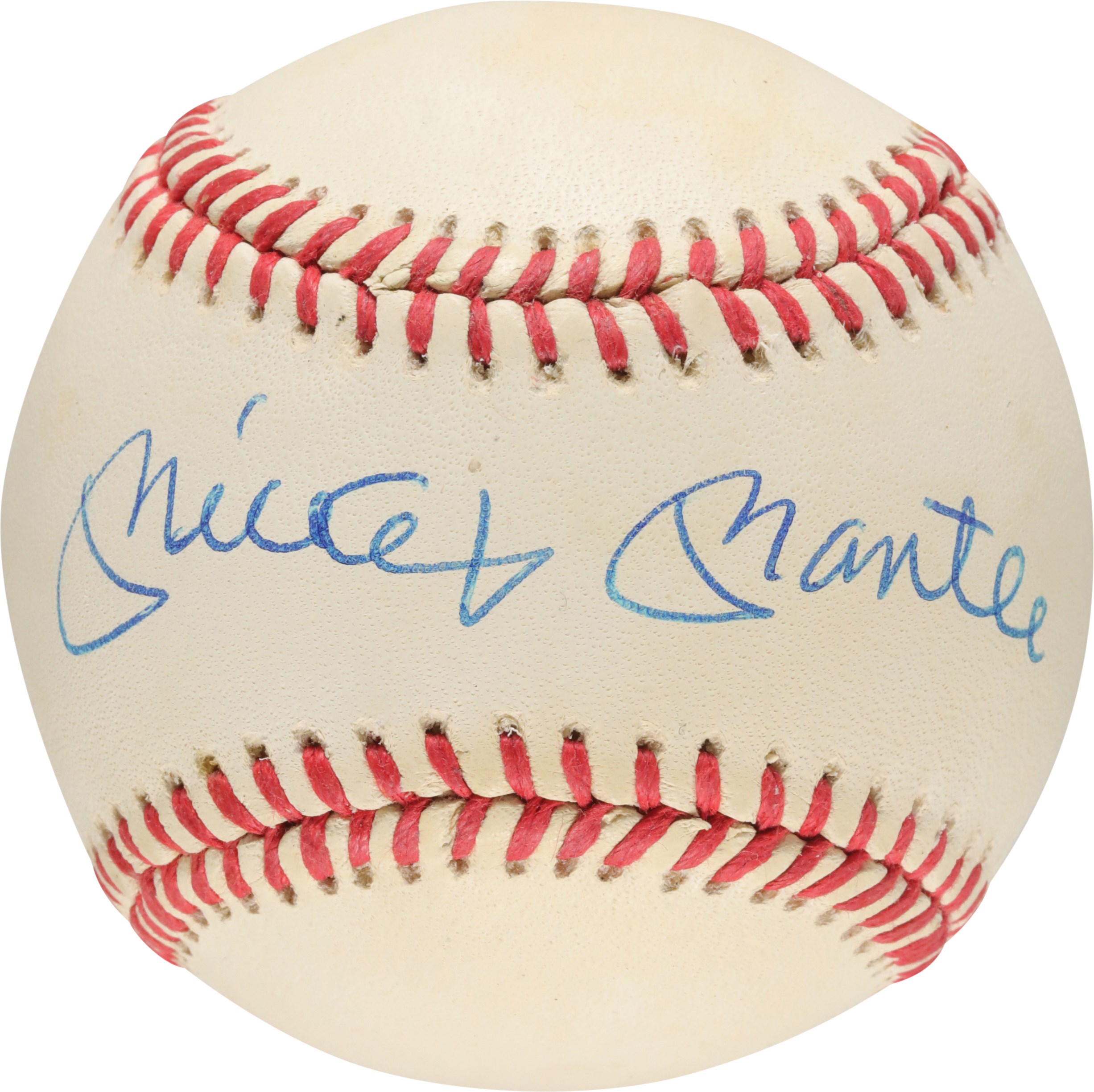 Official American League (Brown) baseball signed by Mickey Mantle across the sweet spot. Mantle has scripted his name in blue ink, with the signature grading 9/10. The ball displays a few small areas of very light age toning; otherwise it remains in Near Mint condition. Full LOA from PSA.