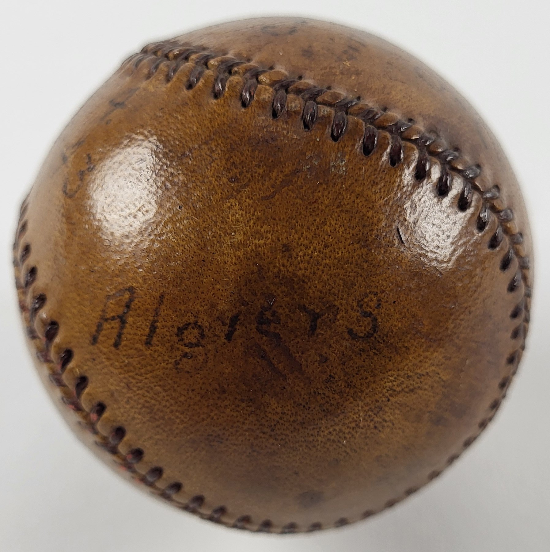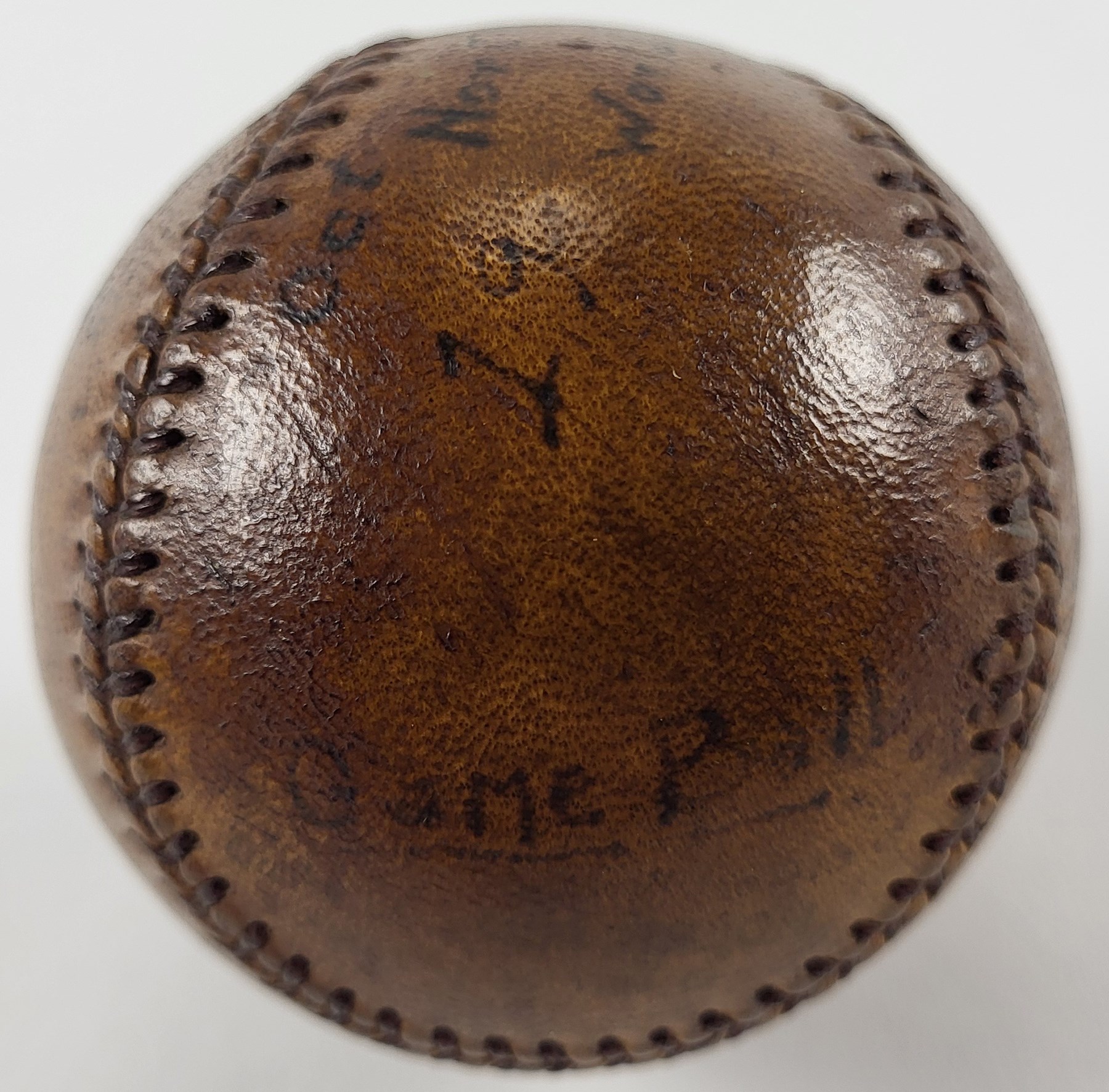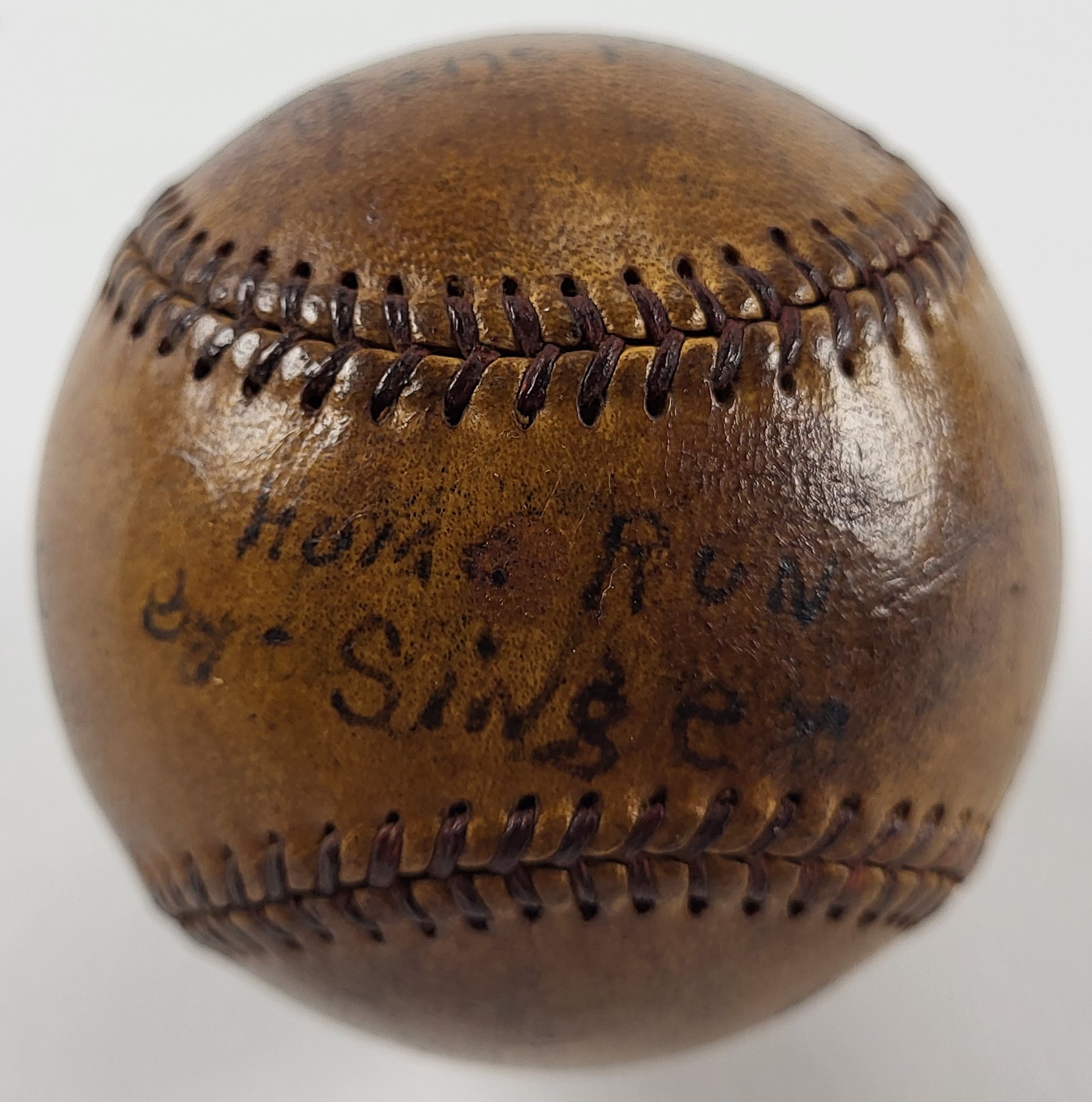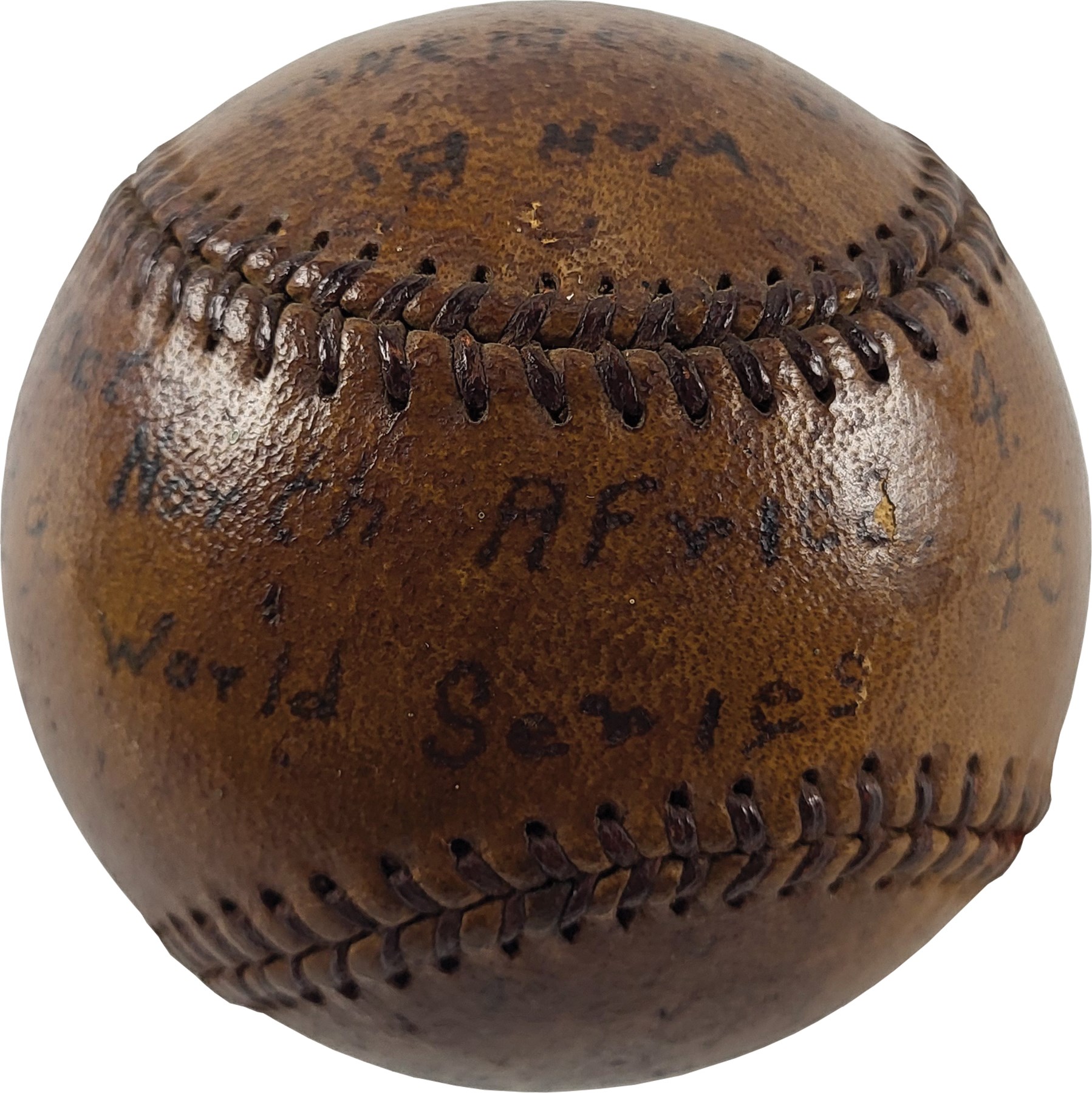 Rare game ball hit for a home run by Walt Singer during Game 2 of the North African World Series, held at St. Eugene Municipal Stadium in Algiers, Algeria, on October 4, 1943. This is a remarkable souvenir and one that has significance both for baseball and World War II collectors alike. All the provenance is in the form of the vintage handwritten notations in black fountain pen that adorn every panel. The lettering across the sweet spot reads "North Africa World Series Oct 4 1943." Written, respectively, on the two adjacent East and West panels are "Game Ball" and "Algiers." The adjacent sweet spot reads "Home Run by Singer. The remaining two side panels read, respectively, "Won by Casablanca 'Little Yanks 9-0 7-6" and Umpires: Monk Hert Lefty Kohler Pat Conway." The ball, which bears no manufacturer's stampings, is darkly toned and has been heavily shellacked.