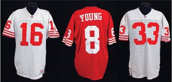 Three great jerseys emanating from the team of the 1990’s and three of its most important players: 1. Joe Montana’s white mesh road jersey. The league’s #1 all-time QB, whose excellence led the 49ers to win a league record-15 games in 1984 (including all 8 road games). Jersey with hisl #16 on the front, back & sleeves. Signed in black felt tip on the “1” on back. Official NFL logo patch embroidered at the V-neck on front. Wilson’s “W” embroidered on left sleeve. Front tail tagging is “Wilson” with “[size] 46 FR” flag tag. “Montana” has been removed from the back by the team. 2. Roger Craig white mesh road jersey. He became the first NFL player with 1,000 yards in both rushing and receiving in the same season (’85). Jersey with his #33 in red tackle twill on front, back & sleeves. Wilson’s “W” embroidered on left sleeve and the official NFL logo patch on front at the V-neck. Name removed from verso. No additional tagging. 3. Steve Young red mesh home jersey. White numbering & lettering: #8 on front, back & sleeves. “Young” across the shoulder blades. Wilson tag with care instructions on inside left seam. All three jerseys show heavy game use.
