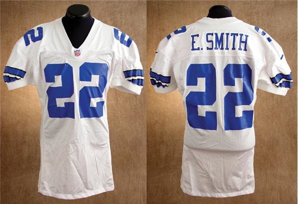 Future Hall of Famer and the NFL’s new all-time career rushing leader with 17,162 yards donned this jersey against the rival New York back in ’99, a season in which he rushed for 1,397 yards! Will he be wearing the same Cowboys uniform next season? Time will tell. But a great tribute to the man who surpassed the legendary Walter Payton in rushing yards is this white road jersey, bearing his #22 on the front, back and sleeves. “E. Smith” on name plate across the shoulder blades. “Cowboys” embroidered on the front just below the official NFL logo patch on the V-neck. Embroidered Nike swoosh on the right shoulder. “98-48” printed on strip tag in the collar. Good use. From a source within the NFL. LOA.
