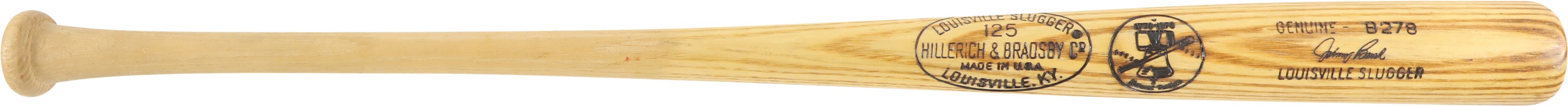 Louisville Slugger B278 measures 35 3/8", weighs 33 ounces and features the Bicentennial stamp on the barrel along with a Johnny Bench facsimile signature.  Clean and unused example has a hand written "5" on the knob in black marker.