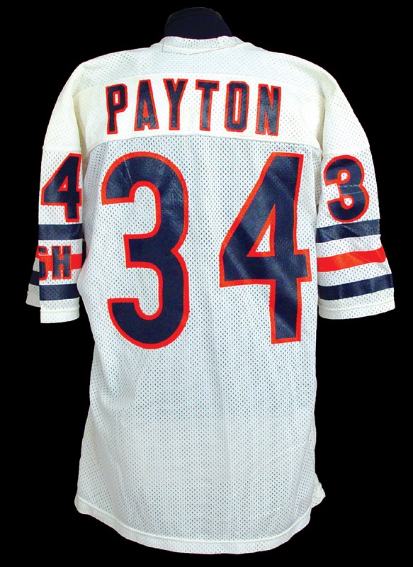 Oh, how sweet it is! A flat out great jersey from the NFL’s second all-time career rushing leader and inspiration to the running back position. He just got beat out by Emmitt Smith for rushing yards, but he will always be remembered as the legendary player that he was, who defined the running back position Chicago Bears white road jersey has the perfect amount of game use with helmet scuffs to the front shoulders as well as the numbers on the back. Several team repairs to both shoulders testify to the amount of use Payton got out of this jersey. His #34 screened on the front and back as well as the sleeves. “Payton” spans the back. “GSH” memorial letters on the left sleeve as a tribute to George S. Halas. This jersey was worn around the time the Chicago Bears became Super Bowl champions. Tagging on front left tail is “Wilson”. Obtained from a former Chicago Bears employee.