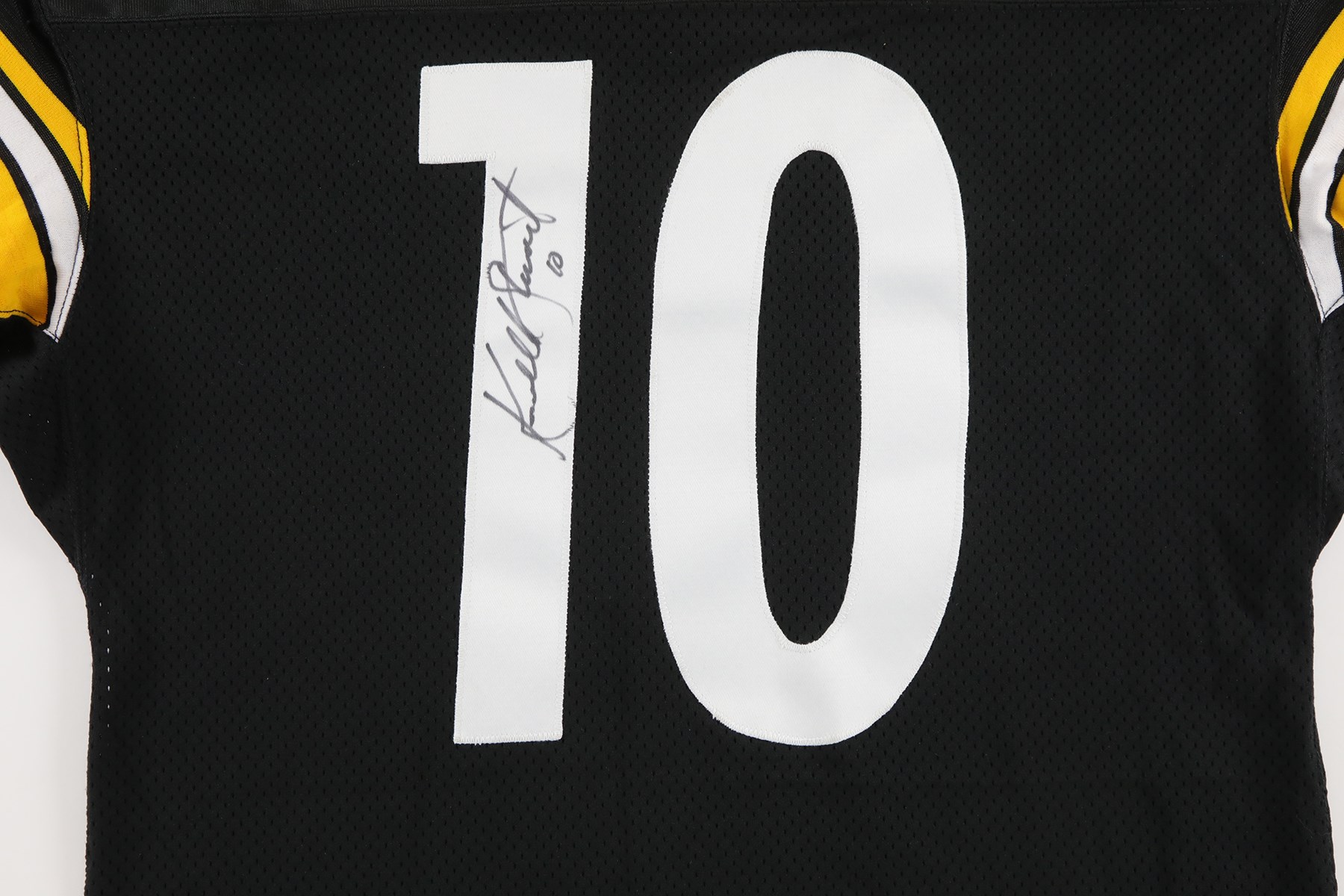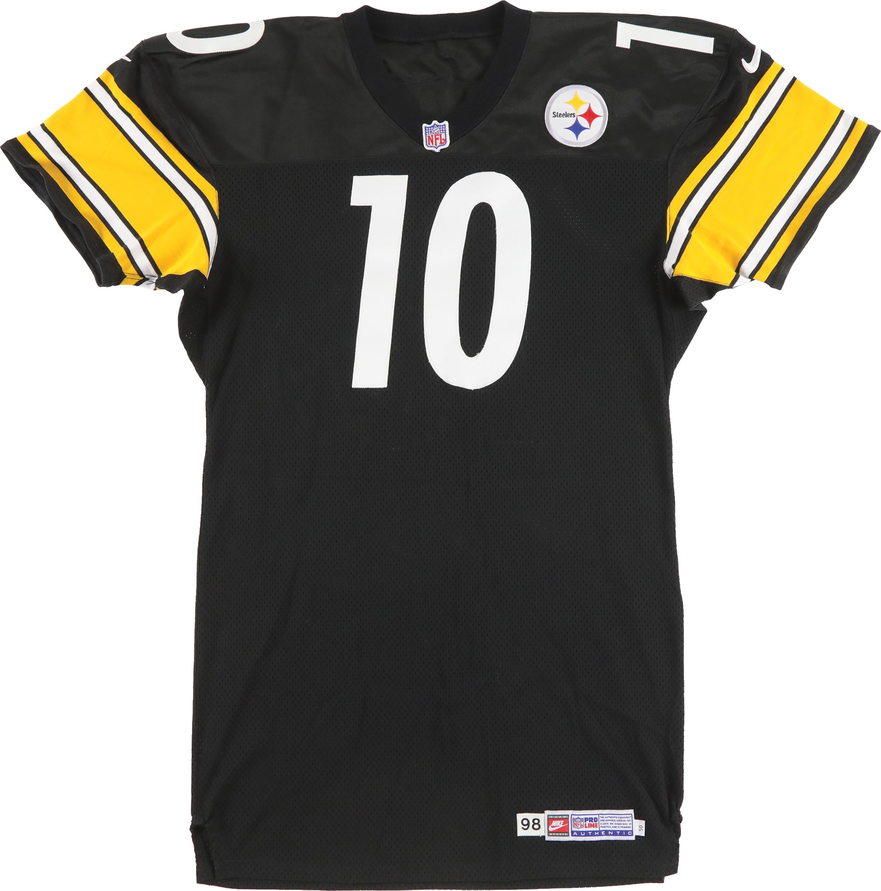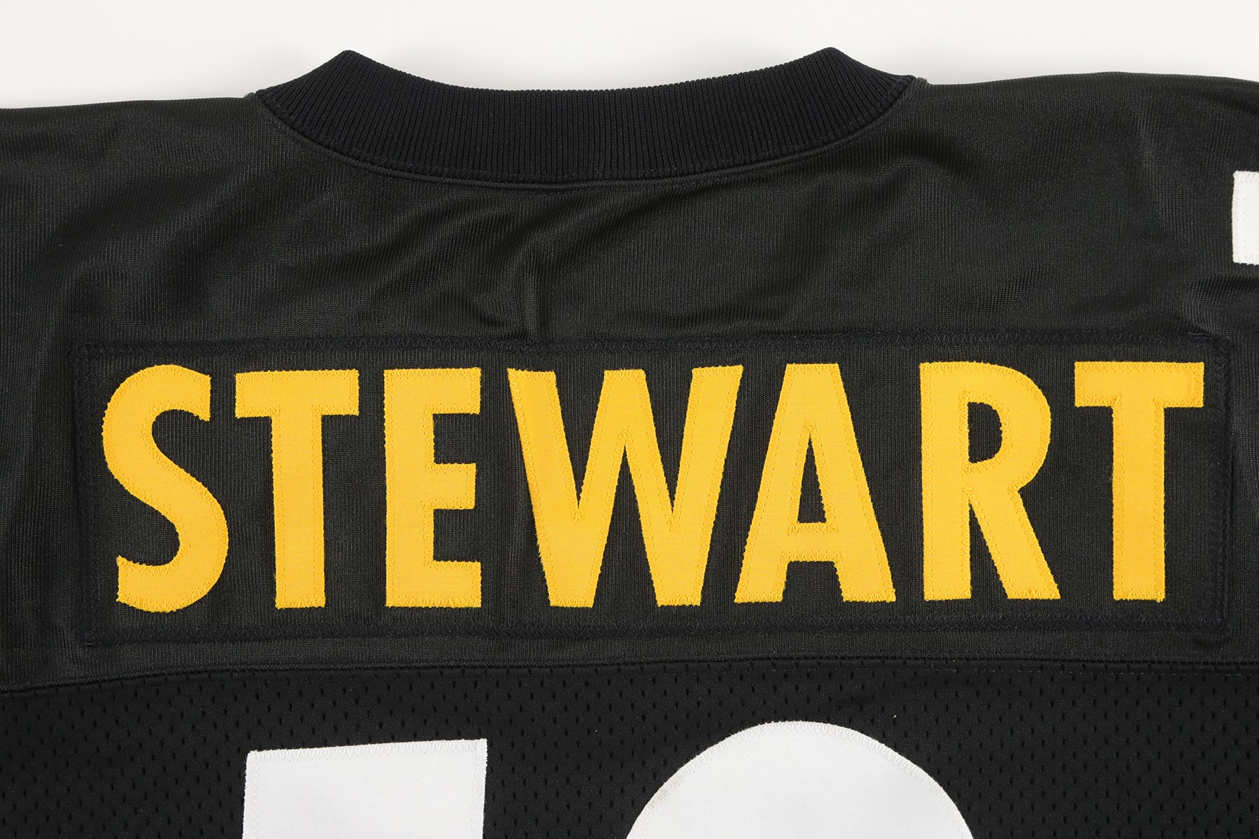 Pittsburgh Steelers pro-model jersey produced for quarterback Kordell Stewart during the 1998 season. The black mesh jersey features the number "10" on the front, reverse, and each shoulder. "Stewart" is lettered upon a black cloth nameplate on the reverse, directly above the number. All numerals are applied in white tackle twill, while all letters are applied in gold tackle twill. Located on the left front tail are a "Nike" label, a "98" year tag, and a "50" size tag. Stewart has inscribed the jersey "Kordell Stewart 10" in black marker (grading 9/10) on the reverse numeral "1." The jersey is original as issued and displays no use. 1998 marked Stewart's fourth year with the Steelers and his second as the starting quarterback. His finest season came in 2001, when he helped lead the club to 13 wins and an appearance in the AFC Championship game.