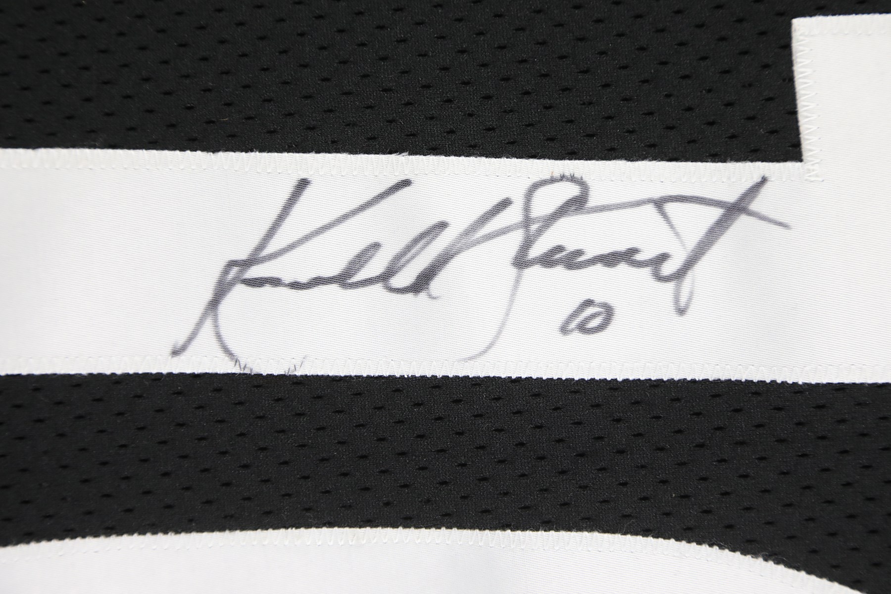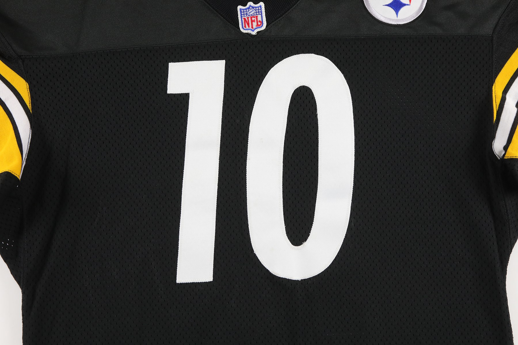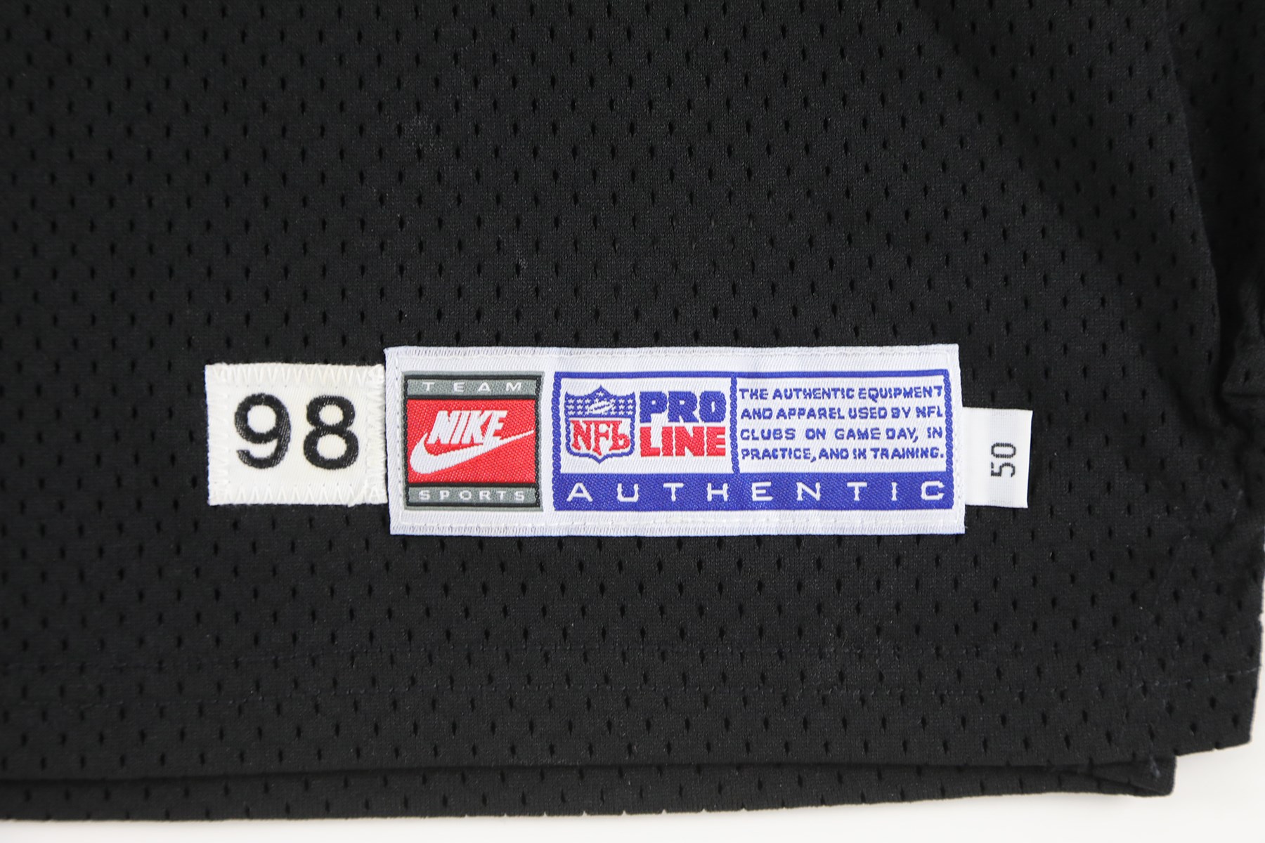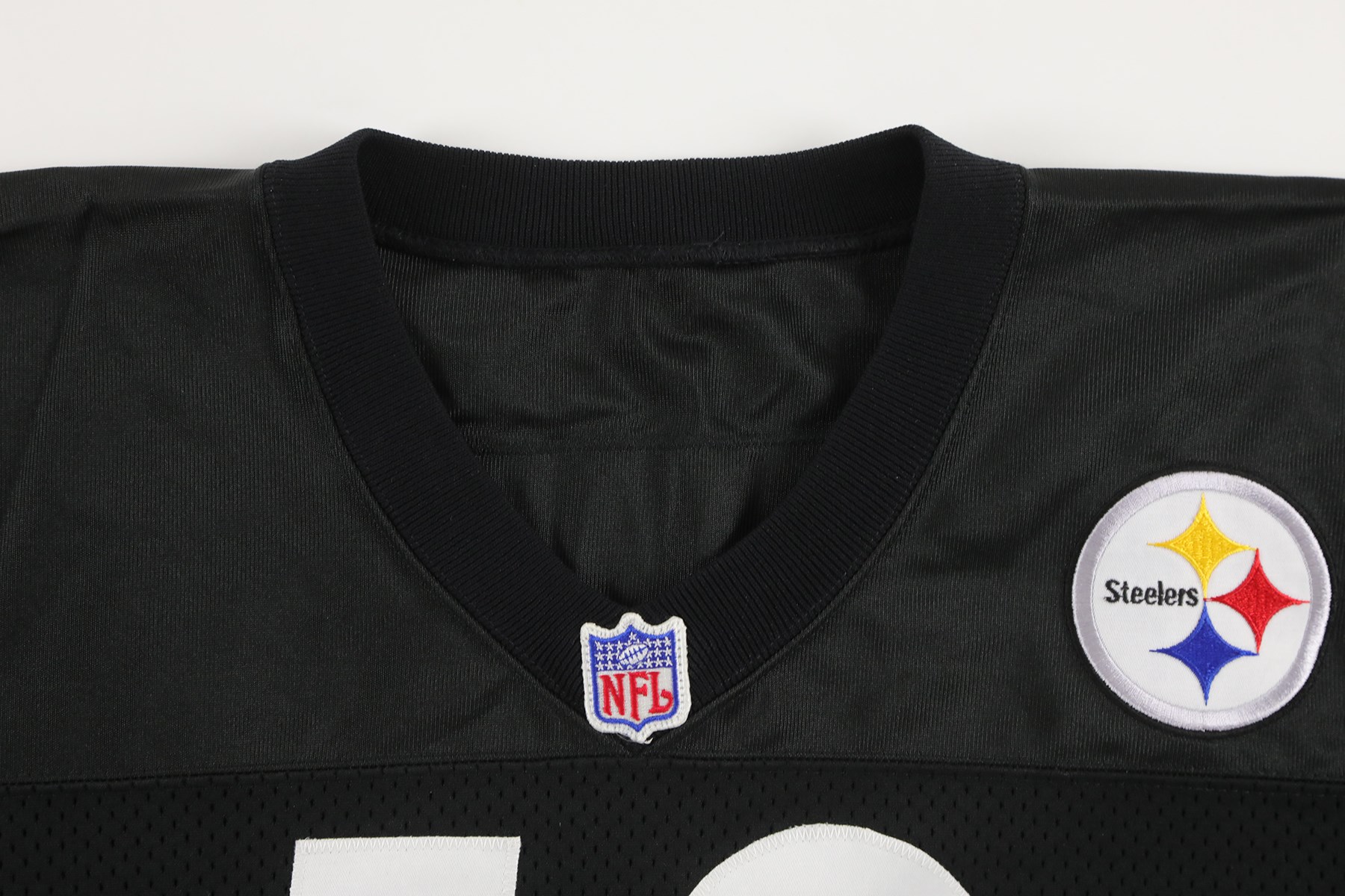 Pittsburgh Steelers pro-model jersey produced for quarterback Kordell Stewart during the 1998 season. The black mesh jersey features the number "10" on the front, reverse, and each shoulder. "Stewart" is lettered upon a black cloth nameplate on the reverse, directly above the number. All numerals are applied in white tackle twill, while all letters are applied in gold tackle twill. Located on the left front tail are a "Nike" label, a "98" year tag, and a "50" size tag. Stewart has inscribed the jersey "Kordell Stewart 10" in black marker (grading 9/10) on the reverse numeral "1." The jersey is original as issued and displays no use. 1998 marked Stewart's fourth year with the Steelers and his second as the starting quarterback. His finest season came in 2001, when he helped lead the club to 13 wins and an appearance in the AFC Championship game.