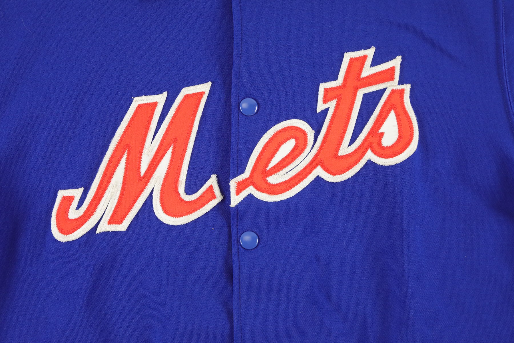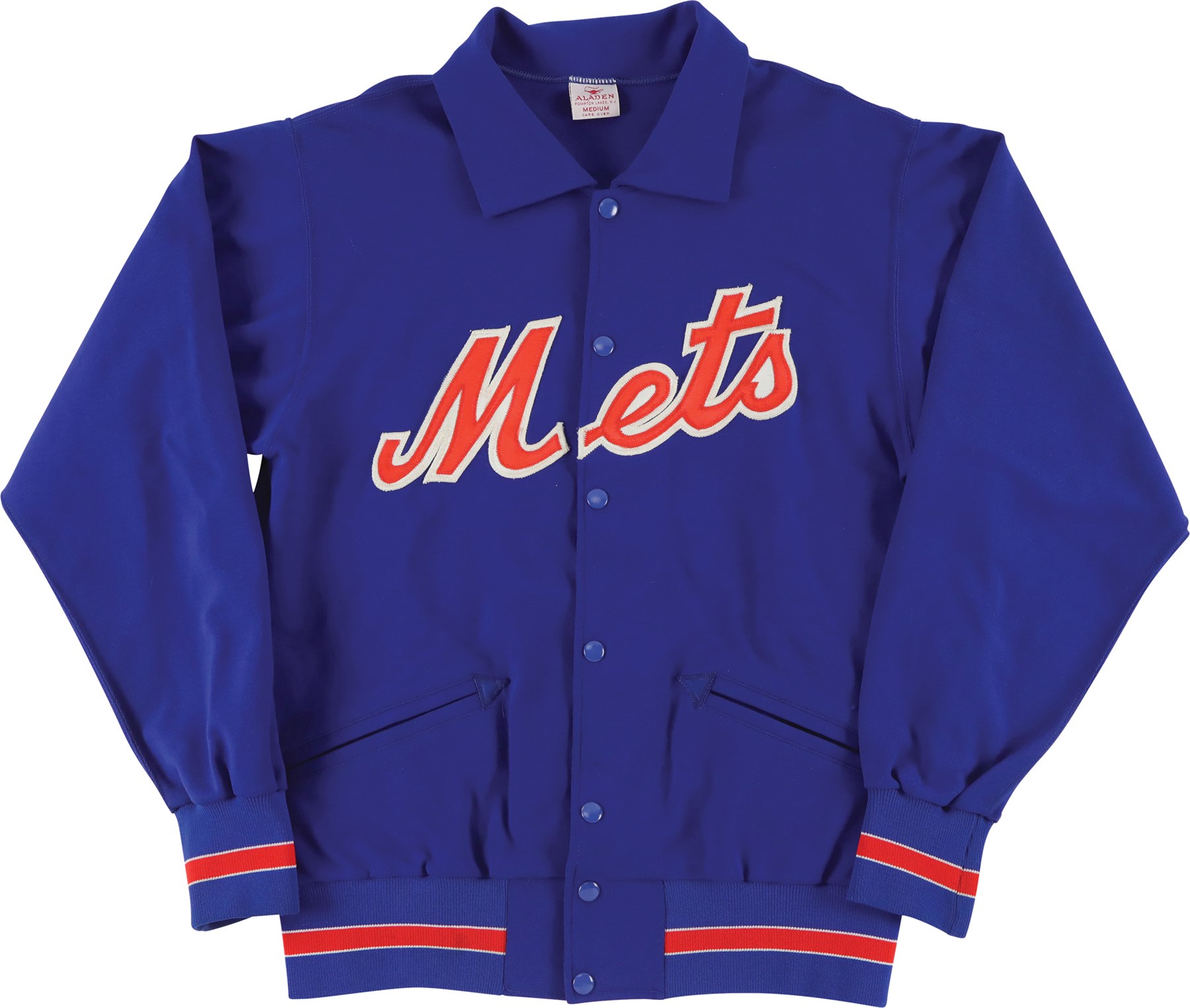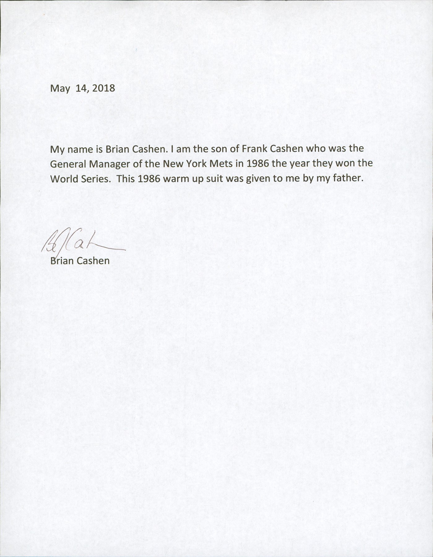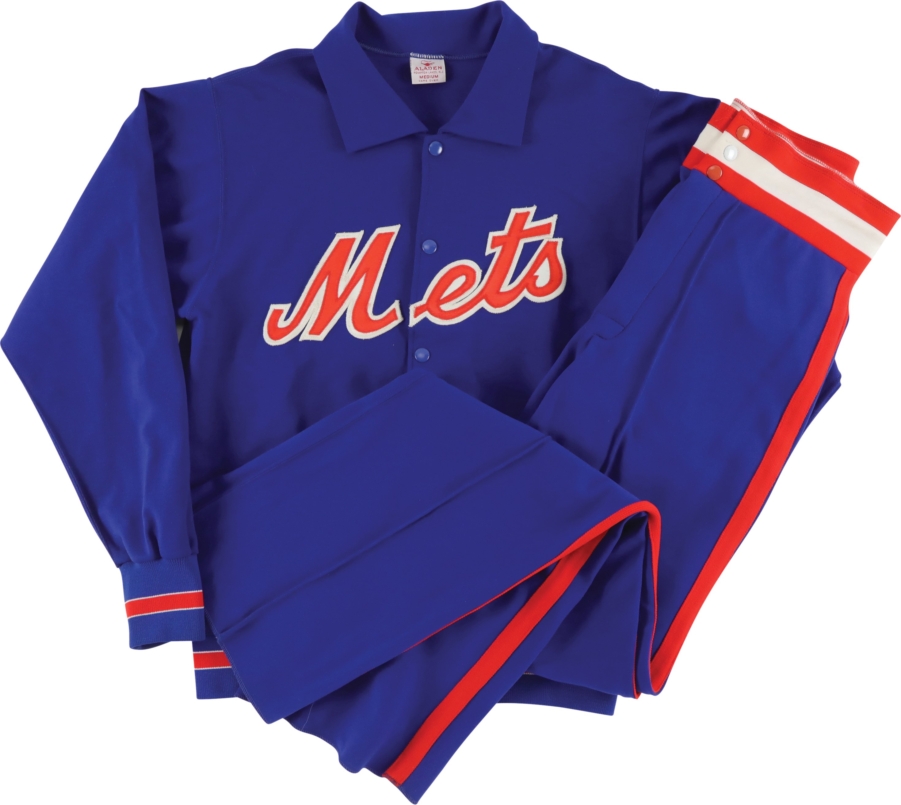 New York Mets warmup suit dating to the club's 1986 World Championship season. This warmup suit comes with the special provenance of originating from the Mets' general manager, Frank Cashen. Cashen obtained the suit for his son, Brian, and the garment is accompanied by a signed letter from Brian Cashen attesting to its provenance. The blue, button-down jacket is lettered "Mets" across the front in orange on white tackle twill. An "Aladen" label (size medium) appears in the collar. The matching pants, with orange-and-white trim along the waistband and a sold orange stripe down the side of each leg, also bears an "Aladen" manufacturer's tag (size medium) in the interior waistband. Both garments are original as issued and display light wear.
