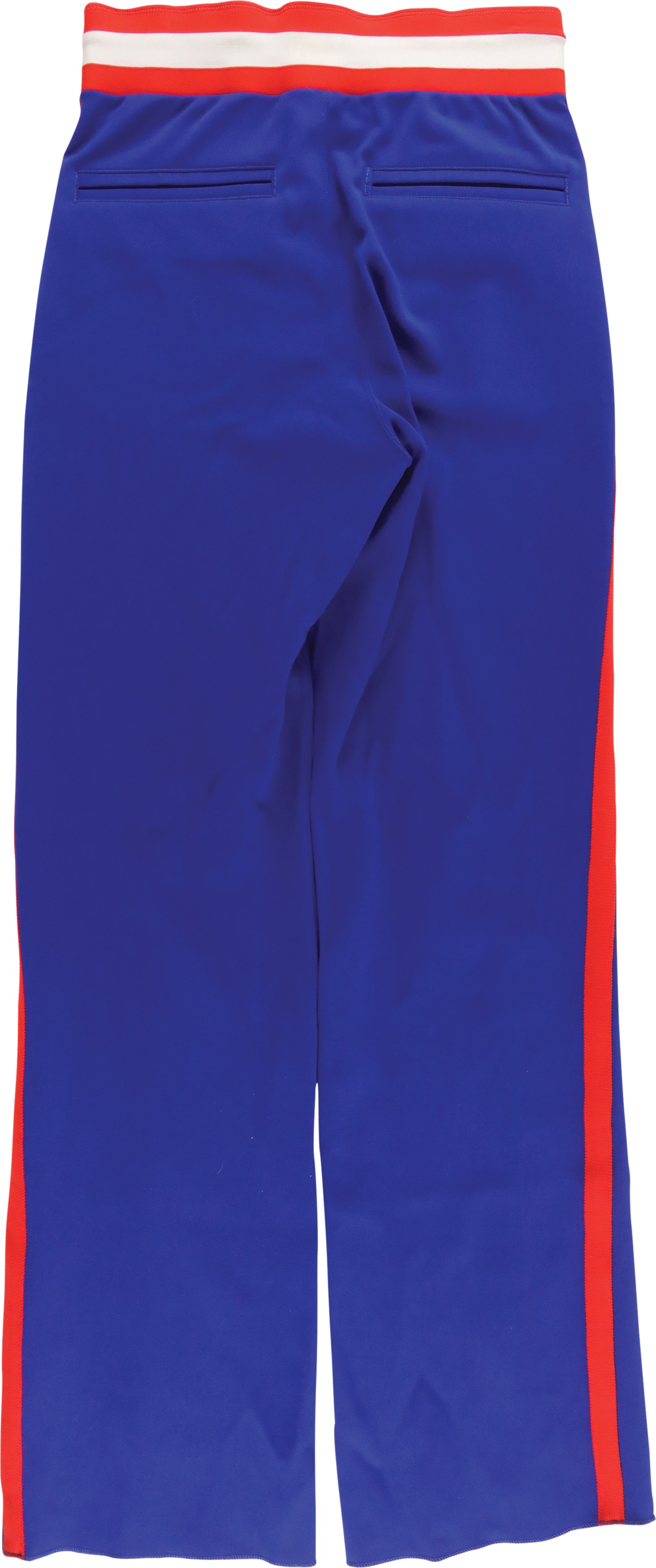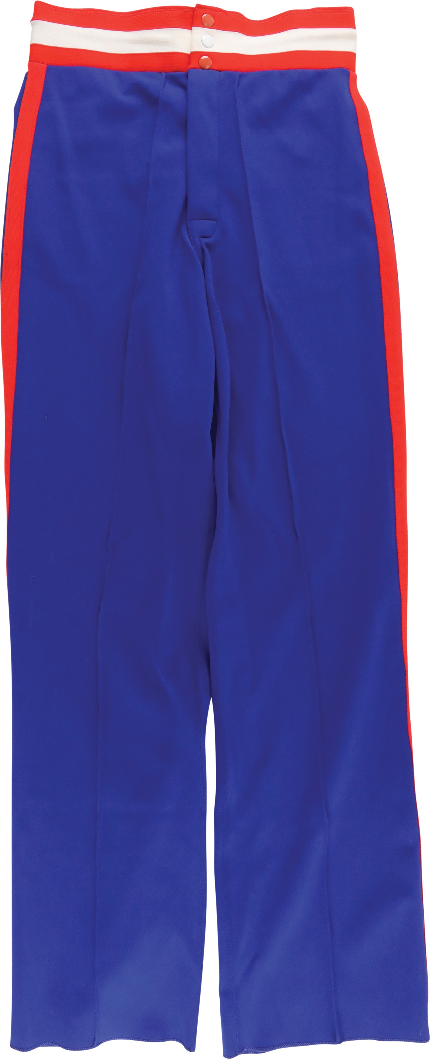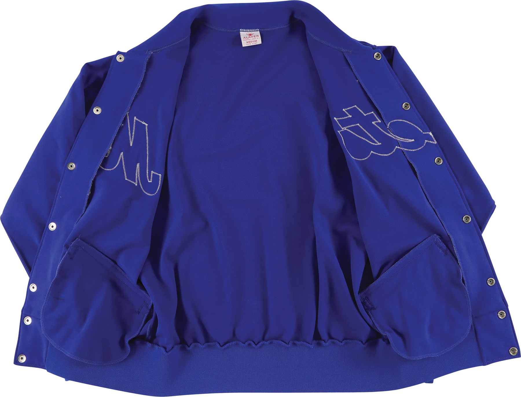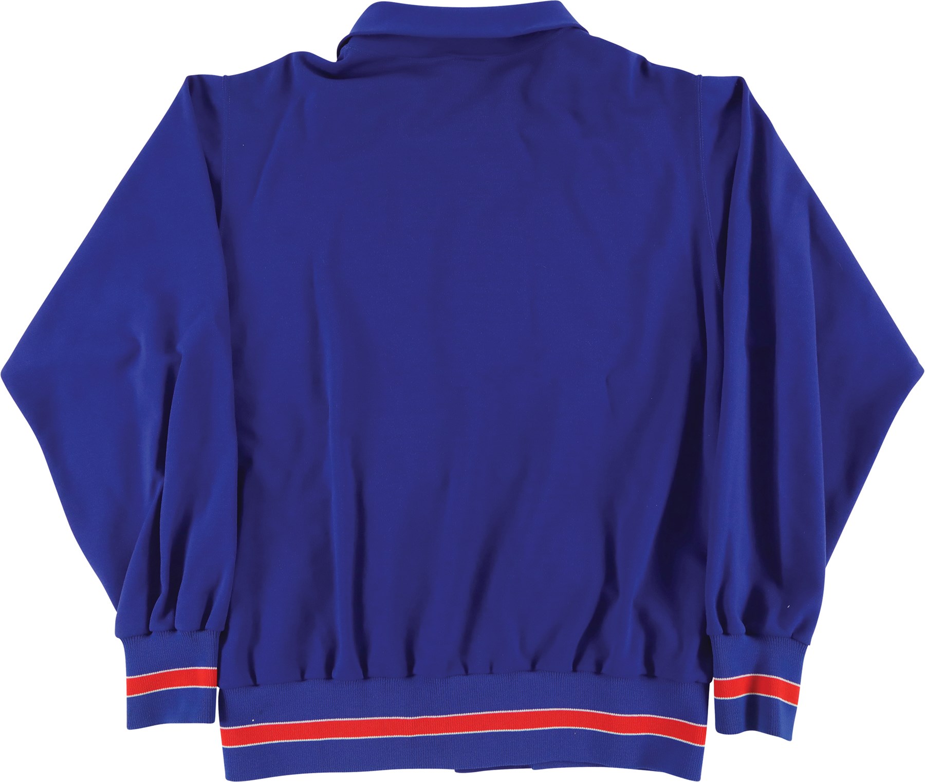 New York Mets warmup suit dating to the club's 1986 World Championship season. This warmup suit comes with the special provenance of originating from the Mets' general manager, Frank Cashen. Cashen obtained the suit for his son, Brian, and the garment is accompanied by a signed letter from Brian Cashen attesting to its provenance. The blue, button-down jacket is lettered "Mets" across the front in orange on white tackle twill. An "Aladen" label (size medium) appears in the collar. The matching pants, with orange-and-white trim along the waistband and a sold orange stripe down the side of each leg, also bears an "Aladen" manufacturer's tag (size medium) in the interior waistband. Both garments are original as issued and display light wear.