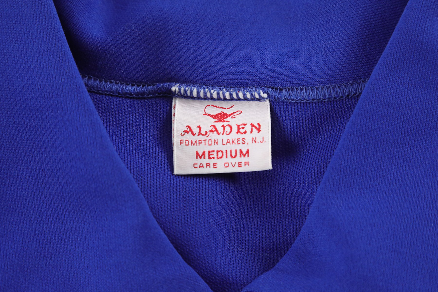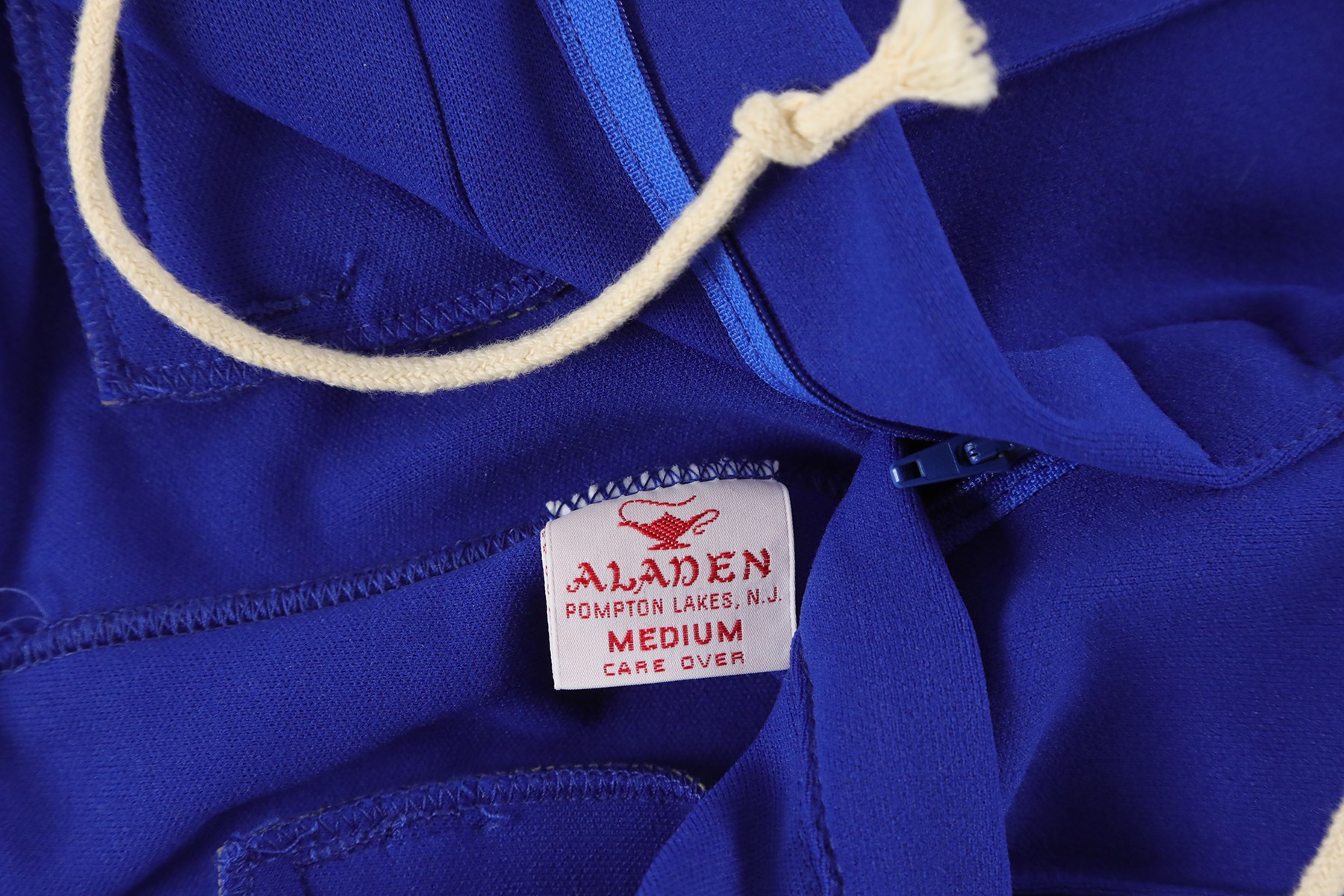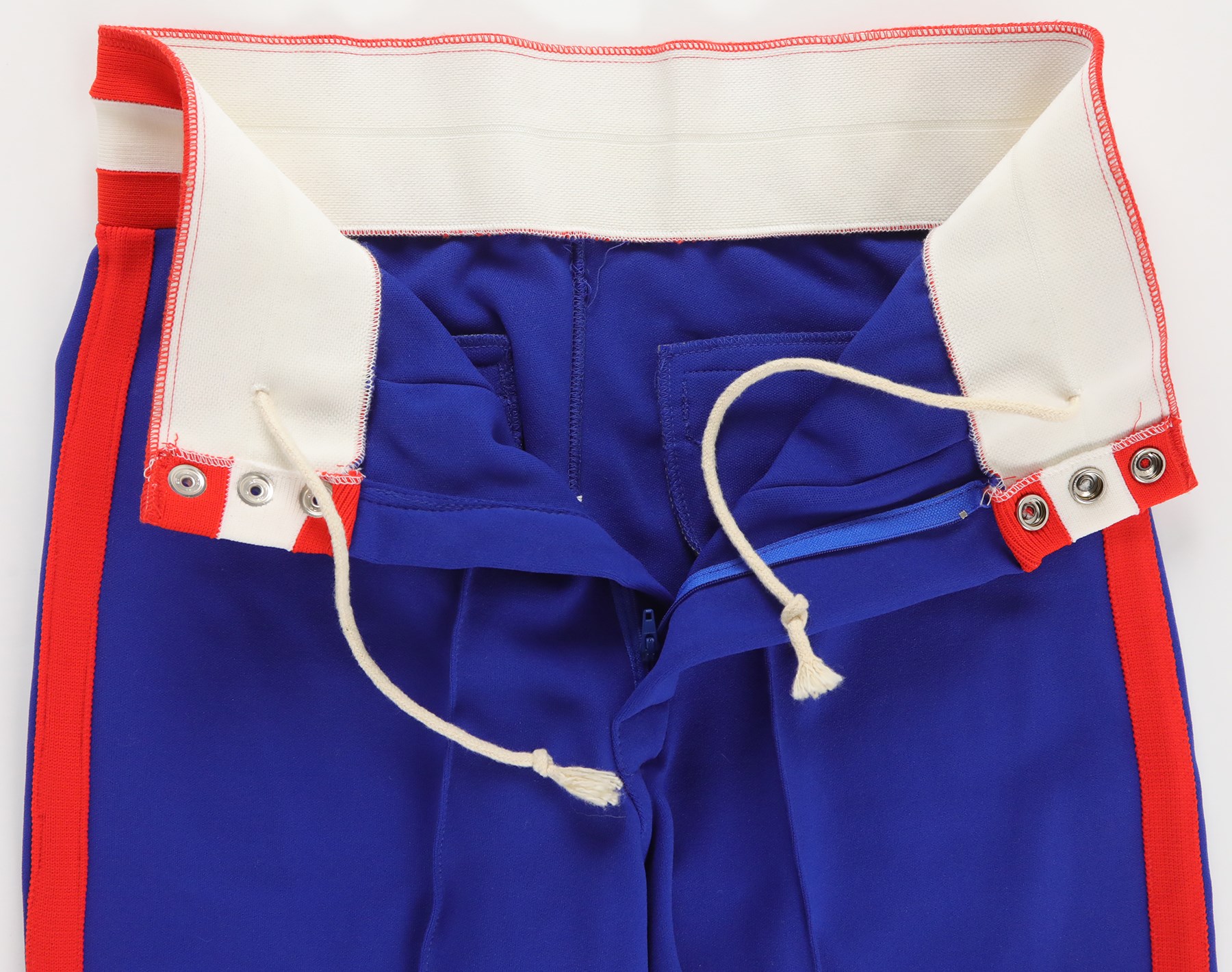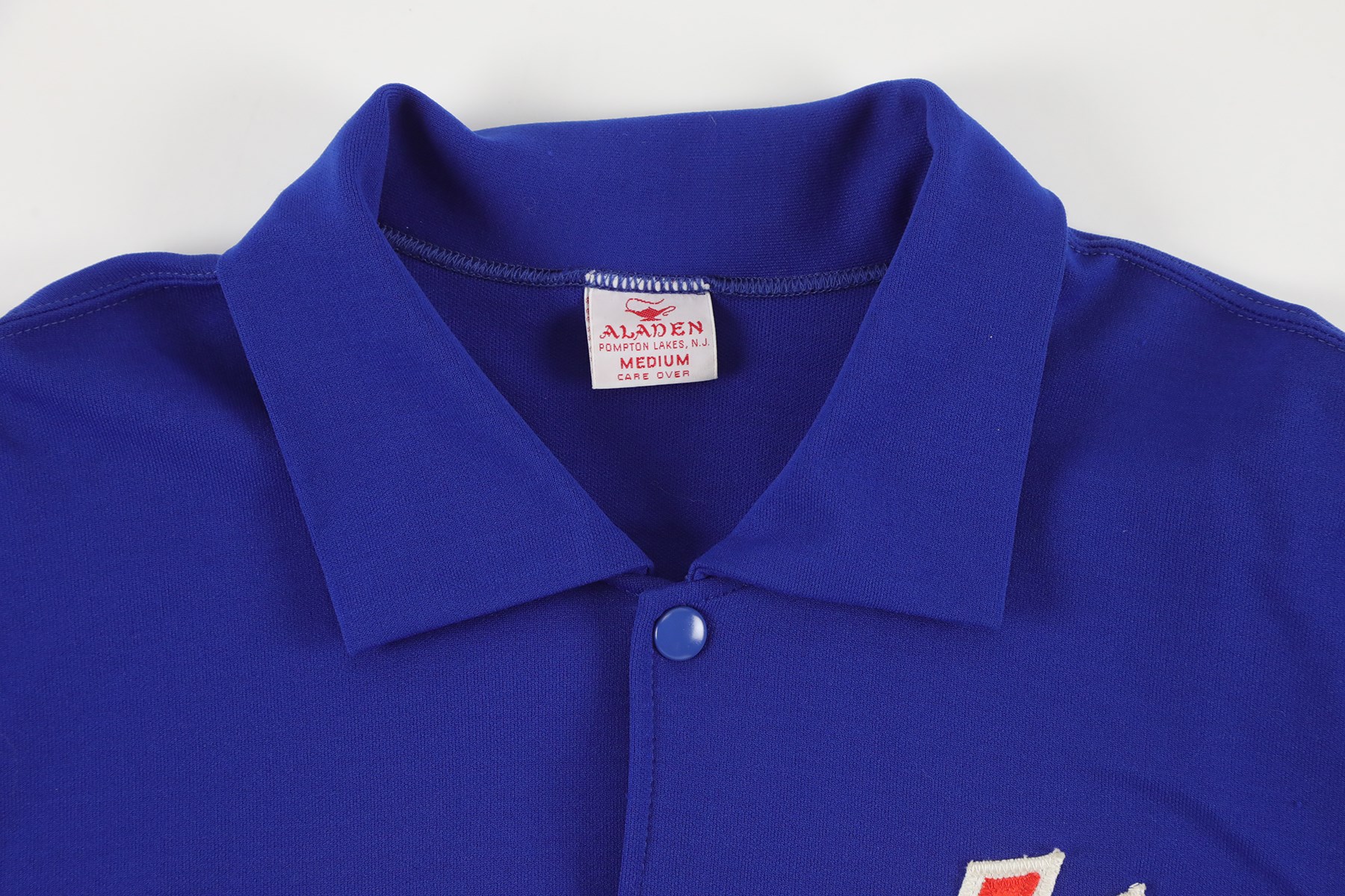 New York Mets warmup suit dating to the club's 1986 World Championship season. This warmup suit comes with the special provenance of originating from the Mets' general manager, Frank Cashen. Cashen obtained the suit for his son, Brian, and the garment is accompanied by a signed letter from Brian Cashen attesting to its provenance. The blue, button-down jacket is lettered "Mets" across the front in orange on white tackle twill. An "Aladen" label (size medium) appears in the collar. The matching pants, with orange-and-white trim along the waistband and a sold orange stripe down the side of each leg, also bears an "Aladen" manufacturer's tag (size medium) in the interior waistband. Both garments are original as issued and display light wear.