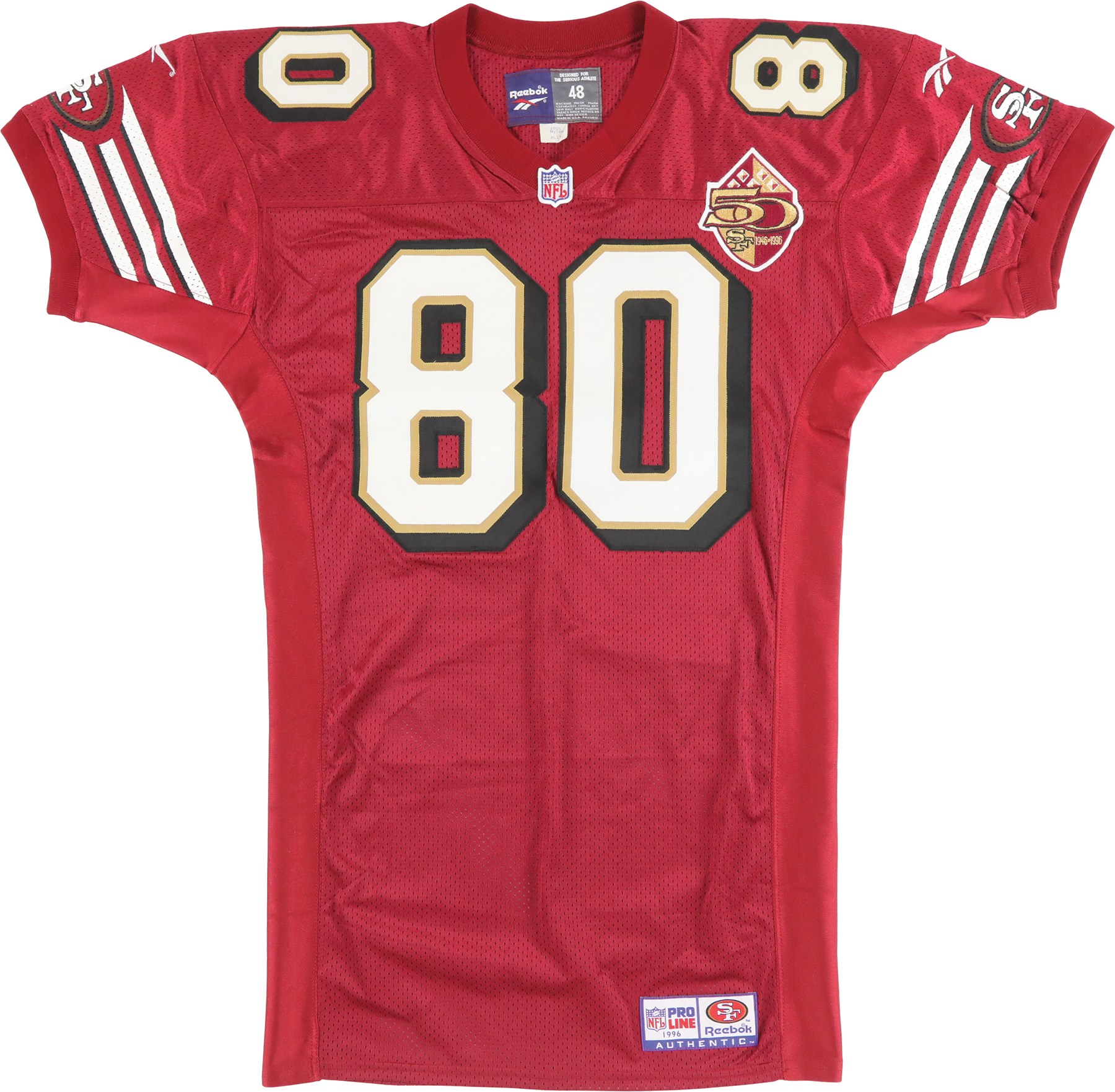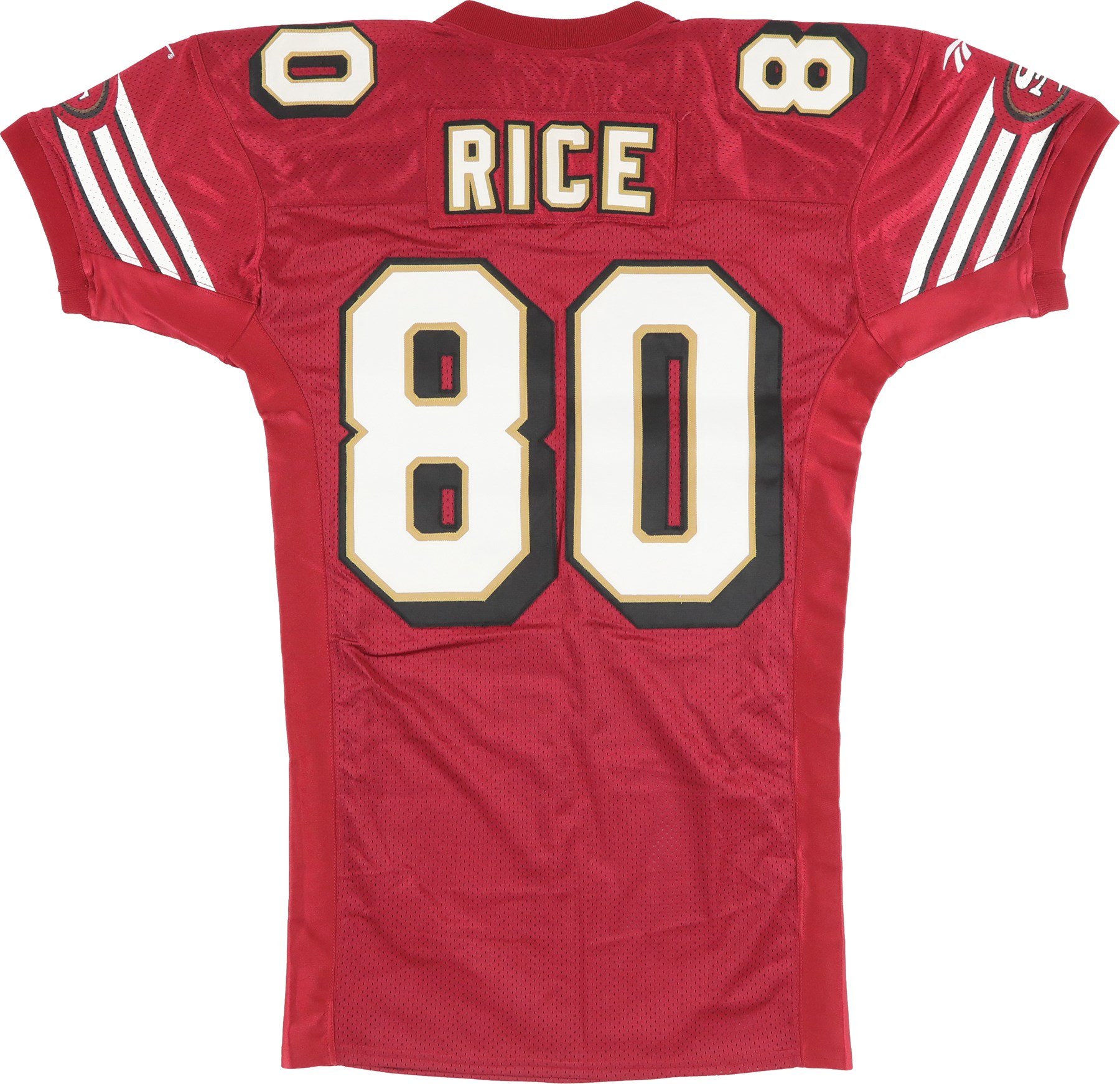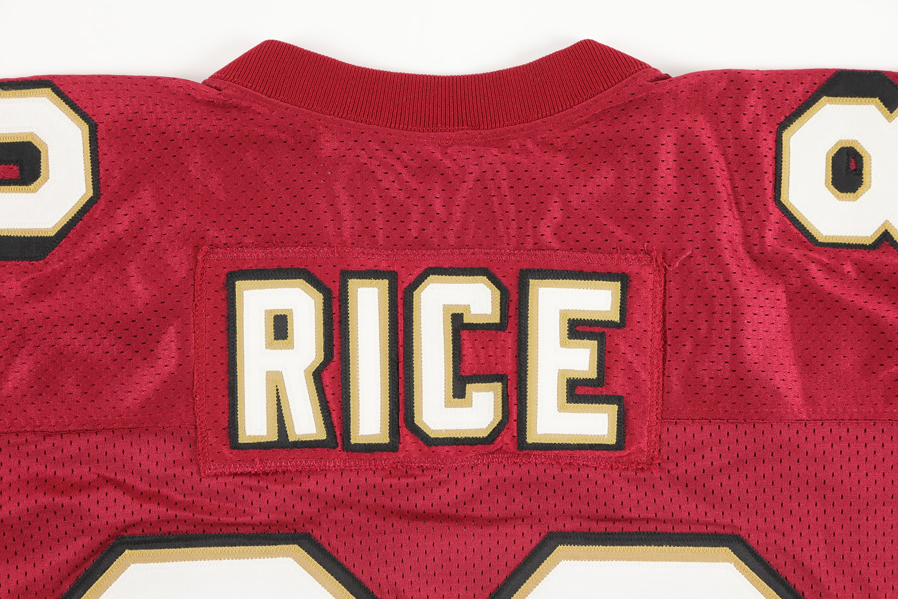 The red mesh jersey features the number "80" on the front, reverse, and each shoulder. "Rice" is lettered upon a red nameplate on the reverse, directly above the number. All letters and numerals are applied in tri-color white-on-gold-on-black tackle twill. Located in the collar are a "Reebok 48" label and white flag tag reading  "100% Nylon Blitz." An additional Reebok "SF Pro Line" label appears on the left front tail. The 49ers 50th anniversary patch adorns upper left breast. The jersey is original as issued and shows no use. Together with a letter of provenance from the consignor.