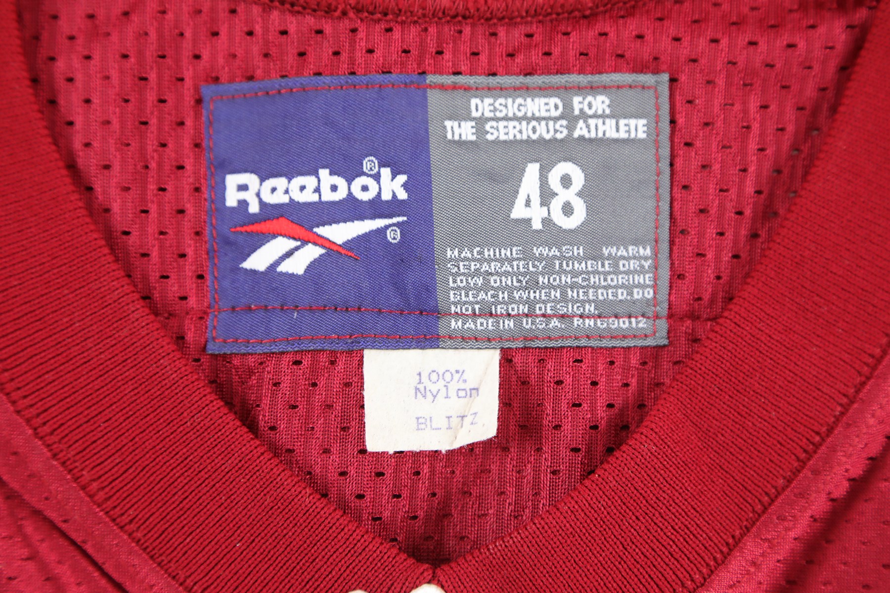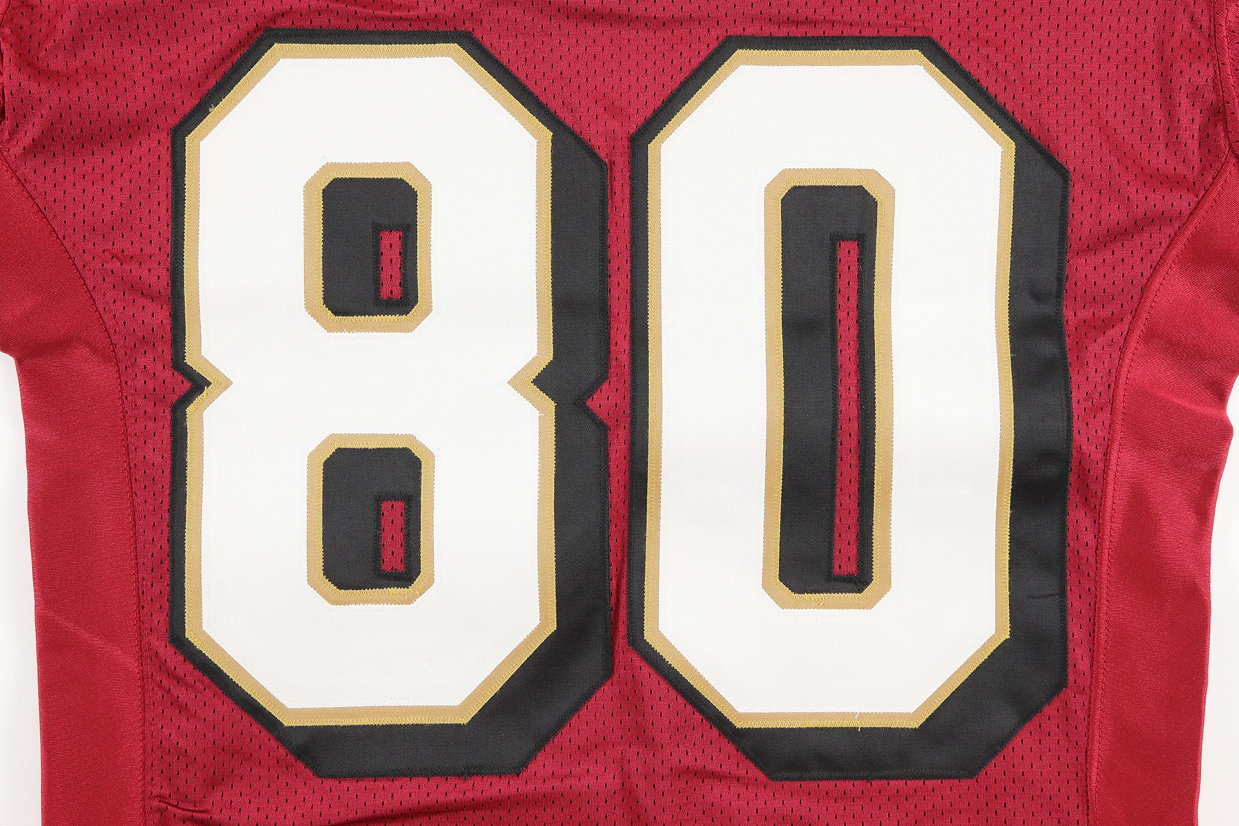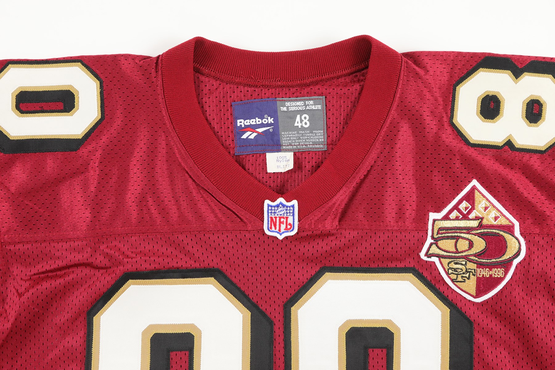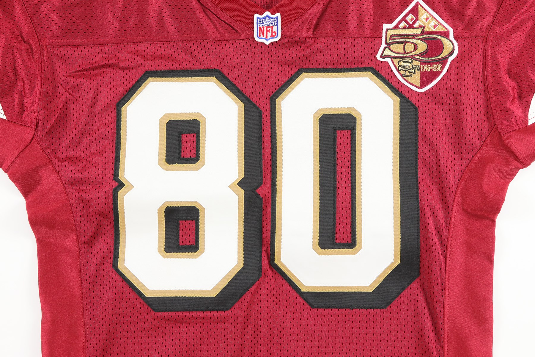 The red mesh jersey features the number "80" on the front, reverse, and each shoulder. "Rice" is lettered upon a red nameplate on the reverse, directly above the number. All letters and numerals are applied in tri-color white-on-gold-on-black tackle twill. Located in the collar are a "Reebok 48" label and white flag tag reading  "100% Nylon Blitz." An additional Reebok "SF Pro Line" label appears on the left front tail. The 49ers 50th anniversary patch adorns upper left breast. The jersey is original as issued and shows no use. Together with a letter of provenance from the consignor.