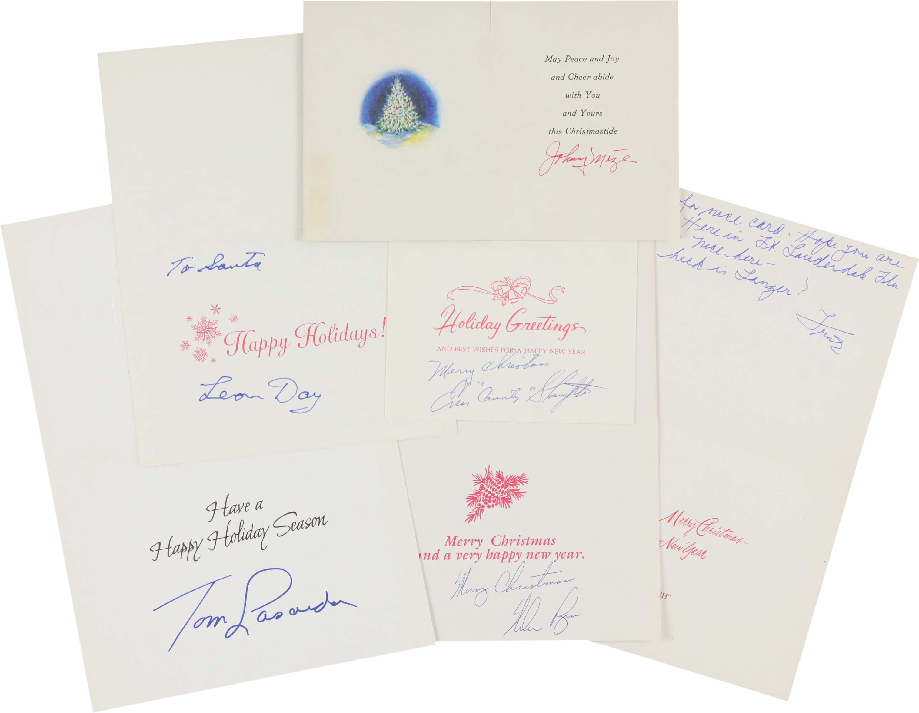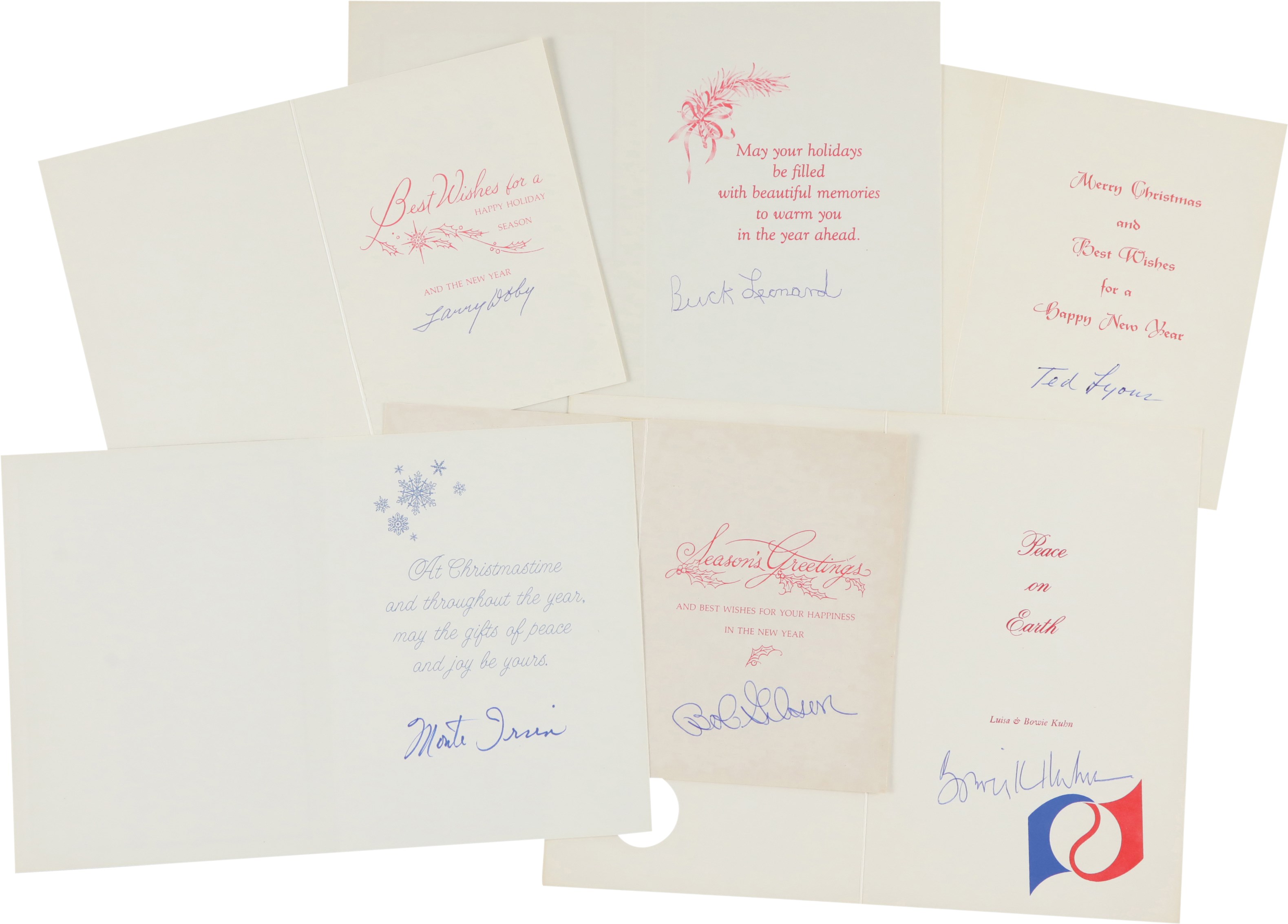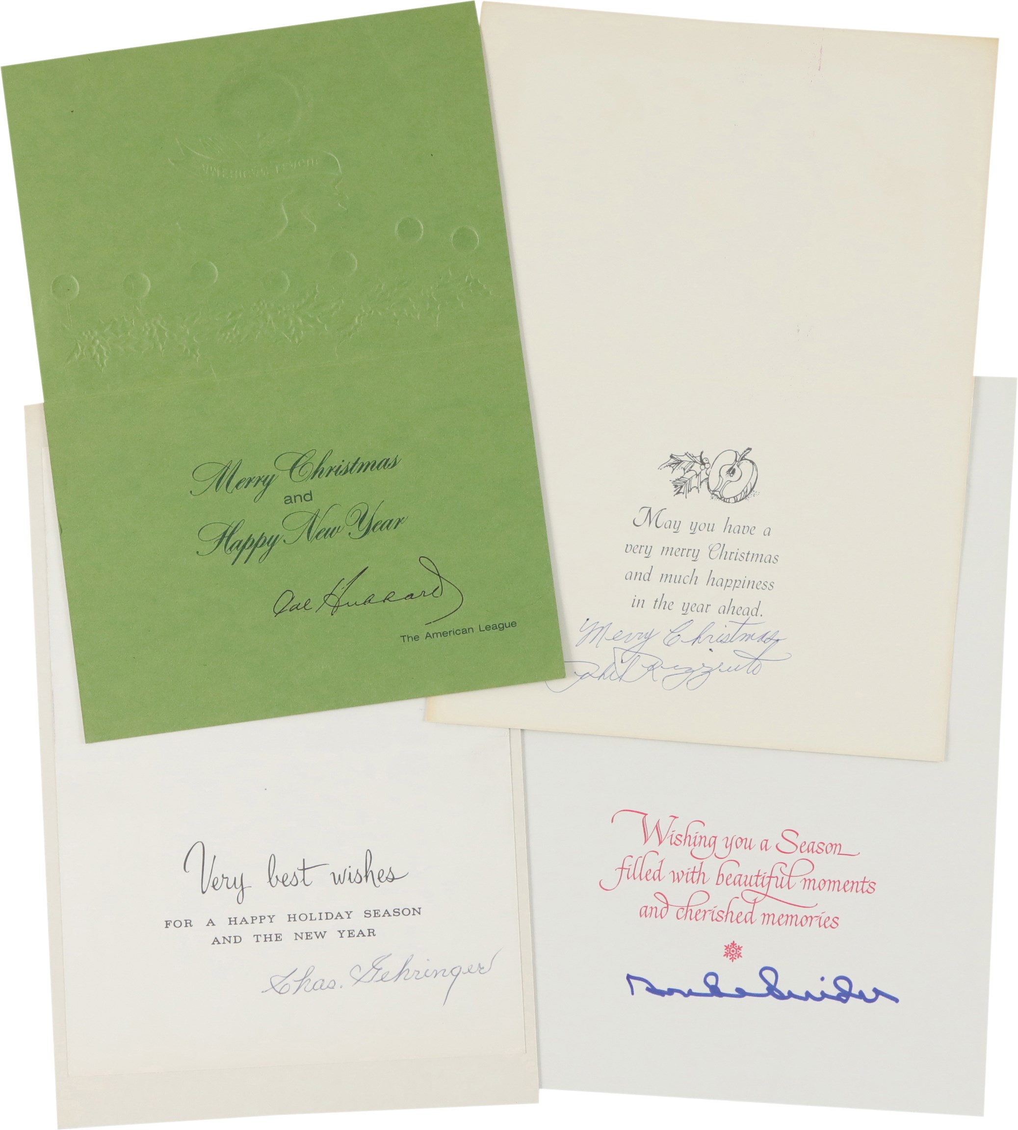 Collection of twenty Christmas cards, each individually signed by a different Hall of Fame player. It should be noted that signed Christmas cards by Major League players, especially Hall of Famers, are scarce. The twenty examples offered here, as well as several others in this auction, all originate from the same consignor, whose husband spent decades amassing one of the largest such collections we have ever seen. Unless otherwise noted, all the players have signed their full names. The players represented here are Buck Leonard, Joe Sewell (signed twice with a handwritten note), Phil Rizzuto, Charlie Gehringer, (card has been affixed to a slightly larger cardboard backing), Nolan Ryan, Ted Lyons, Bob Gibson, Larry Doby, Johnny Mize, Cal Hubbard, Leon Day, Duke Snider, Enos Slaughter, Yogi Berra, Tom Lasorda, Stan Musial, Bowie Kuhn, Monte Irvin, and Frank Frisch (signed simply "Frank," but with a handwritten note). The signatures, scripted in a variety of inks, average 9/10. The cards vary in size, but all are standard retail Christmas cards. In Excellent condition overall.