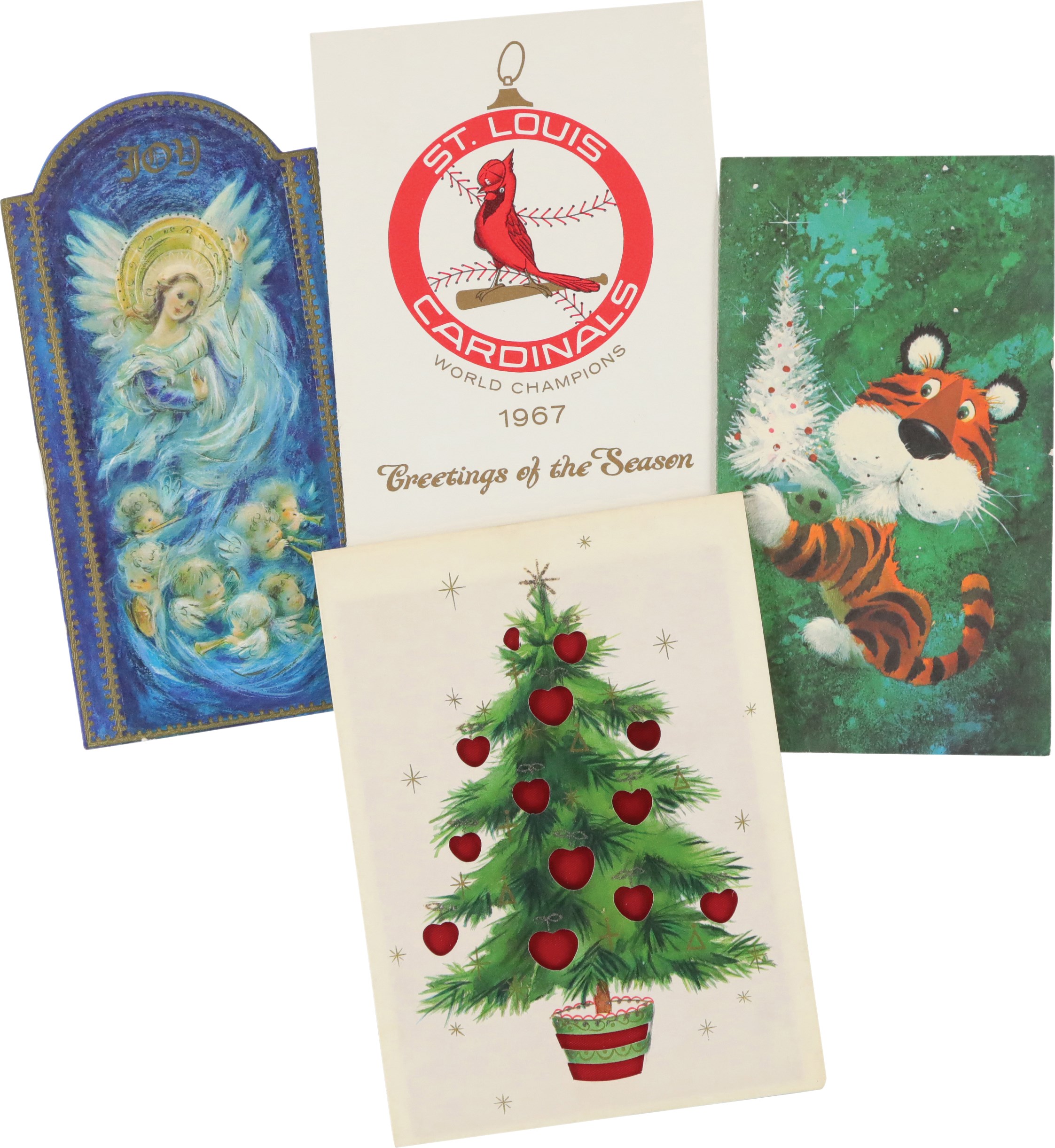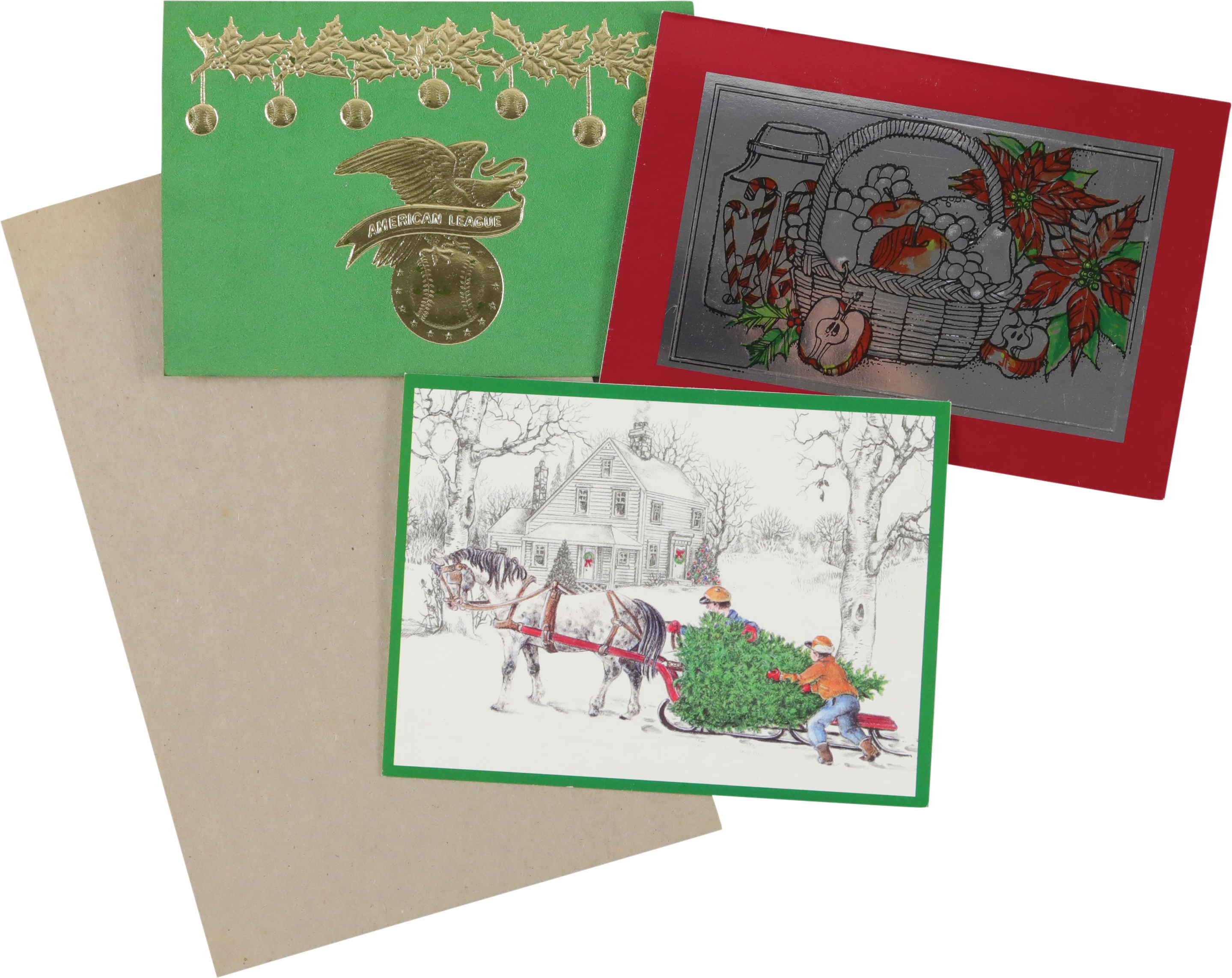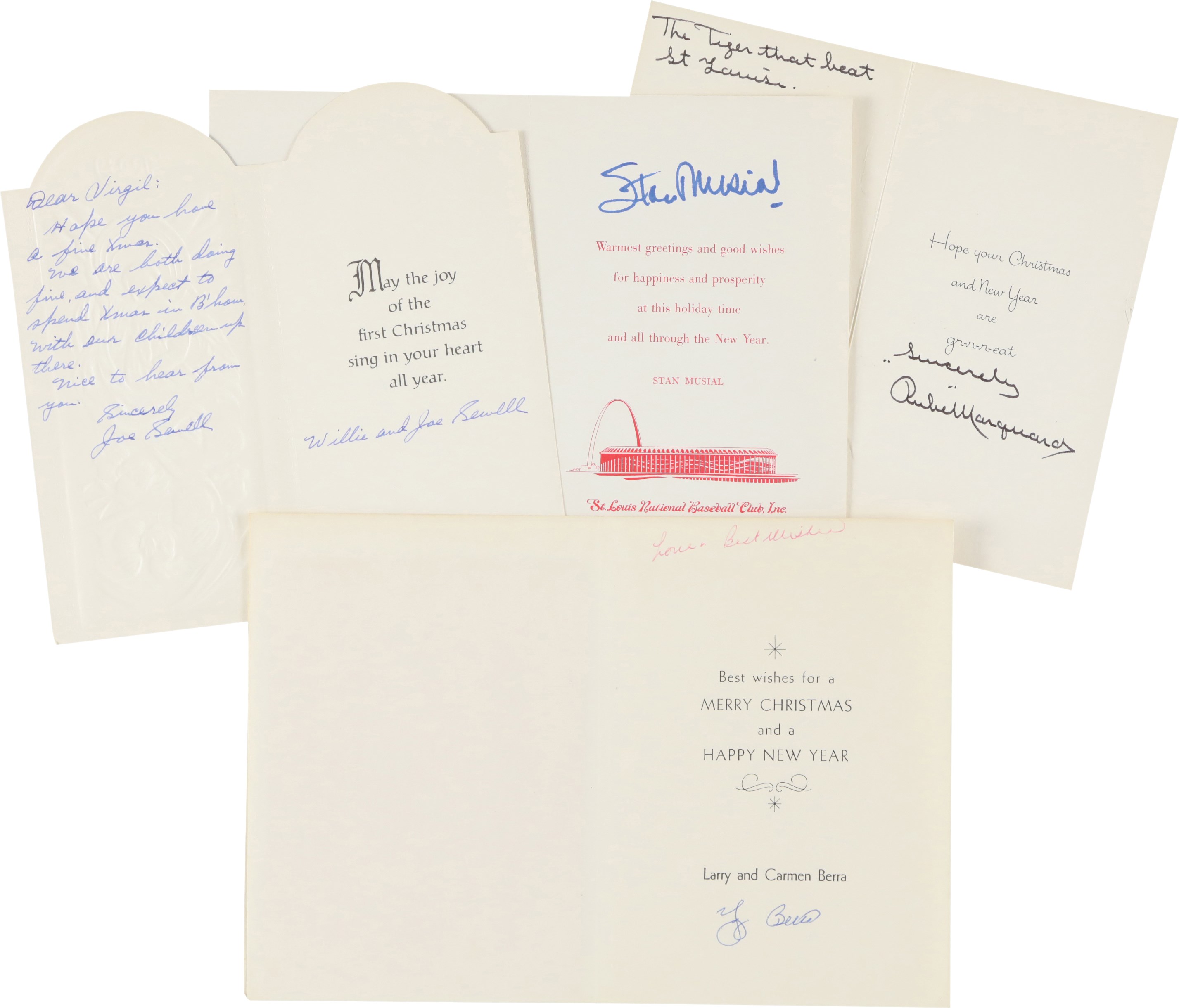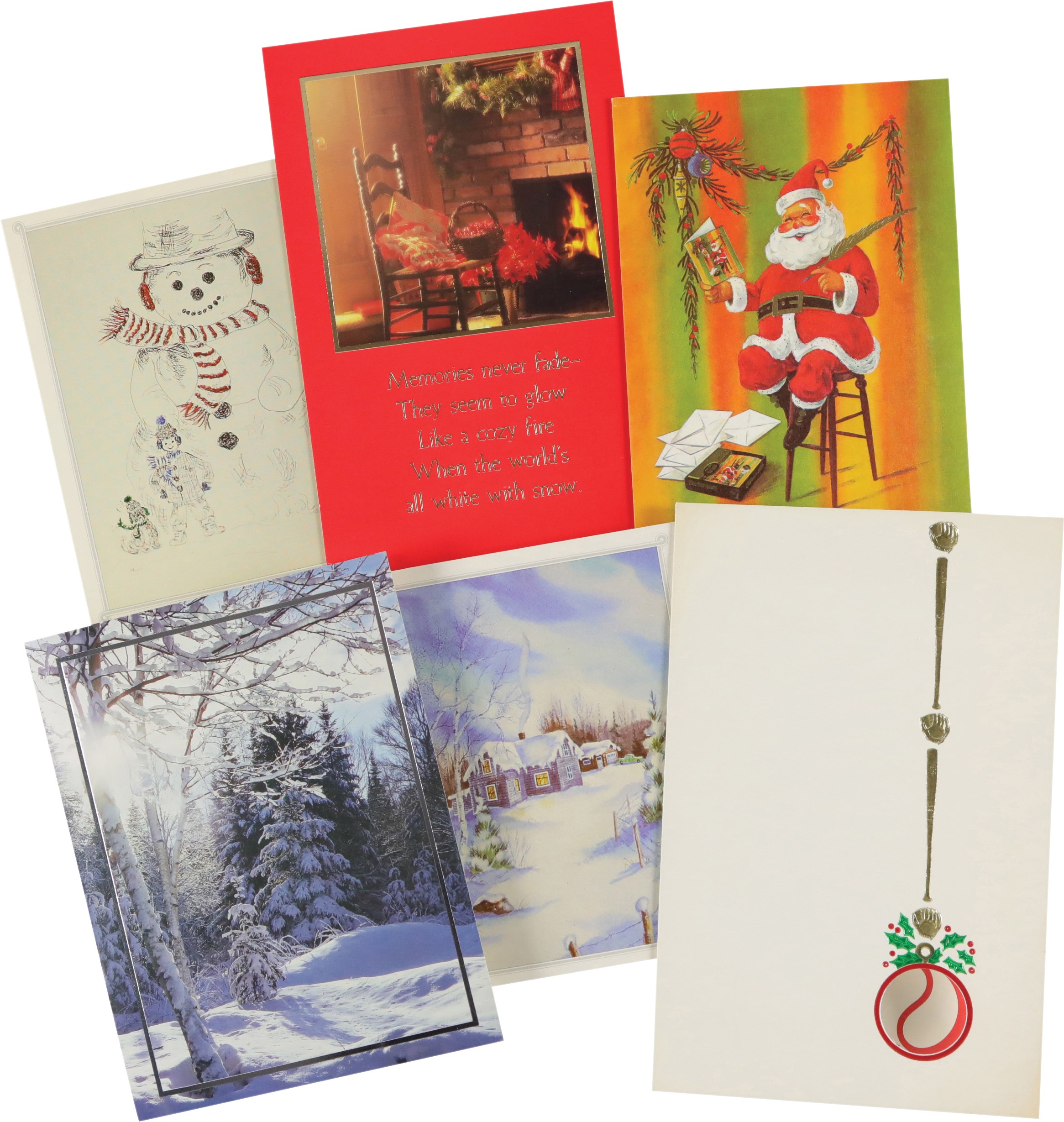 Collection of twenty Christmas cards, each individually signed by a different Hall of Fame player. It should be noted that signed Christmas cards by Major League players, especially Hall of Famers, are scarce. The twenty examples offered here, as well as several others in this auction, all originate from the same consignor, whose husband spent decades amassing one of the largest such collections we have ever seen. Unless otherwise noted, all the players have signed their full names. The players represented here are Buck Leonard, Joe Sewell (signed twice with a handwritten note), Phil Rizzuto, Charlie Gehringer, (card has been affixed to a slightly larger cardboard backing), Nolan Ryan, Ted Lyons, Bob Gibson, Larry Doby, Johnny Mize, Cal Hubbard, Leon Day, Duke Snider, Enos Slaughter, Yogi Berra, Tom Lasorda, Stan Musial, Bowie Kuhn, Monte Irvin, and Frank Frisch (signed simply "Frank," but with a handwritten note). The signatures, scripted in a variety of inks, average 9/10. The cards vary in size, but all are standard retail Christmas cards. In Excellent condition overall.
