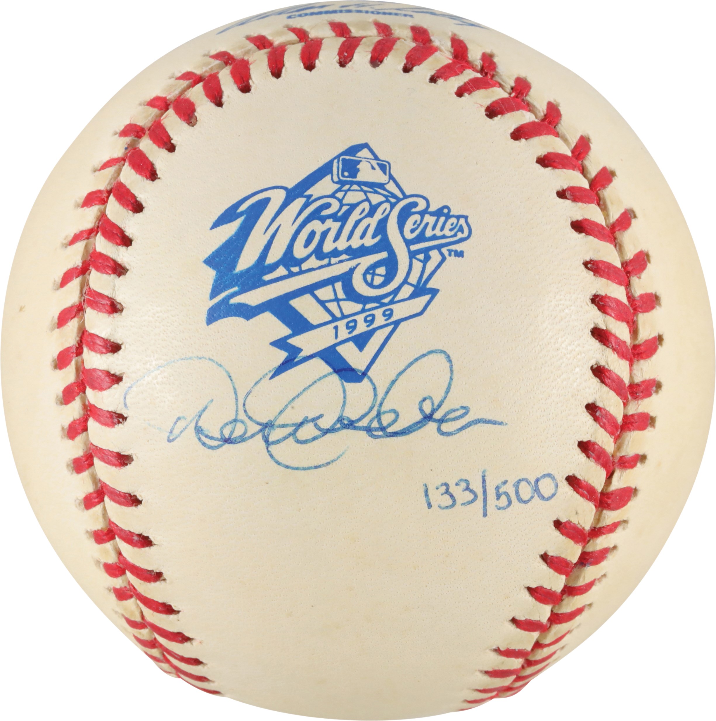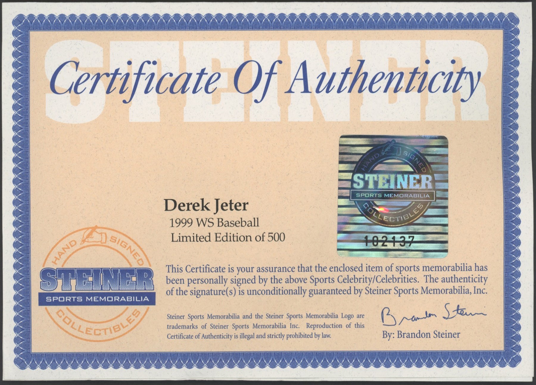 Presented is a near-mint condition 1999 World Series baseball that has been signed by Derek Jeter. Jeter signed the ball just below the '99 World Series logo. This is a limited edition (Steiner Sports) baseball, and "133/500" is written under Jeter's signature. A Steiner sticker is stuck to the ball, and a corresponding LOA is included. In the 1999 World Series, Jeter helped the Yankees sweep the Braves to capture the title. Jeter won five World Series titles during his 20-year Major League career, and was inducted into the National Baseball Hall of Fame in 2020.