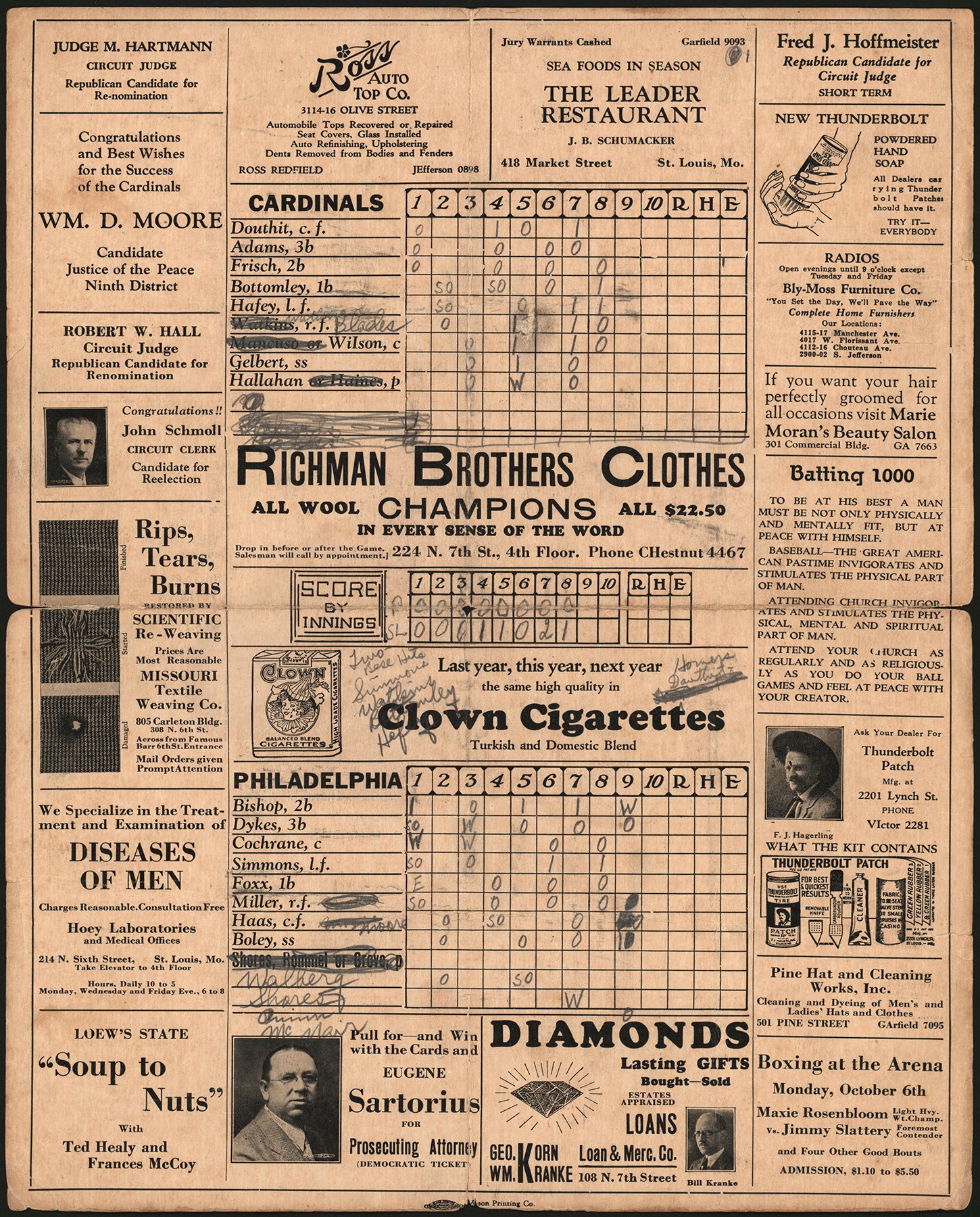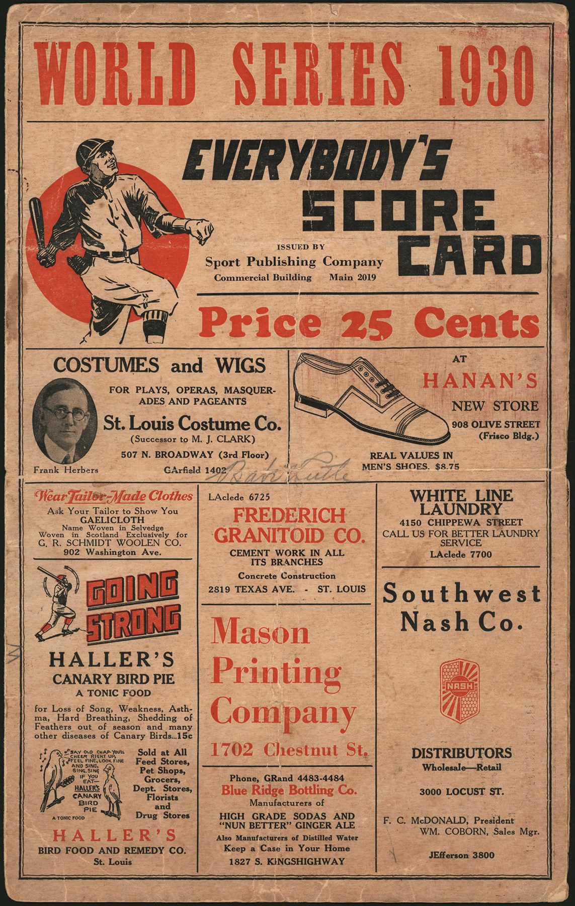 1930 World Series scorecard signed by Babe Ruth. Ruth signed the front of this "WORLD SERIES 1930" scorecard in pencil. The scorecard is 7.125x11.25" and is in fair condition. The front of the scorecard features an illustration of a baseball player swinging the bat. Several vintage advertisements are present on the front, inside, and back of the scorecard. Starting lineups of the St. Louis Cardinals and Philadelphia Athletics are printed inside the scorecard. The owner wrote the game stats on the scorecard in pencil. Full LOA from PSA.