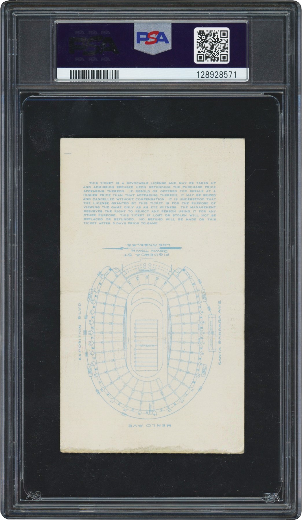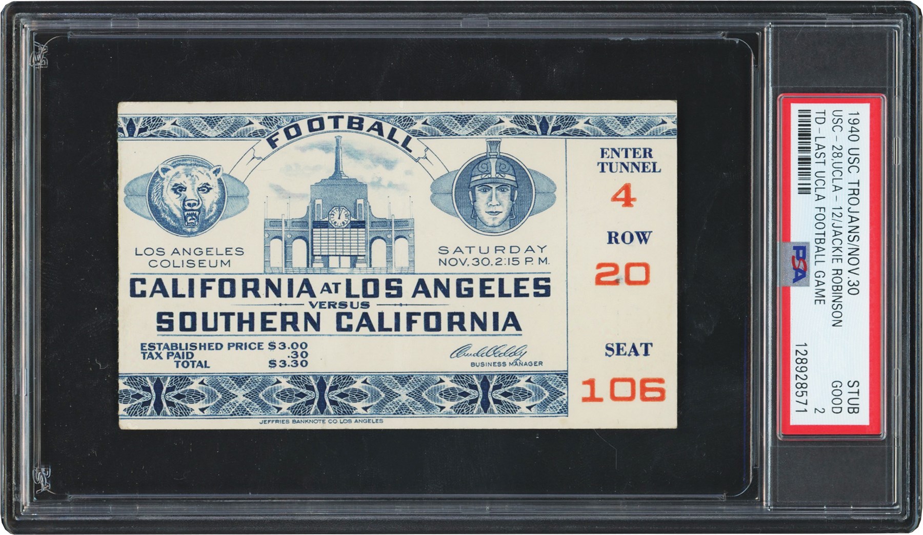 A ticket from Jackie Robinson's final college football game. The ticket offered here is from the November 30, 1940 game between the USC Trojans and UCLA Bruins at the Los Angeles Coliseum. Robinson was a star on the UCLA football team. He played baseball for the Bruins too, but he was better known for football than baseball at the time. Robinson scored a touchdown in his final college football game, and USC won the game 28 to 12. The ticket measures 4.375x2.5" and is graded (GOOD 2) and encapsulated by PSA.