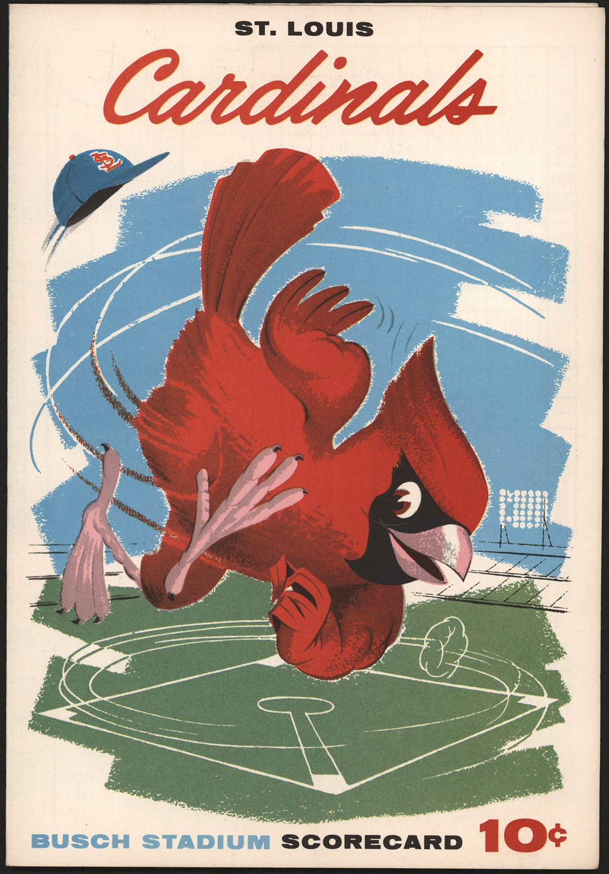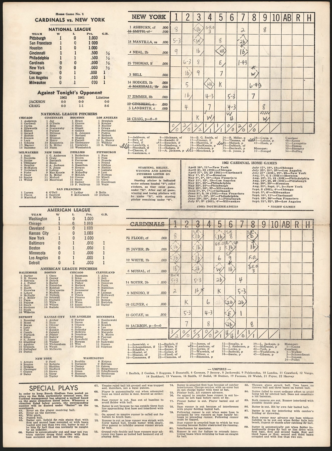 Displayed is a 1962 scorecard from the inaugural game in the history of the New York Mets', fully scored, on April 12th, against the St. Louis Cardinals at Busch Stadium I. The Mets' first game was scheduled to have been played on April 11th at St. Louis, but the game was rained out. The '62 Mets were an expansion team that brought National League baseball back to New York City after the departure of the Brooklyn Dodgers and the New York Giants to California after the 1957 season. Although the '62 Mets had many famous players, most of the them were past their prime and were chosen for crowd appeal. The team finished in last place in the NL, with only a 40-120-1 record, at that point the most Major League losses in modern times. Despite the team's inept play, fans eagerly supported the Mets in that 1962 campaign. The Mets' aficionados were ecstatic to have National League ball back in New York, and they cheered on the Mets despite the squad's many losses.
