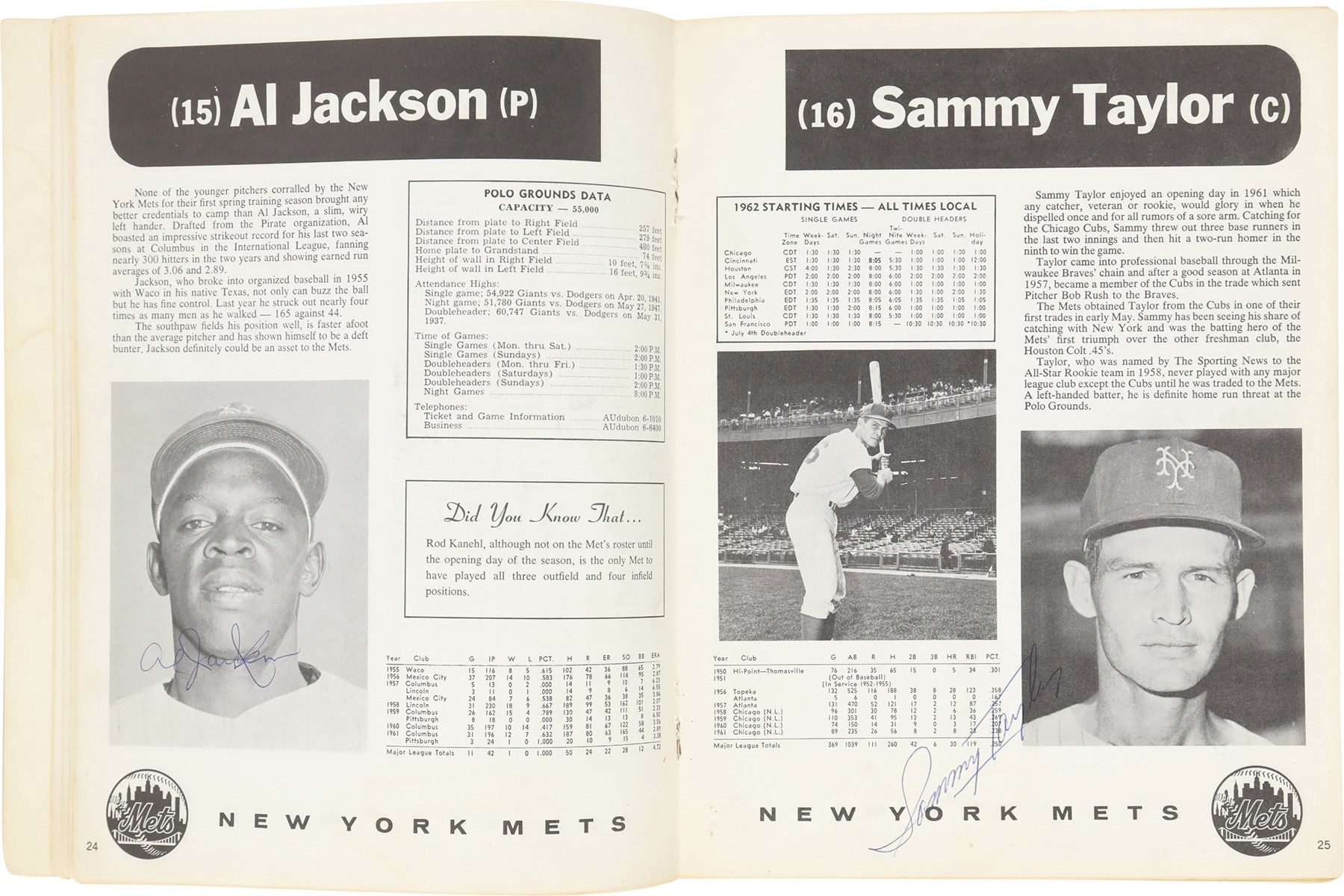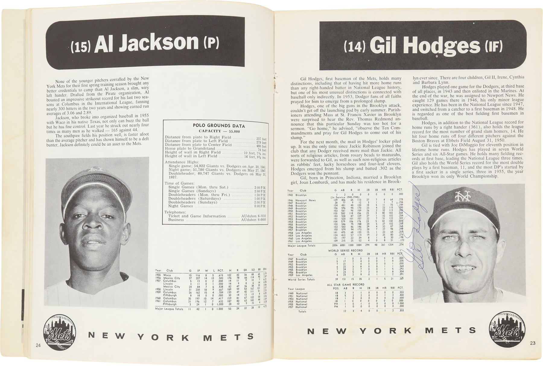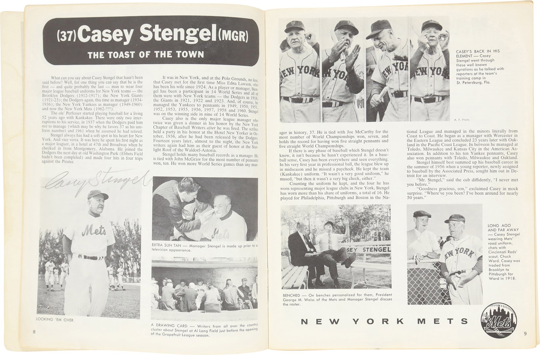 1962 New York Mets inaugural season signed yearbook with over 40 autographs. Hall of Famers Casey Stengel, Richie Ashburn, and Gil Hodges signed the inside of this 48 page yearbook. Stengel and Hodges signed their bio pages, and Ashburn signed a page with a photo of Flushing Meadows Stadium. Ashburn also signed the cover of the yearbook, along with  Don Zimmer, Clem Labine, Galen Cisco, Cookie Lavagetto, Felix Mantilla, Cliff Cook, Jay Hook, Craig Anderson, Roger Craig, Gene Woodling, Sammy Taylor, and others. The yearbook is in very good condition. Includes a full LOA from JSA.