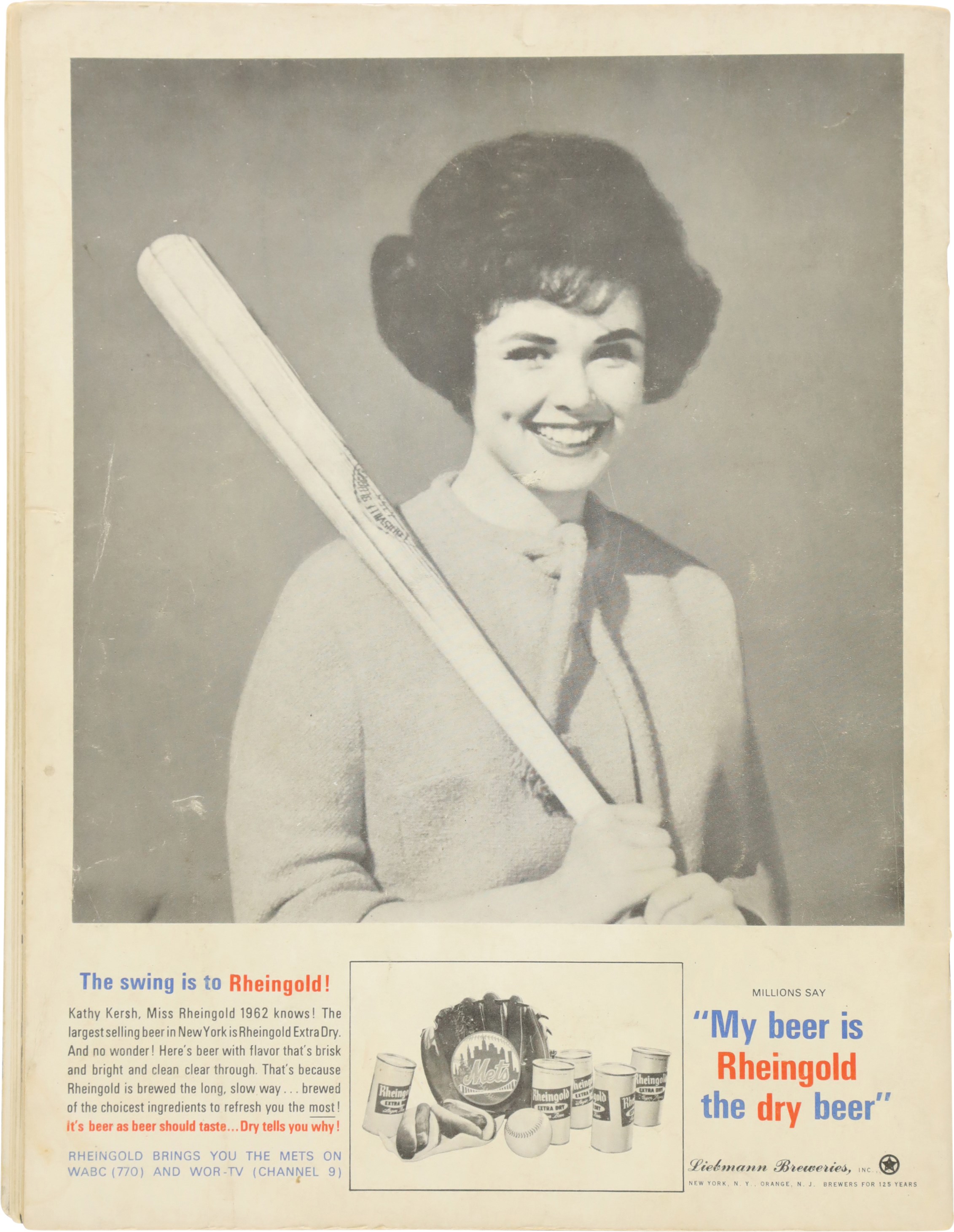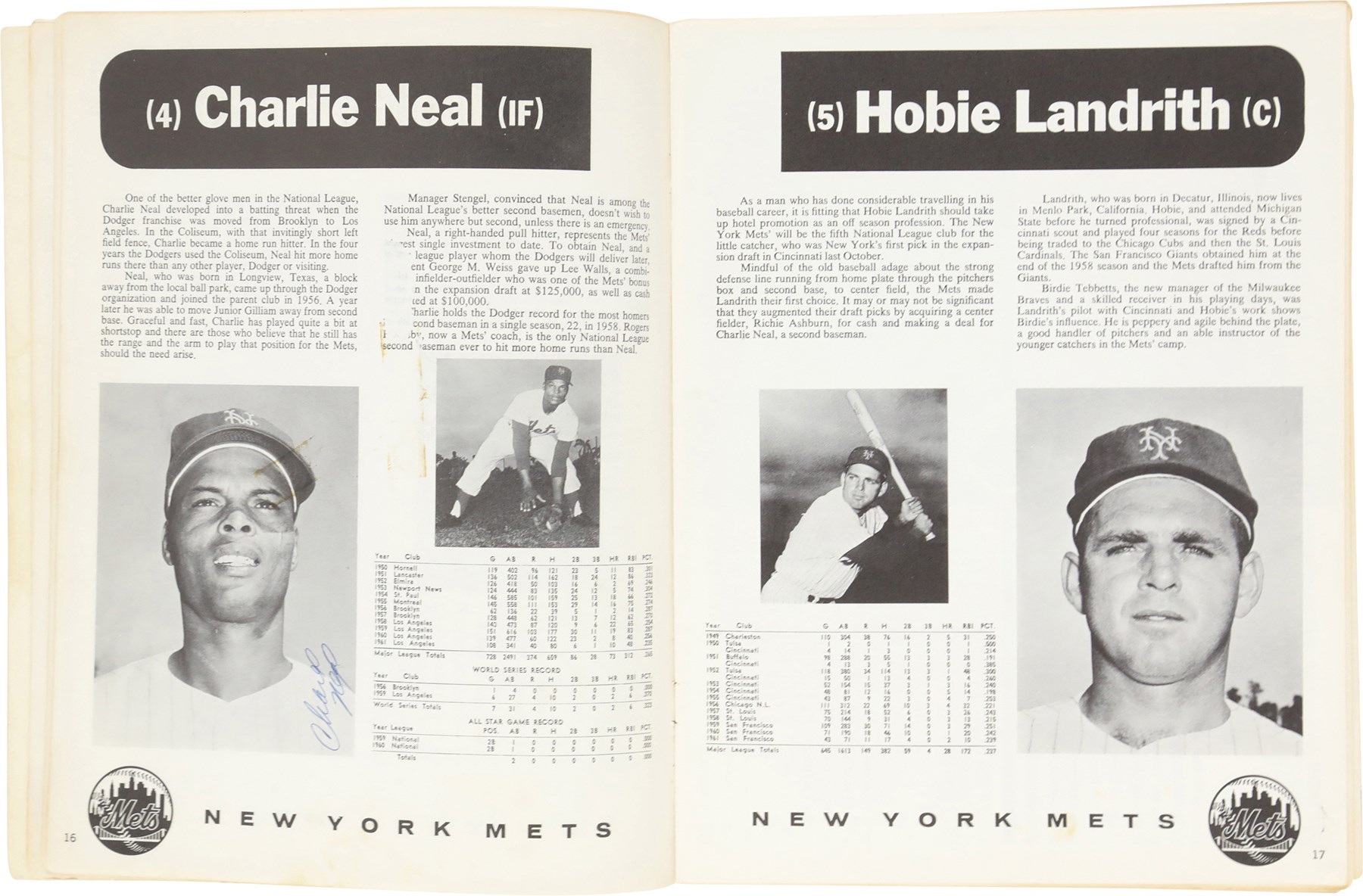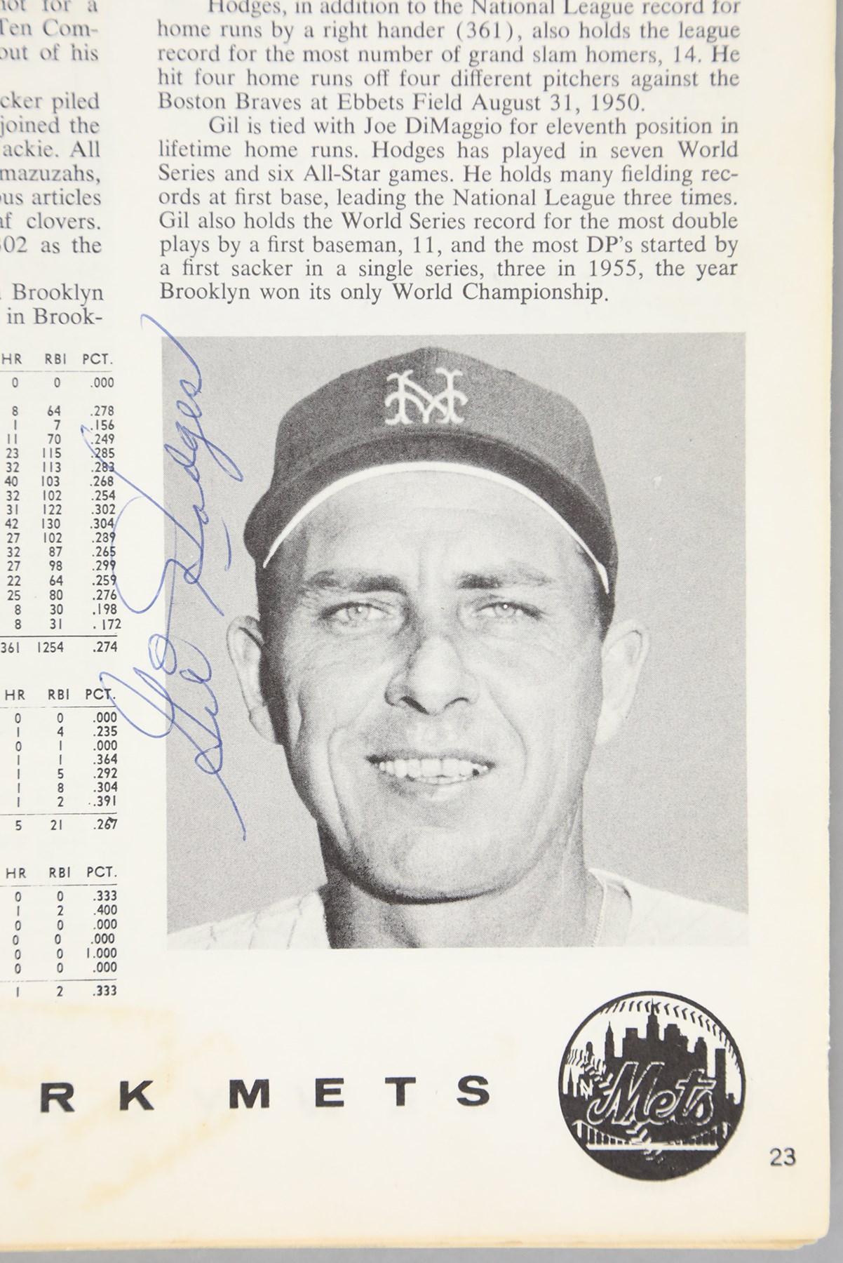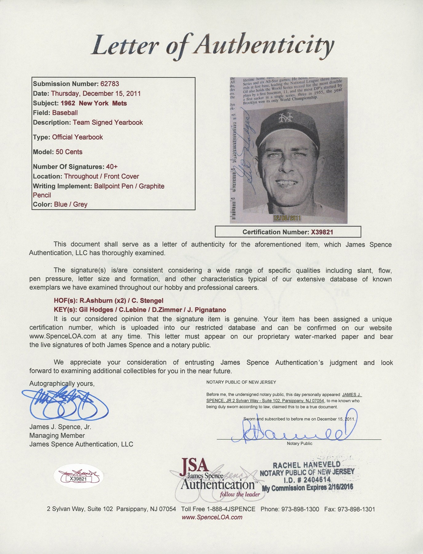 1962 New York Mets inaugural season signed yearbook with over 40 autographs. Hall of Famers Casey Stengel, Richie Ashburn, and Gil Hodges signed the inside of this 48 page yearbook. Stengel and Hodges signed their bio pages, and Ashburn signed a page with a photo of Flushing Meadows Stadium. Ashburn also signed the cover of the yearbook, along with  Don Zimmer, Clem Labine, Galen Cisco, Cookie Lavagetto, Felix Mantilla, Cliff Cook, Jay Hook, Craig Anderson, Roger Craig, Gene Woodling, Sammy Taylor, and others. The yearbook is in very good condition. Includes a full LOA from JSA.