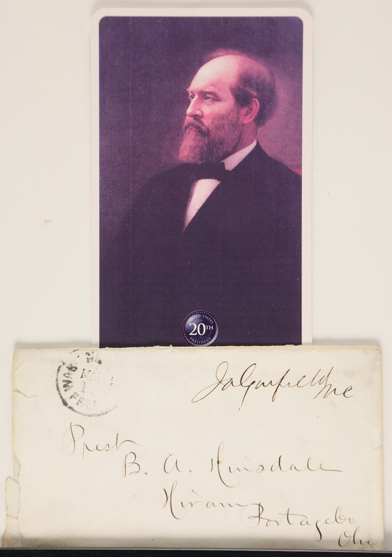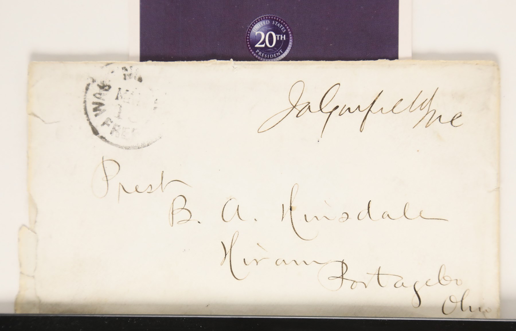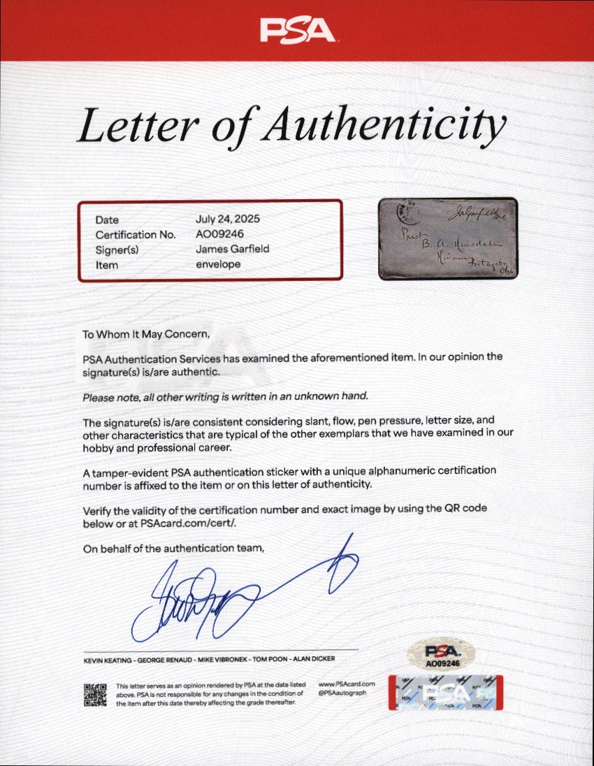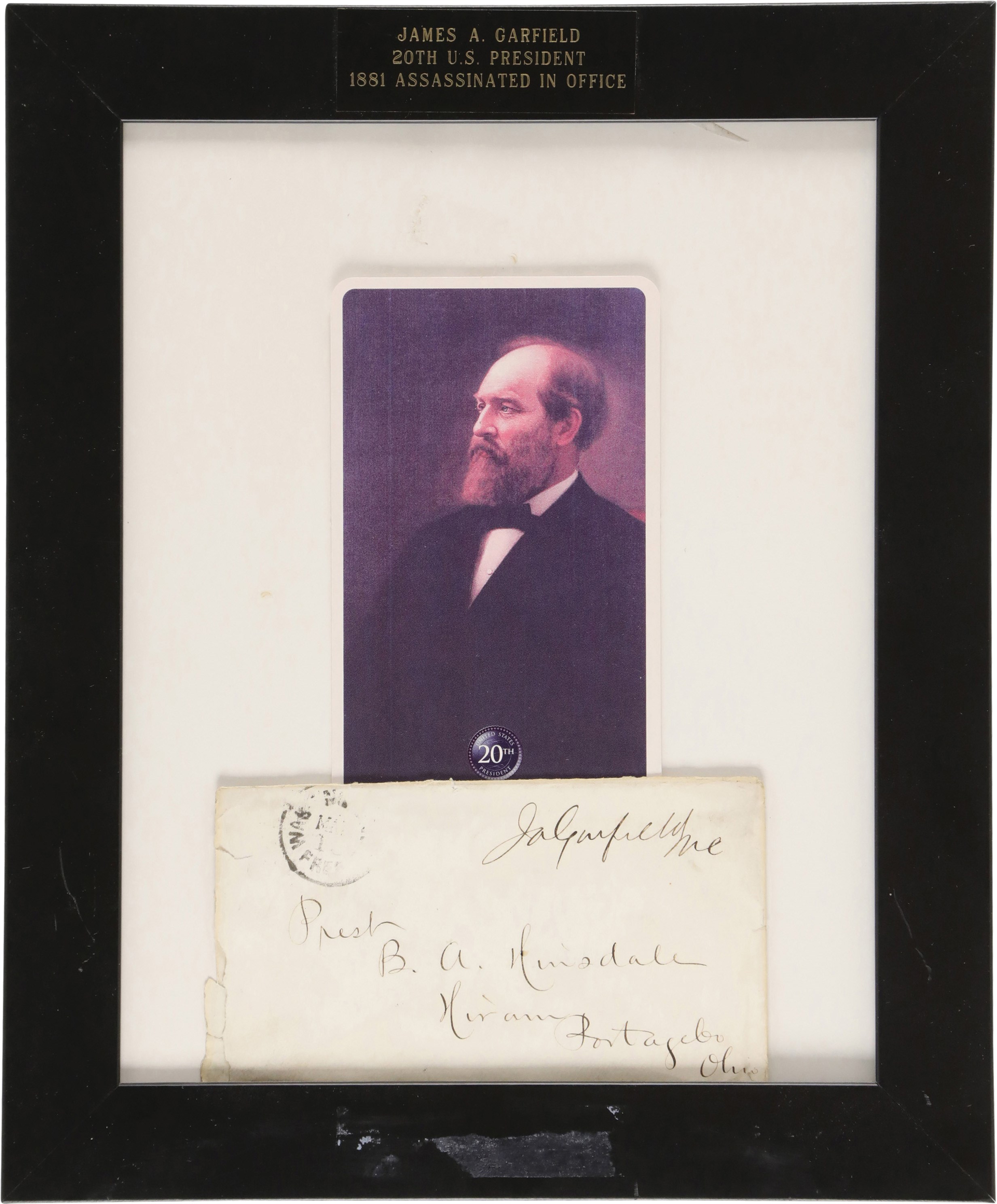 James A. Garfield signed display piece. Included in this 9.75x11.75" black frame is an envelope, signed by Garfield, and a commemorative card of the 20th U.S. President. Attached to the top of the frame is a nameplate that reads, "James A. Garfield, 20th U.S. President, 1881 Assassinated in Office." Garfield signed the 5.5x3" envelope in black ink. The card above the envelope measures 3.25x5". The frame opening is 7.5x9.5" and there is no glass present with the frame.