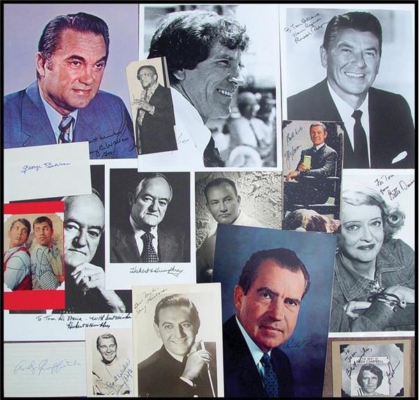 Whether you’re looking to fill the gaps in your collection of ink or just getting your collection started this deep and diverse lot is the one for you. Includes: 1979 New York Times with inscription by Richard Nixon ( VG+) , 5x7" promo photo of a young Jimmy Dorsey, inscibed with autograph, index cards signed by the following, Alfred Hitchcock (with a self portrait), Katherine Hepburn, Carol Burnett (2), Glen Campbell (5), Andy Griffith (4), Bob Hope (2), George Burns (4), Jonny Carson, Jerry Lewis and many more. Twenty three, mostly 8x10" photos autographed by important politicians includes, Ronald Reagan, Richard Nixon, George Wallace, Herbert Humphrey, Walter Mondale, Bob Dole, Geroge McGovern and many others. Also includes letters from some of the politicians. Twelve autographed photos, including Lucille Ball and Bette Davis. Overall condition is EX-MT.