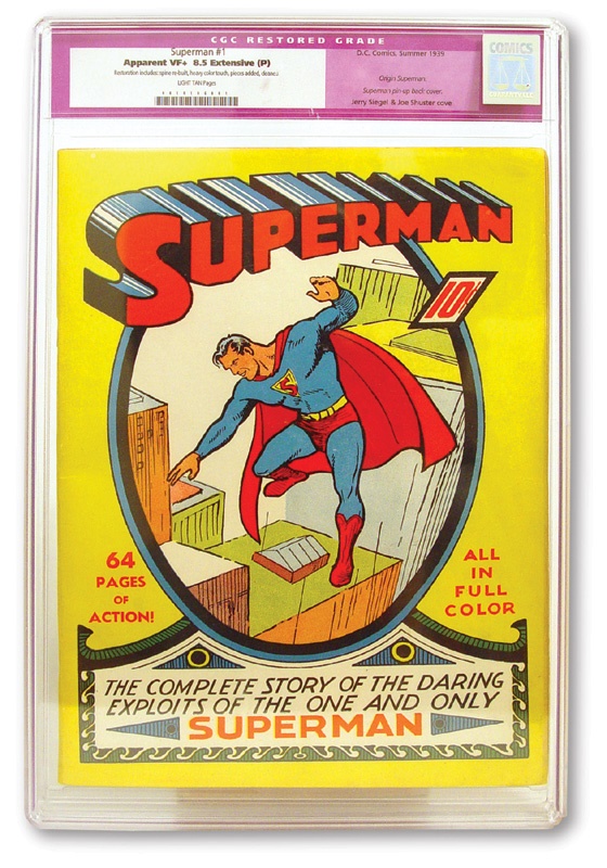 A meeting of the minds between script writer Jerry Siegel and designer Joe Shuster back in 1933 marked the birth of DC Comics, as we know it today, and the Man of Steel. Superman became an immediate success, capturing the attention and imaginations of an entire generation. He is a rare comic character who has enjoyed prolonged popularity, sustained over the course of 70 years! Since then Superman has been the inspiration for books, TV shows, movies, and countless other multi-media projects. Amazing first ever issue of the most tenacious comic superhero of all time. DC Comics, summer of 1939. Jerry Siegel & Joe Shuster cover features our hero leaping tall buildings. Don’t forget, Superman did not fly in the first few issues, but rather, he leaped. CGC restored grade is Apparent VF+ 8.5 Extensive (P). Restoration includes spine re-built, heavy color touch, pieces added & cleaned. Pages are a light tan color. Awesome Superman pin-up on the back cover.