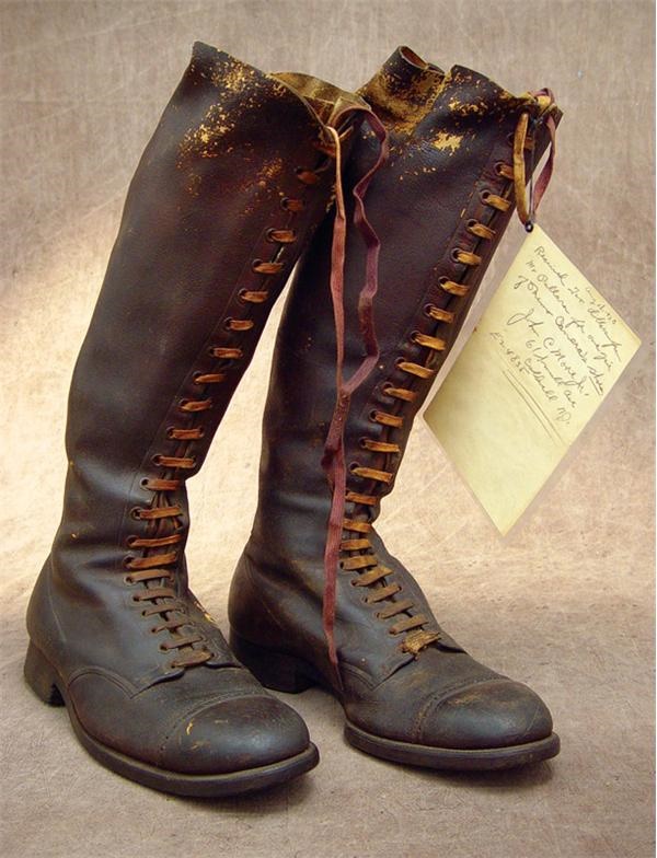 These mammoth brown leather boots once covered two of the largest feet ever attached to a human being. The huge physical specimen, known as Primo Carnera was the largest boxer of all time, standing 6'6" tall at 260 pounds. But it was his feet that were the cause of so much talk, the unsurpassed girth of which measured 5" each! These momentous boots were required to be manufactured by hand, due to their abnormal size. With original laces, they measure 21" to the tops. "Florscheim" label still attached to the inside tongue of the right boot. Exhibit good use and wear. You really won't be able to appreciate their sheer size until you see them in person. Included is newspaper articles which show Carnera wearing the boots.