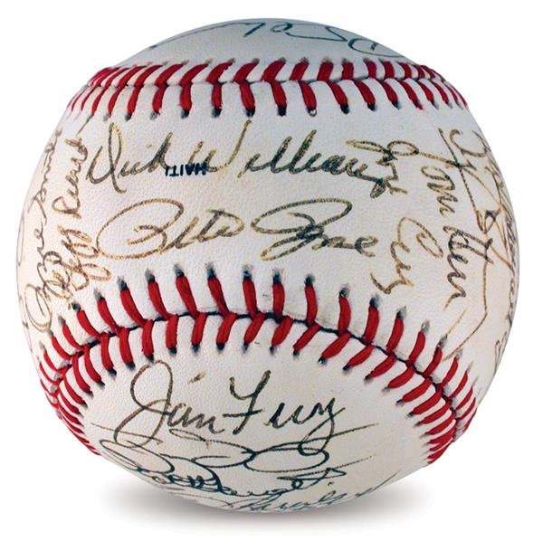 From the last All-Star Game appearance of Pete Rose's career, the season after which he retired with 4,256 hits, this NRMT Official 1985 All-Star Game baseball is beautifully signed in gold ballpoint by 30 NL All Stars including Rose (sweet spot), Ozzie Smith, Koufax, & Feller. Signatures are NRMT.