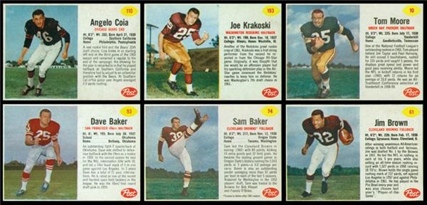 Post Cereal's only U.S. football issue. Players who were pictured on boxes of the less-popular cereals are tougher to find: #10 Moore (EX), 74 Sam Baker (EX), 93 Dave Baker (VG), 110 Coia (VG-EX), and 193 Krakoski (VG). Stars include: #29 Tittle (EX), 61 Jimmy Brown (EX), etc. Set is complete at 200 cards. Averages VG to VG-EX with EX examples throughout the set.