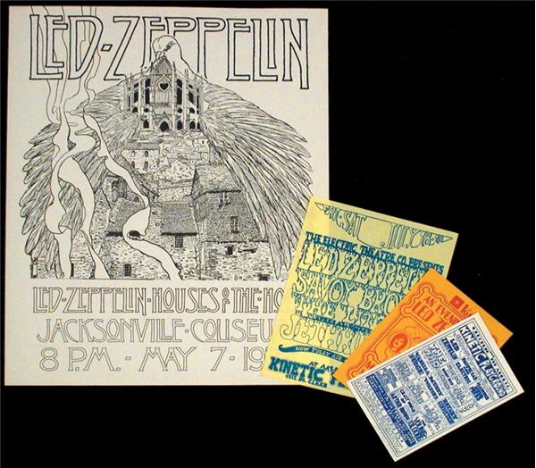 A marvelous investment. Eleven striking, black on white Zep posters (17.5”x22”) from their 1973 Jacksonville Coliseum appearance. All are in EX-MT condition. Also three vibrantly colored handbills of varying size and design, two coming from the legendary Kinetic Playground. EX-MT.