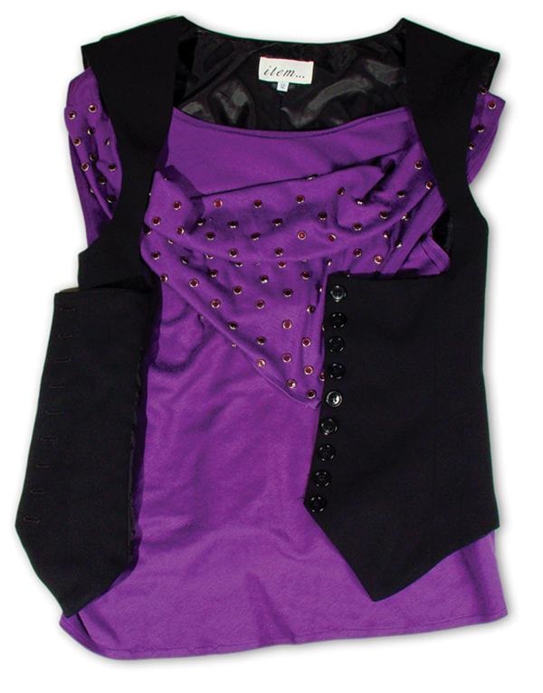 Stage worn garments straight from the closet of Gene Simmons.1) Purple cotton tank top decorated with matching rhinestones. 2) Nine button black polyester vest. Tagging in vest collar is from "Item" with [size] "12" flag tag. 3) Black nylon tights with sparkling rhinestones in star designs fill the legs. 4) Black leather belt with studs and silver discs. 5) Eighteen pairs of black or blue "Capezio" tights, the foundation of all of their outrageous costumes. All of the pieces herein are from the collection of Gene Simmons and KISS and were obtained directly from them for the Greg Manning KISS auction.