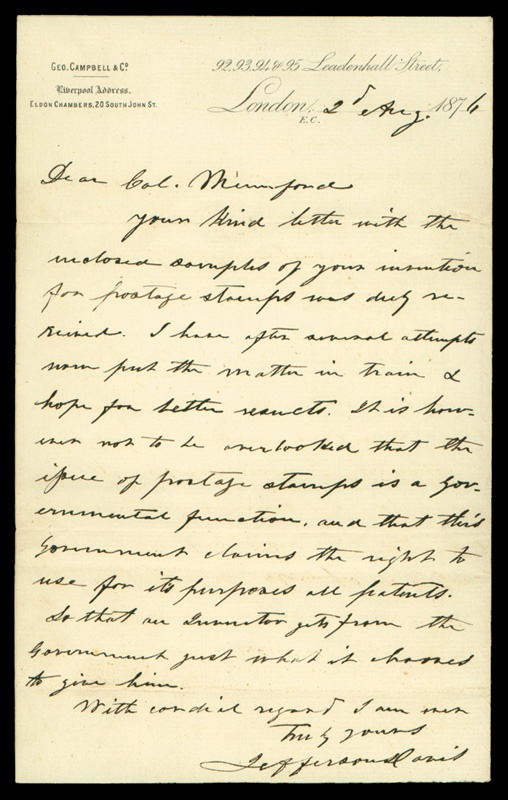 Penned just a few short weeks, 2nd August 1876, after our nation’s centennial anniversary during his stay in London. On “Geo. Campbell & Co.” letterhead Davis thanks an unknown Colonel for his “kind letter with the enclosed samples of your invention for postage stamps”. Jefferson continues on, “the issue of postage stamps is a governmental function, and that this government claims the right to use for its purposes all patents.” All ink is bold and black with a very fresh look. The signature itself is an 8/10. The EX letterhead has a light tone that only adds to its charm. Original mailing folds. A splendid crossover piece for the philatellic and autograph collector.