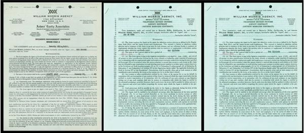 They were the sultans of slapstick and the original Kings of Comedy. Three contracts from the William Morris Agency, each in EX condition or better, signed individually by Larry Fine in blue ink (8/10) on December 2-1959, Moe Howard in blue ink (9/10) on March 29-1963, and Joe De Rita December 2-1959. A true piece of T.V. land treasure.