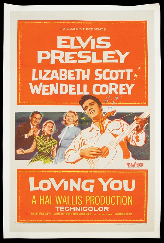 Small town country boy gets discovered by big city agent… you know the rest. One-sheet linen backed poster from Elvis’ second feature film beams with radiant color. EX-MT with few flaws except for the original mailing folds. Released in 1957 by Paramount Pictures and co-starring Lizabeth Scott and Wendell Corey