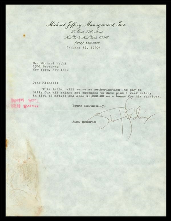 Typed letter dated January 15, 1970 on "Michael Jeffery Management, Inc." letterhead is signed nicely by the left-handed genius known as "Jimi". "Dear Michael: This letter will serve as authorization to pay to Billy Cox all salary and expenses to date plus 1 week salary in lieu of notice and also $1,000.00 as a bonus for his services. Yours faithfully, Jimi Hendrix." 8.5x11" paper is VG-EX. Slight burn marks on left side of paper does not intrude on content or signature. Red ink writing on verso is slightly bled through (also not touching content or signature).