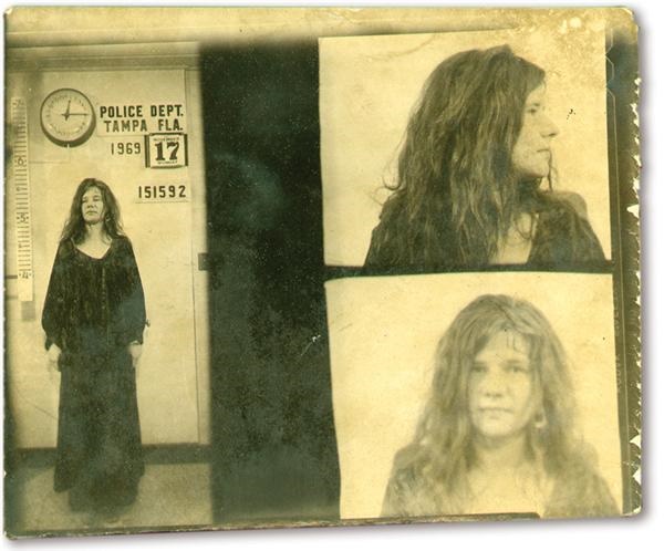 Dubious photo proves that Janis was not only a rock and roll icon, but also a social icon. In an incident that occurred during her Nov. 16, 1969 performance at Curtis Hixon Hall in Tampa, Florida, Joplin "peppered" the police with obscenities while they tried to control an unruly crowd, reportedly telling the police, "don't f--- with these people", among other things. She was very quietly arrested by Tampa Police after the show. Mugshot shows a displeased Janis Joplin in full body shot with the time, day and year visible by way of a clock and calendar on the wall behind her. Bust and profile shots to the right. Comes with the newspaper article from the Tampa Tribune printed the following day, regarding the incident. Photo is VG-EX.