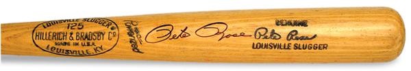 Banished from baseball for his indiscretions, Charlie Hustle will always be remembered for never giving less than 100% on the playing field.  A sweet offering from the man who broke Ty Cobb's lifetime record in hits and games played.  Used around the time he collected his second straight batting title, this Hillerich & Bradsby S222 bears the marks of a gamer, ready for use, although exhibiting only light use with some nicks and marks on the barrel.  Handle shows some pine tar residue.  "14" written in black marker on both ends.  Perfect black signature on the barrel is vintage ink, obtained in person at the time this bat was retired.