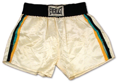 On December 11, 1981 Muhammad Ali fought his last fight as a professional against Trevor Berbick in the Bahamas.  Ali, a mere shadow of the boxer he once was, lost the 10-round decision to the up-and-coming Berbick.  It was a sad ending to a great career.  Being the last fight of his storied career and because it took place on foreign soil, souvenirs and mementos from this event are quite scarce.  Presented here are trunks which were originally intended to be worn by Muhammad Ali in this, his last fight.  Ali opted for a different pair and these were used in training for the fight.  The trunks are an actual match to the robe worn by Ali into the ring.  Beautiful white satin with black, green, & gold trim made by Everlast.  The trunks have been marked "Ali" inside in black marker.  The trunks do exhibit wear, but are perfectly intact.  The trunks came from the collection of Ali's assistant trainer and long-time cornerman, Wali Muhammad, who has provided his personal LOA.  Craig Hamilton of JO Sports, Inc. who researched the item expressly for Lelands auction has also provided an LOA.